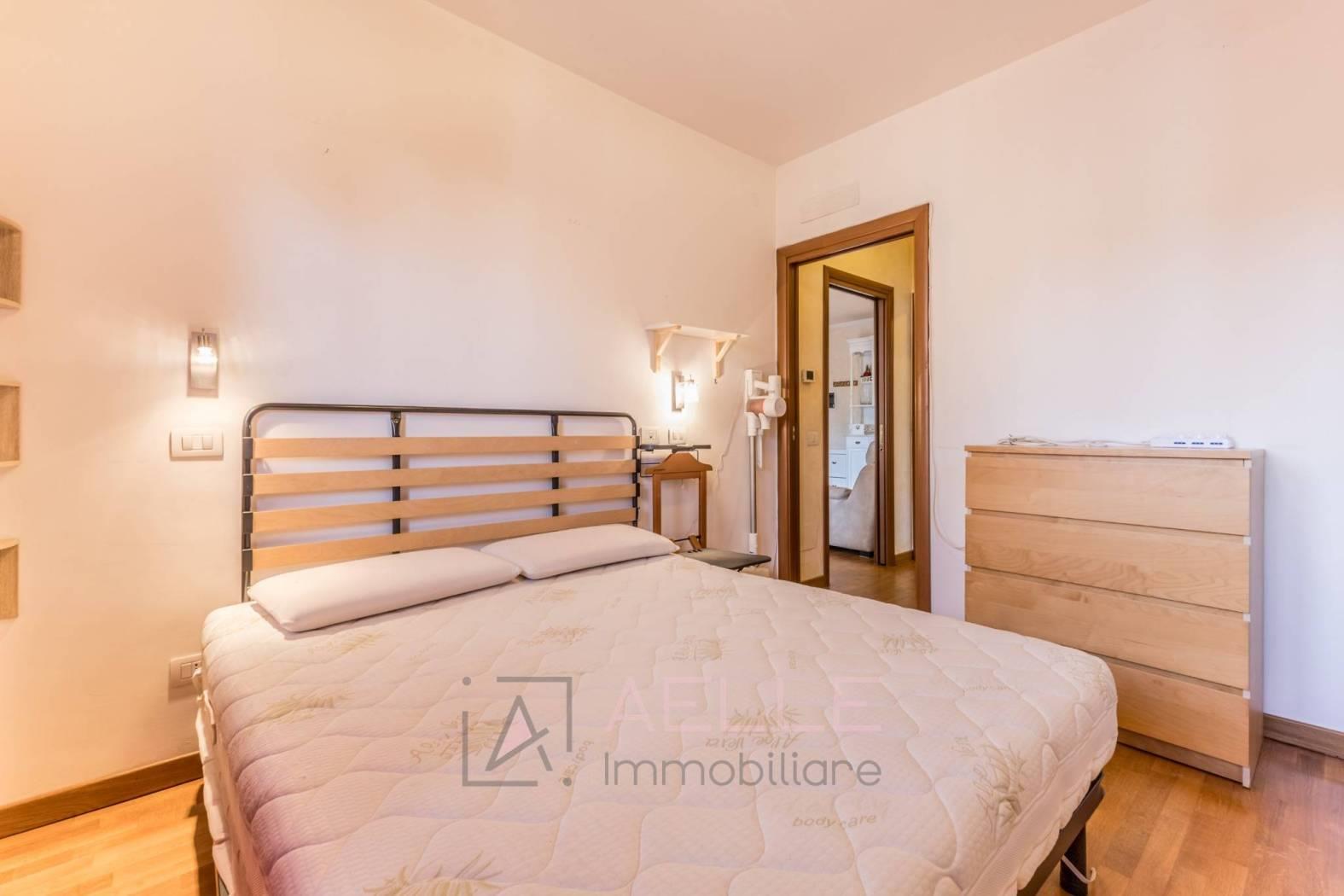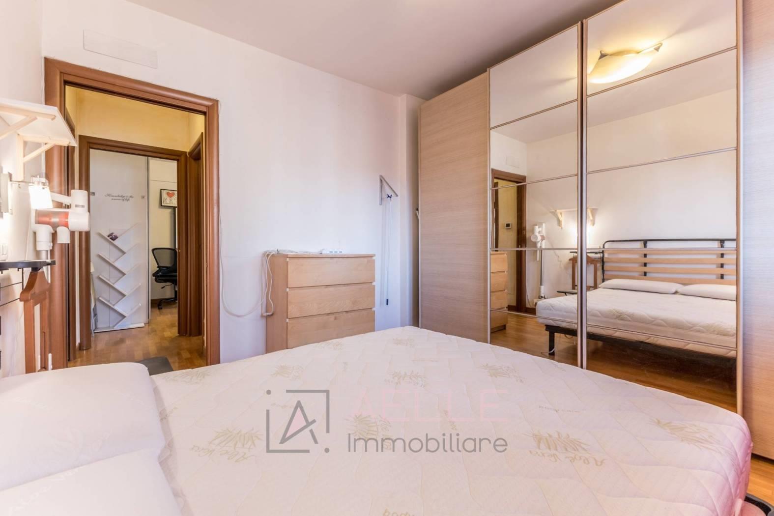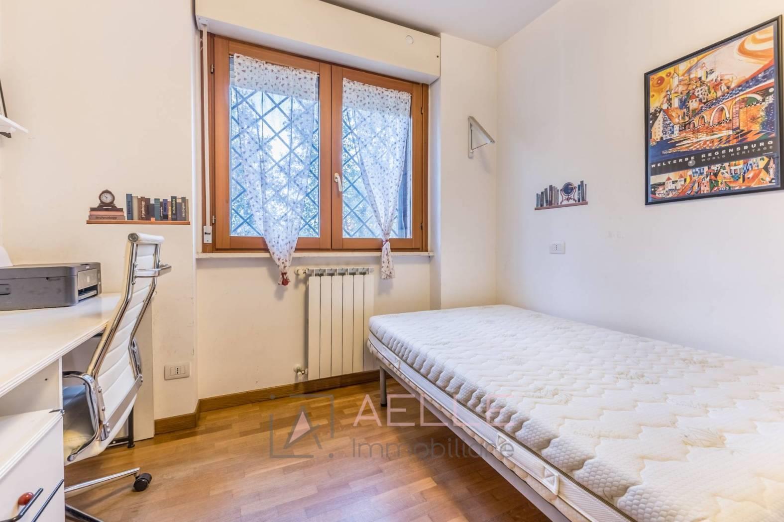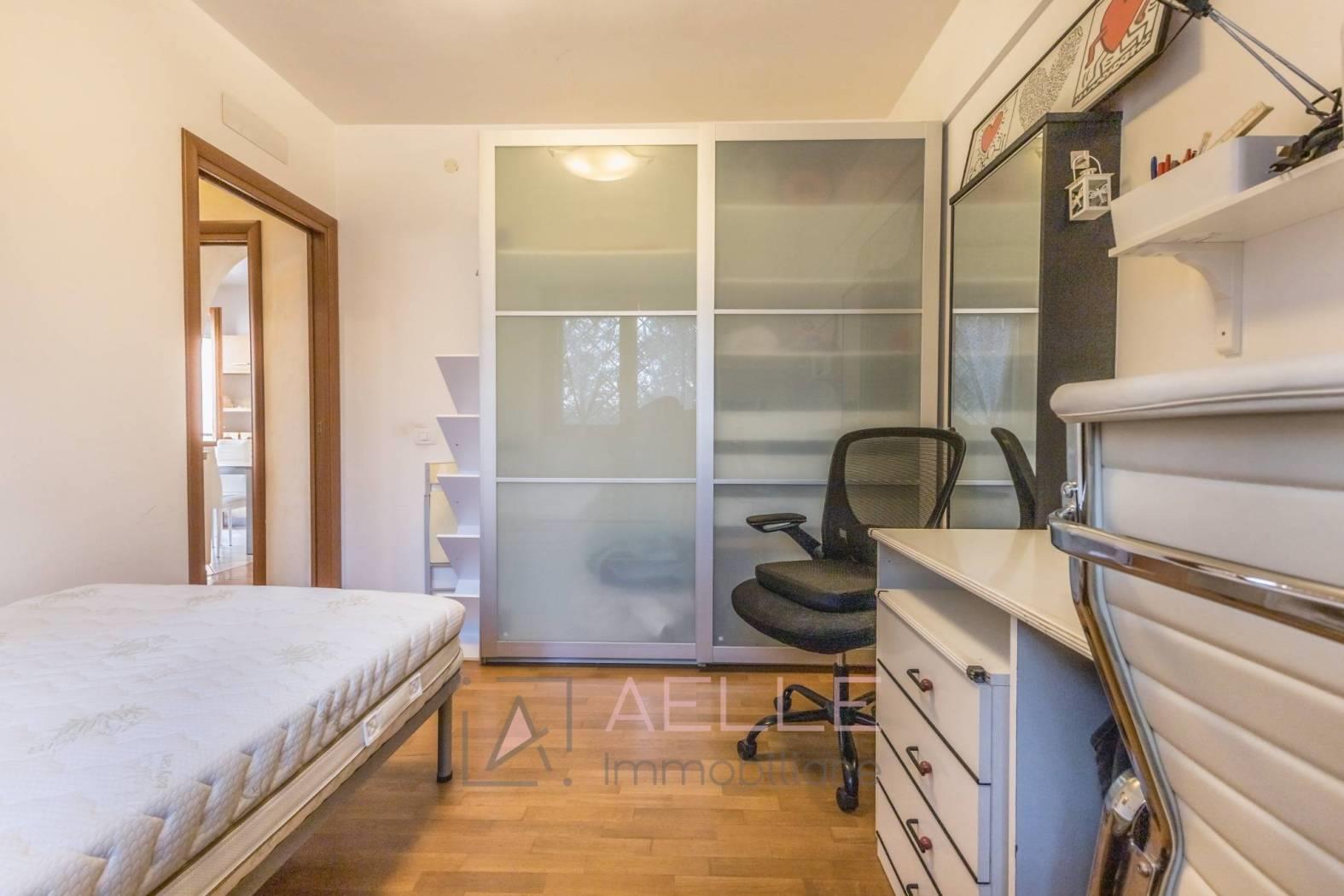 Pavimentazione in parquet, infissi in legno con doppio vetro, inferriate, videocitofono, condizionatore e serrande elettriche nel soggiorno. Box auto di proprietà di 23mq con accesso diretto dall’ascensore. Esposizione est.