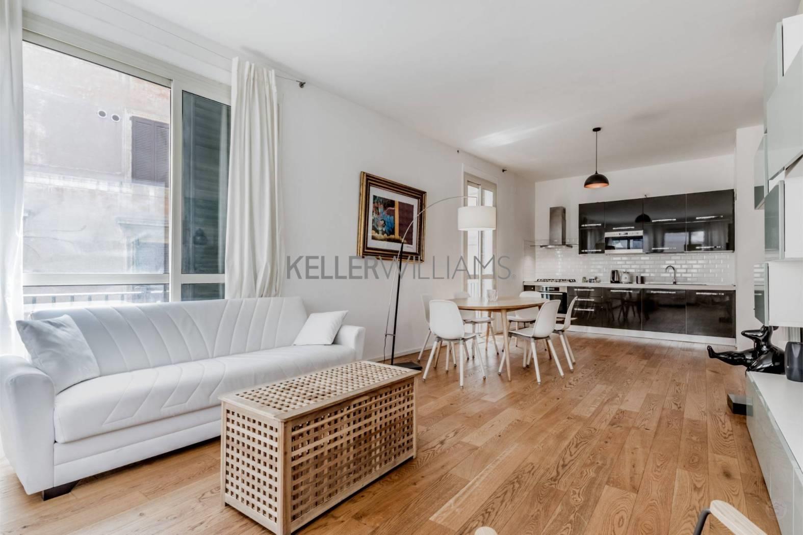Ristrutturato e pieno di luce. È l’appartamento presentato in vendita da Keller Williams Home in via dell’Olmetto, a pochi metri da piazza Giuseppe Gioacchino Belli e dal Tevere, proprio accanto alla celebre medievale “casa di Dante Alighieri”.