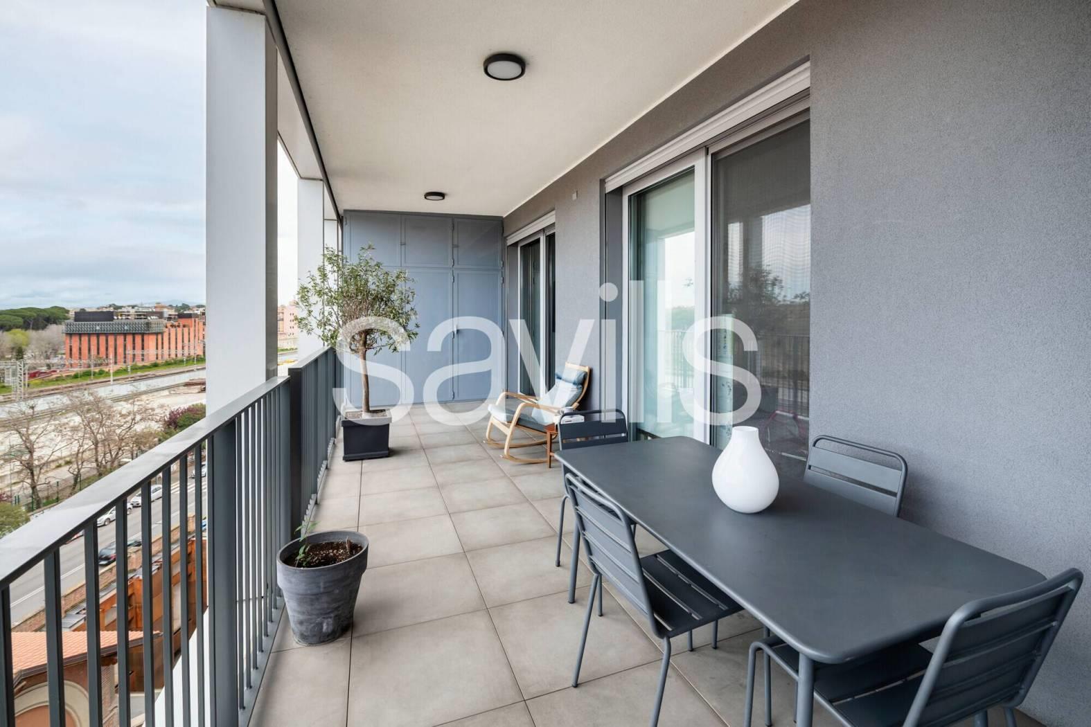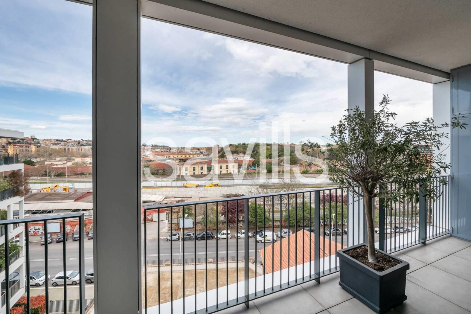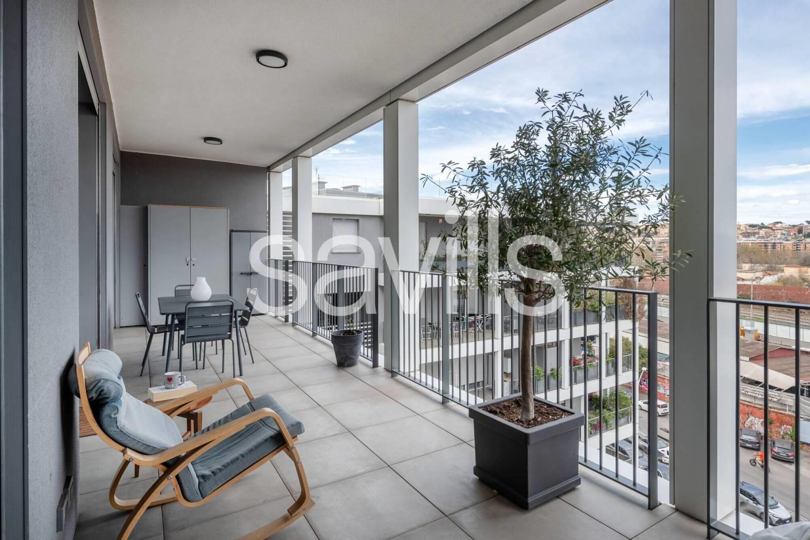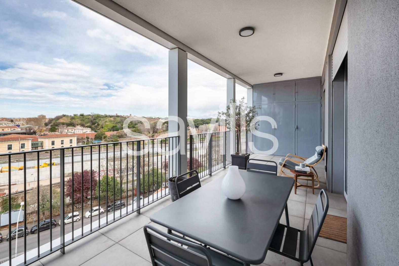 Questo appartamento si trova al quinto piano di un moderno edificio del 2017, con ascensore e servizio di portineria, situato nel quartiere Ostiense, una delle zone più dinamiche e identitarie di Roma.