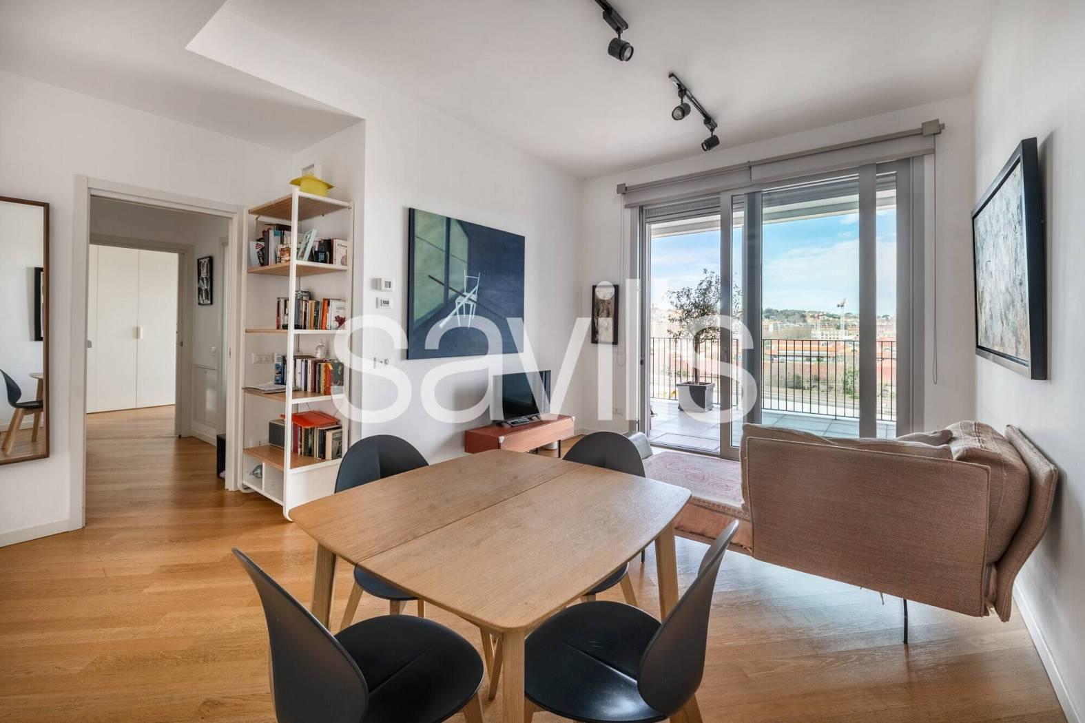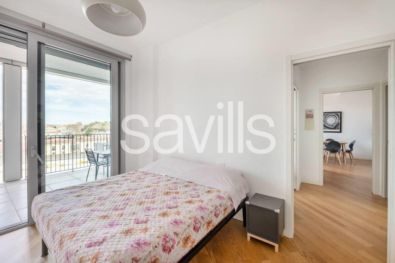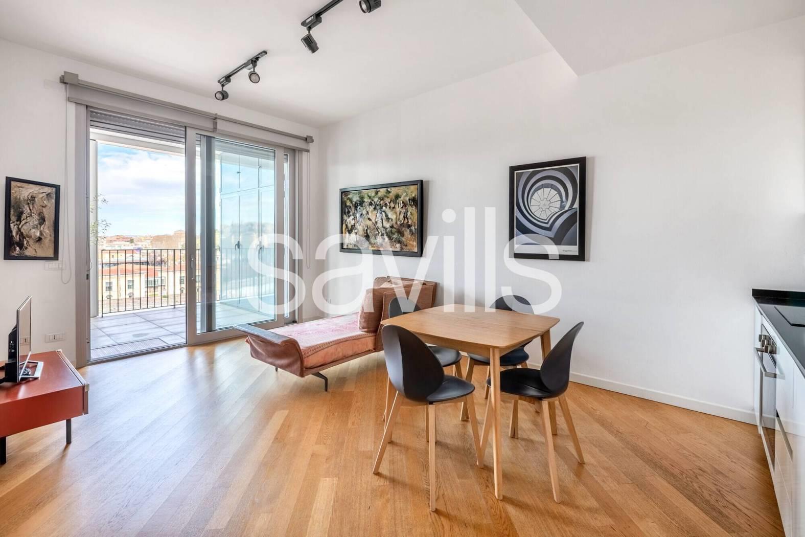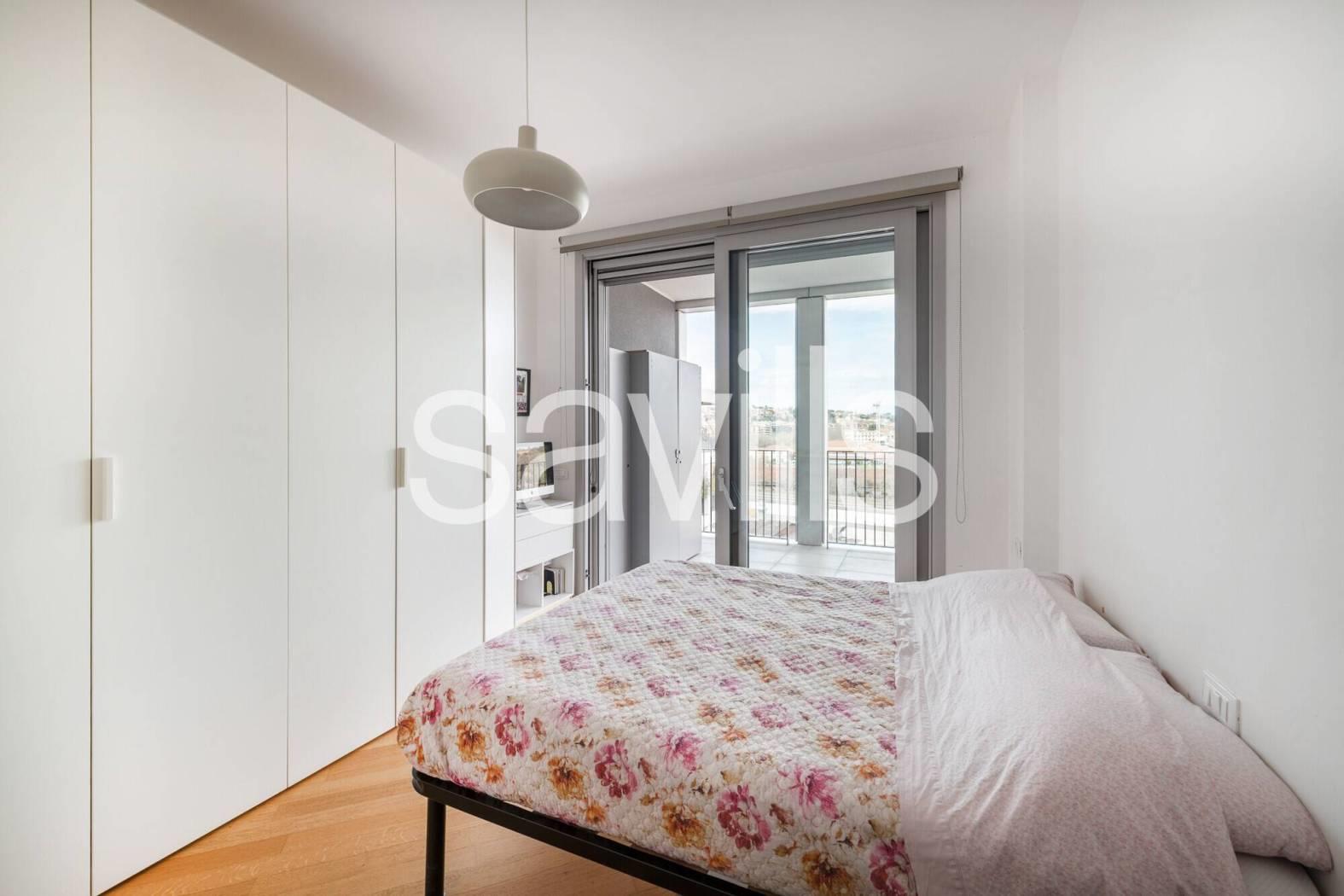 Questo appartamento si trova al quinto piano di un moderno edificio del 2017, con ascensore e servizio di portineria, situato nel quartiere Ostiense, una delle zone più dinamiche e identitarie di Roma.