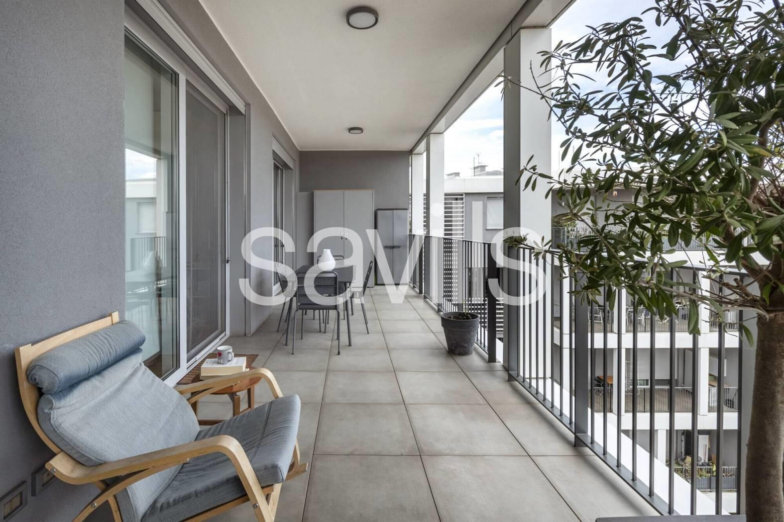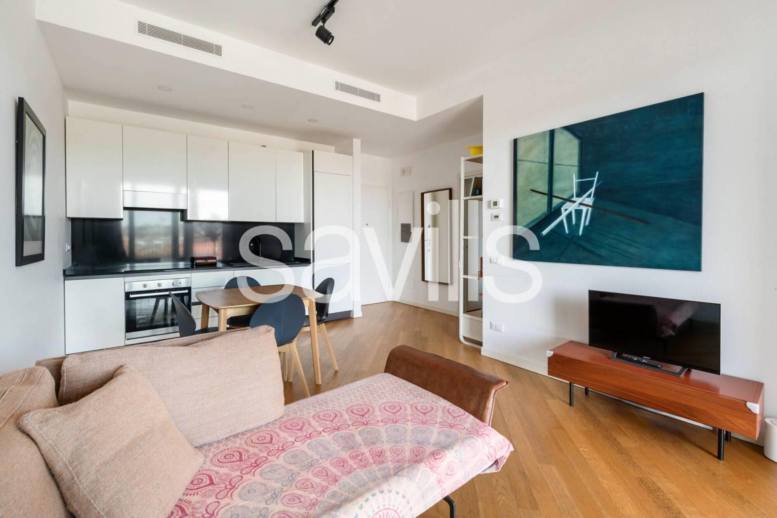 L’ingresso dell’abitazione introduce a un ambiente caldo e accogliente, dove il soggiorno con angolo cottura integrato si apre con naturalezza verso l’esterno. La luminosità è protagonista, grazie alle ampie superfici vetrate che dialogano con l'ampia terrazza: uno spazio aperto, riservato e con vista libera, ideale per colazioni all’aperto e momenti di relax.