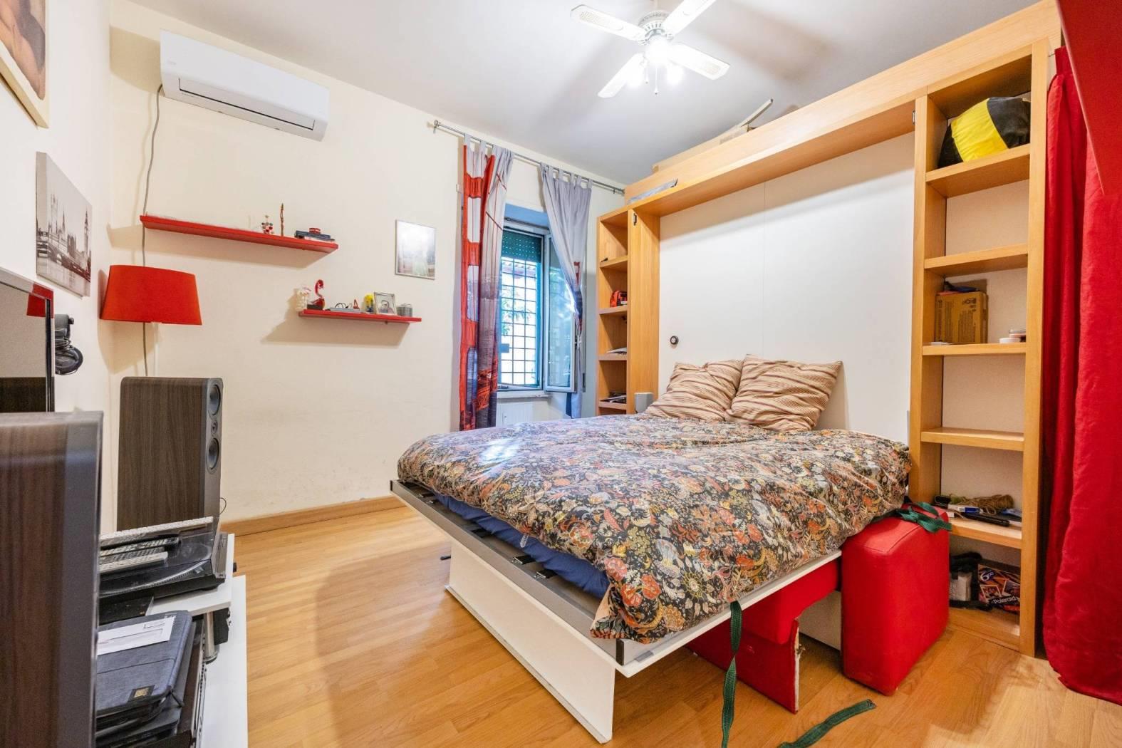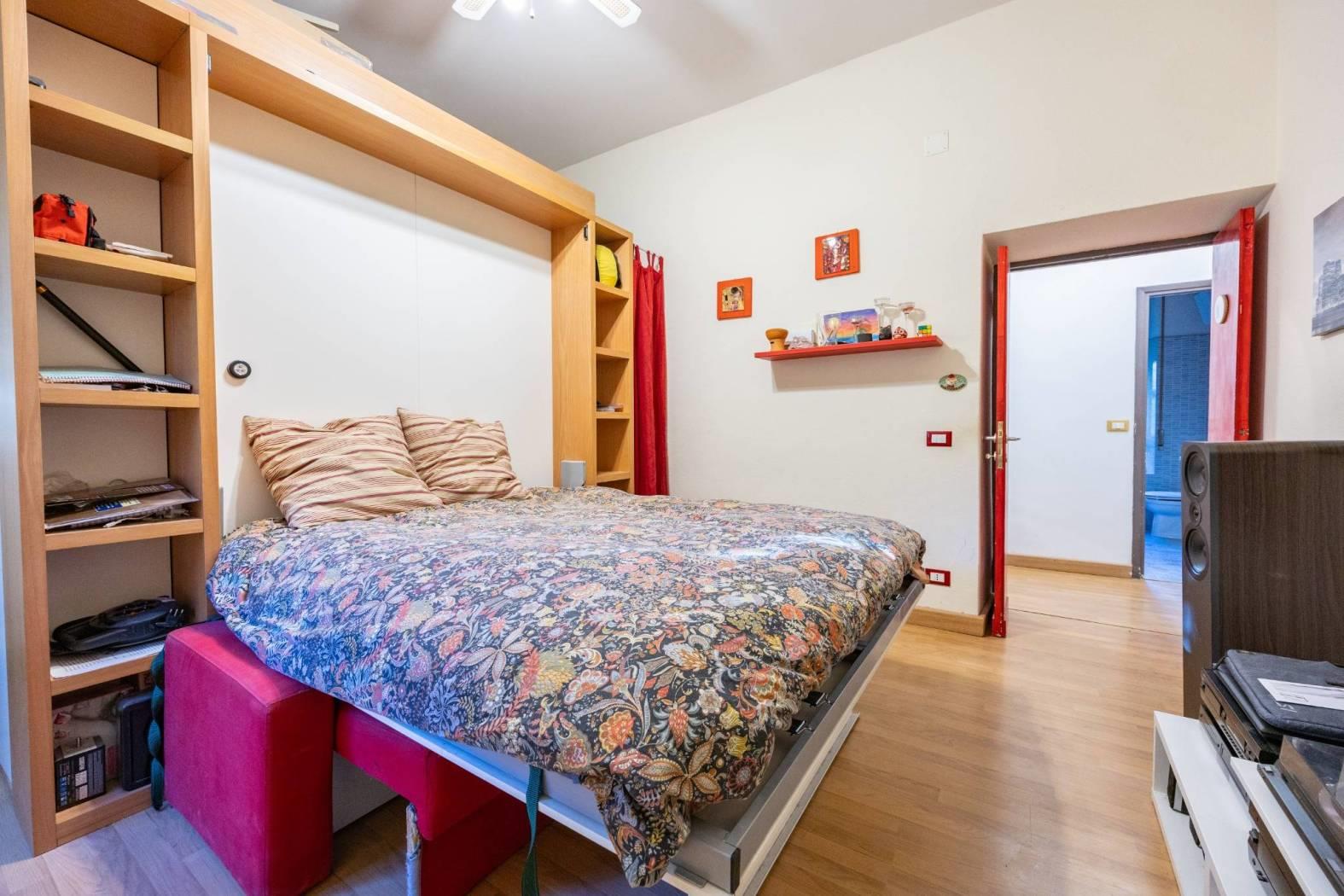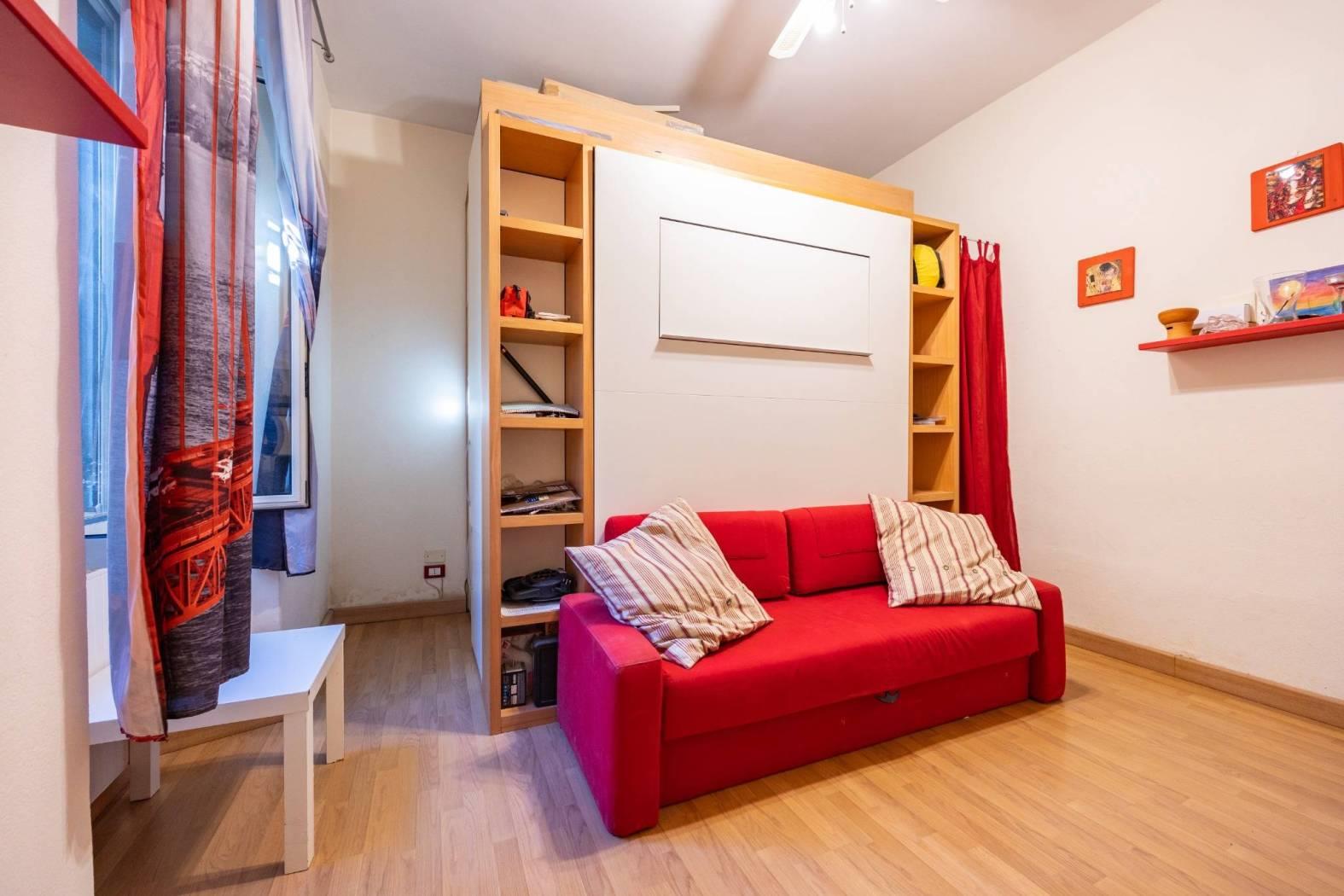 camera da letto/salone, arredata con un mobile modulare con letto a scomparsa integrato a cabina armadio.
