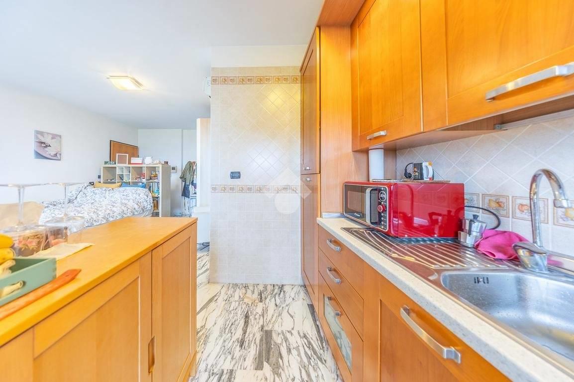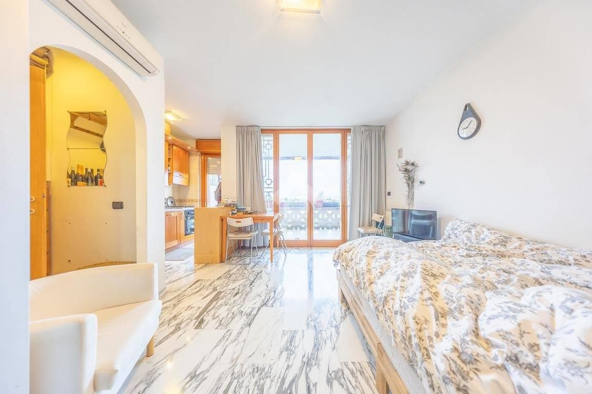 L’ingresso apre su un soggiorno con angolo letto ben organizzato, affiancato da un angolo cottura pratico e funzionale. Un disimpegno conduce al bagno cieco dotato di box doccia.
