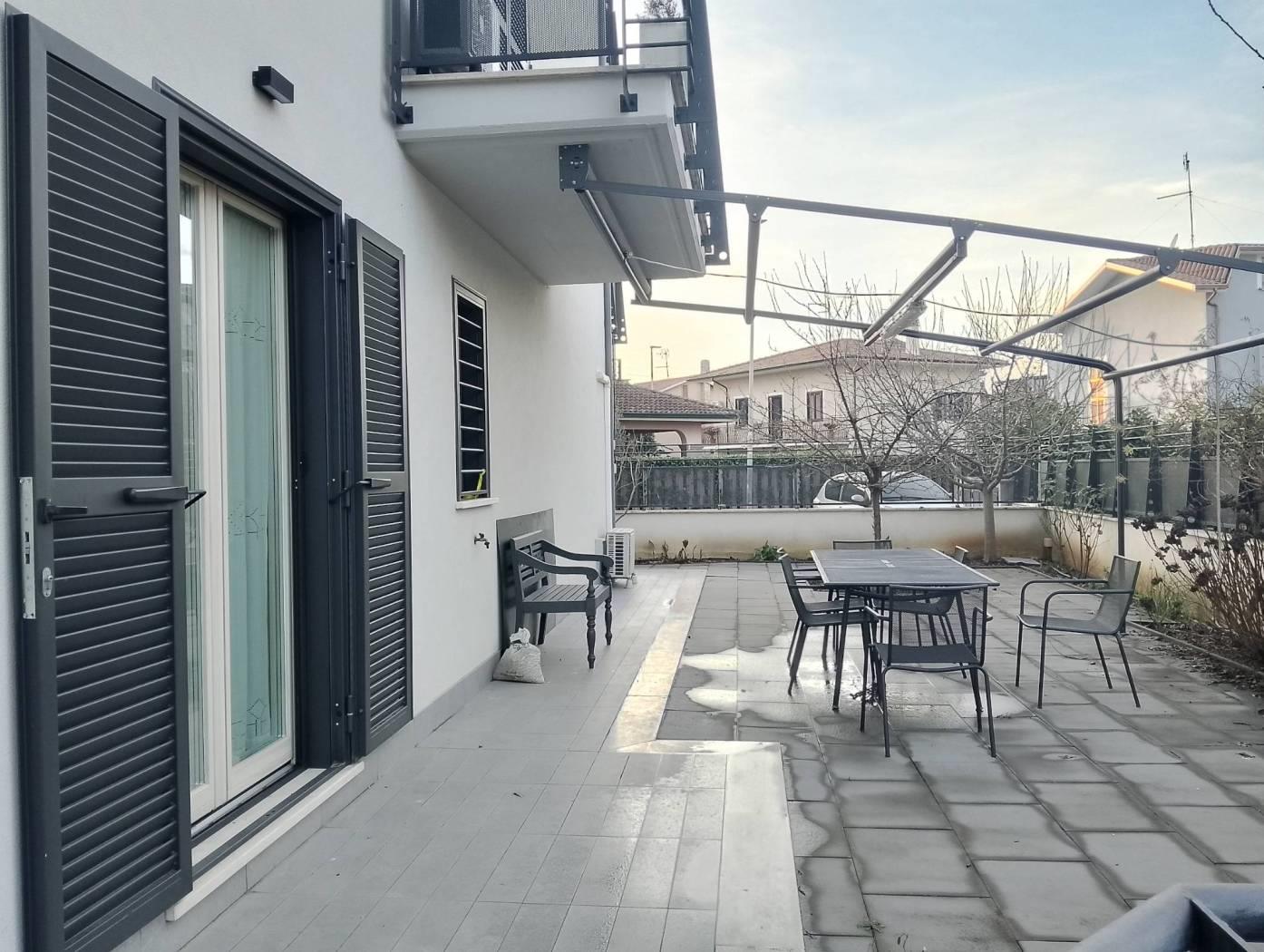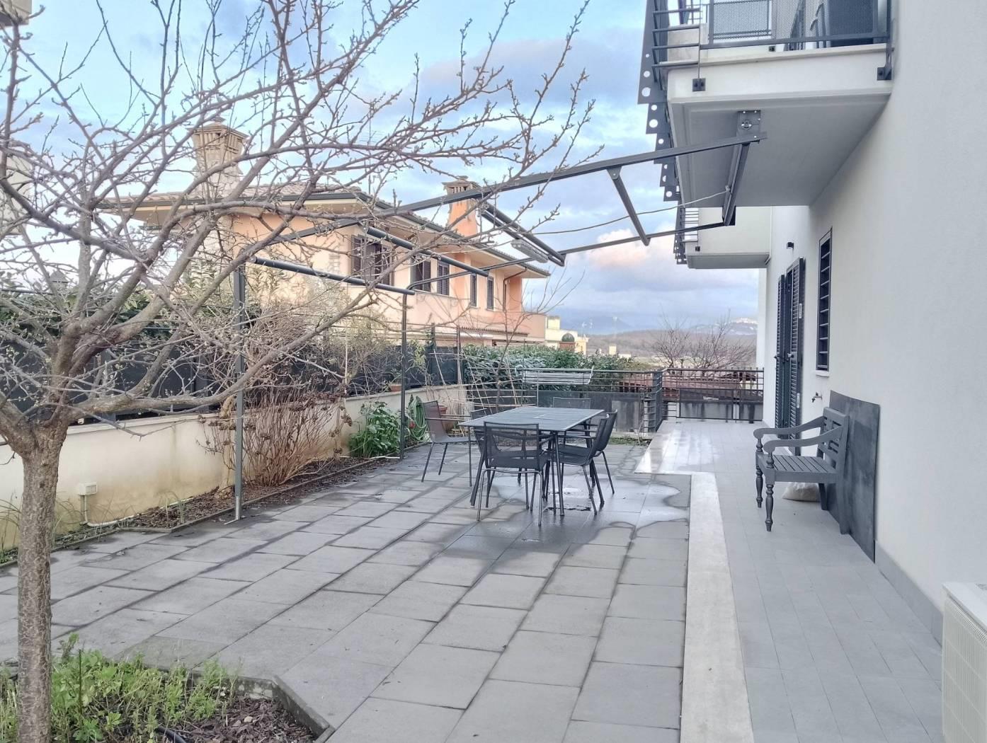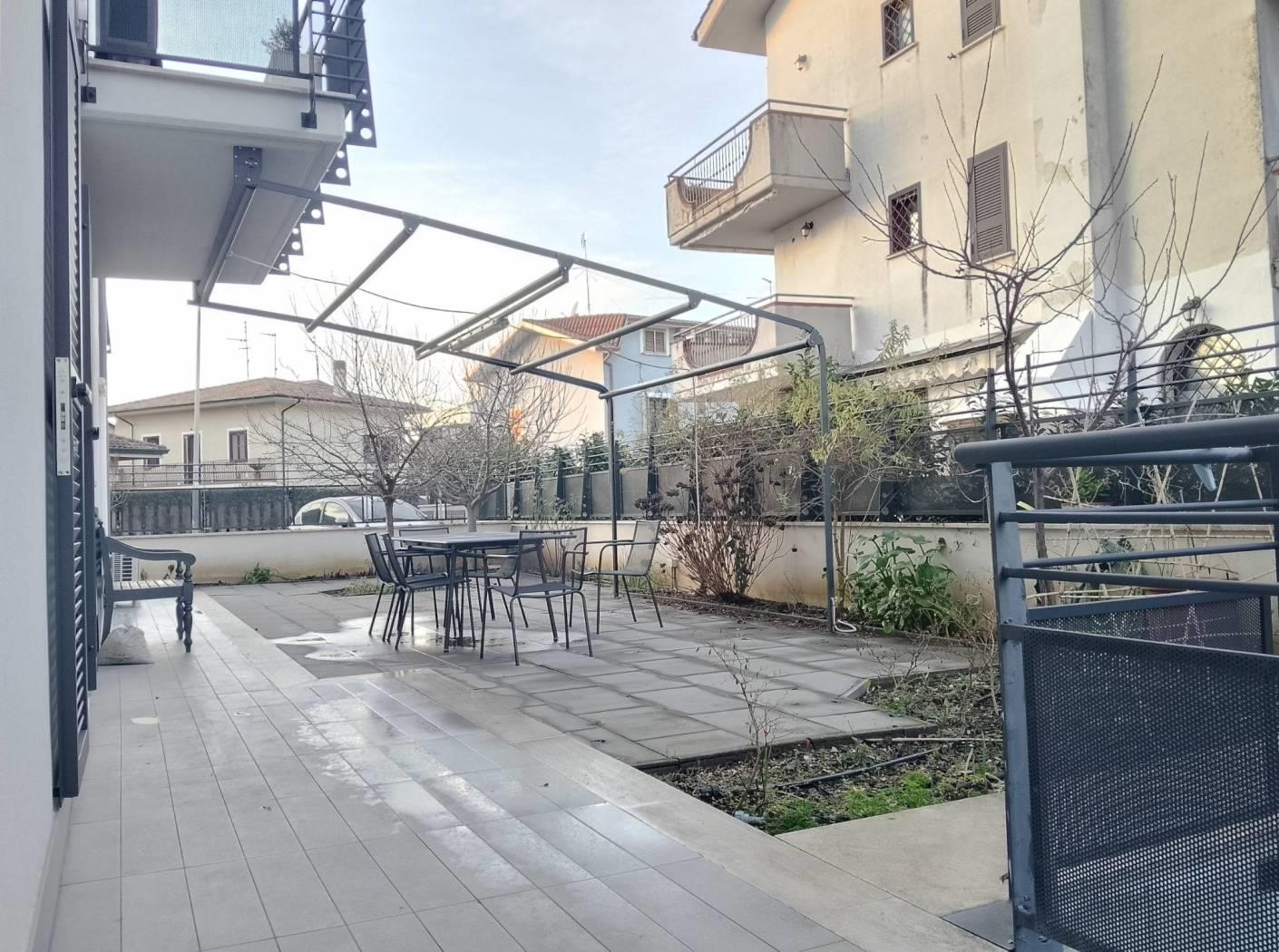 monterotondo via isonzo, in palazzina di recente costruzione disponiamo di un appartamento sito al piano terra. l'immobile e' composto da ingresso con ripostiglio/dispensa, salone con affaccio sul giardino- terrazzo antistante, cucinotto, camera matrimoniale con bagno interno, camera e studio. e' presente un secondo bagno.nella parte retrostante insiste un balcone. completano la proprieta' un posto auto ed una cantina