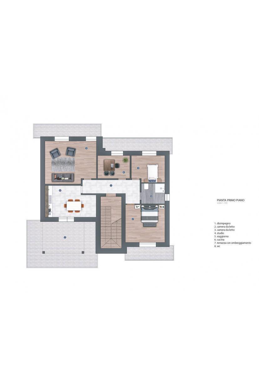 Al primo piano c'è un appartamento composto da ingresso, soggiorno, due camere da letto, cameretta/studio, cucina, bagno, tre balconi ed una terrazza abitabile dotata di pergotenda elettrica motorizzata per poter usufruire al meglio la terrazza anche in inverno.