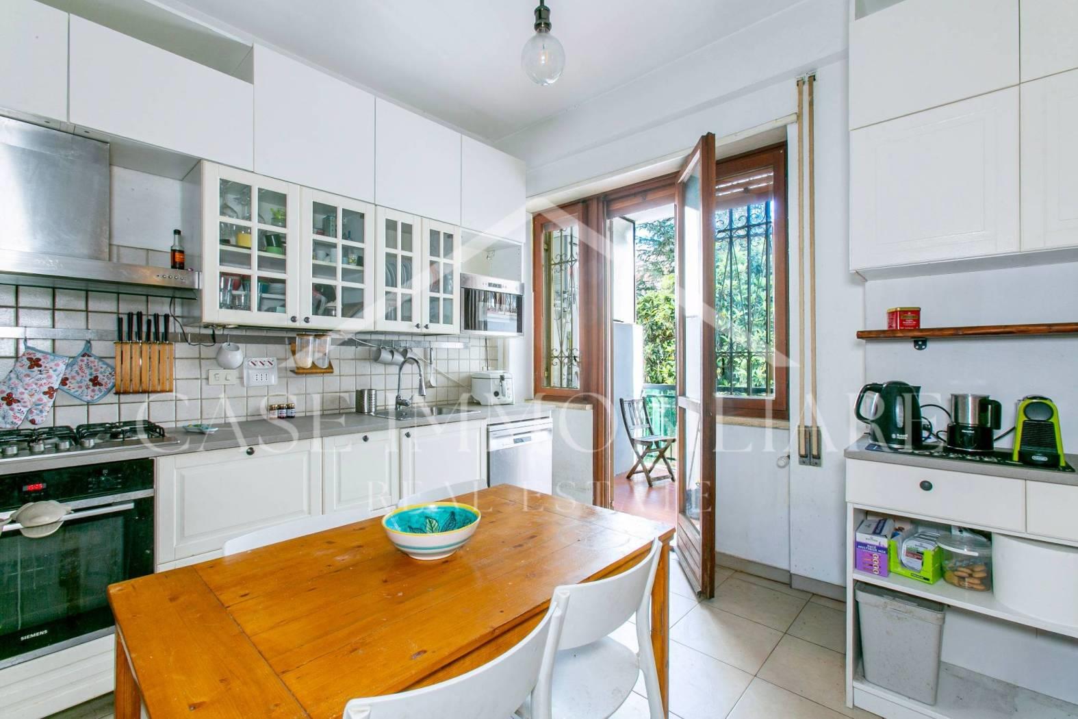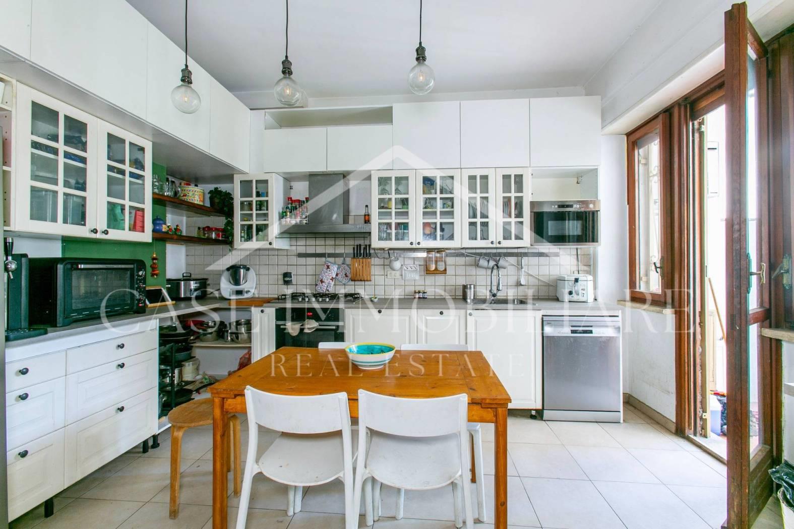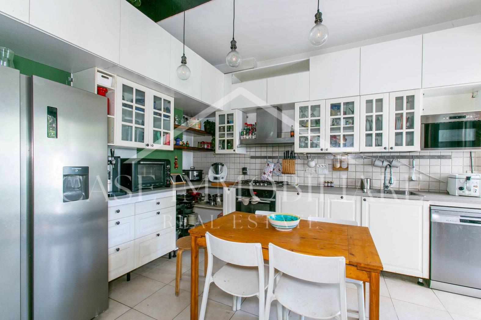Sulla sinistra, sempre rispetto all’ingresso abbiamo una piacevole cucina con balcone privato ed uno studio : perfetto per chi lavora da casa, facilmente trasformabile in lavanderia o sala da pranzo, a seconda delle esigenze familiari.