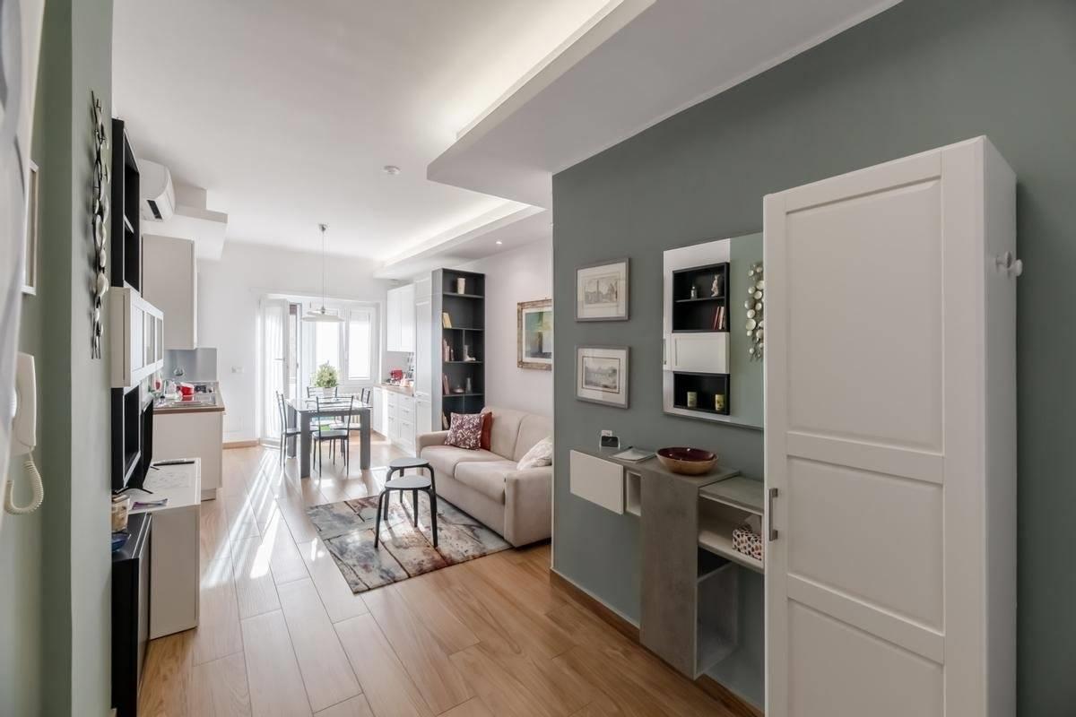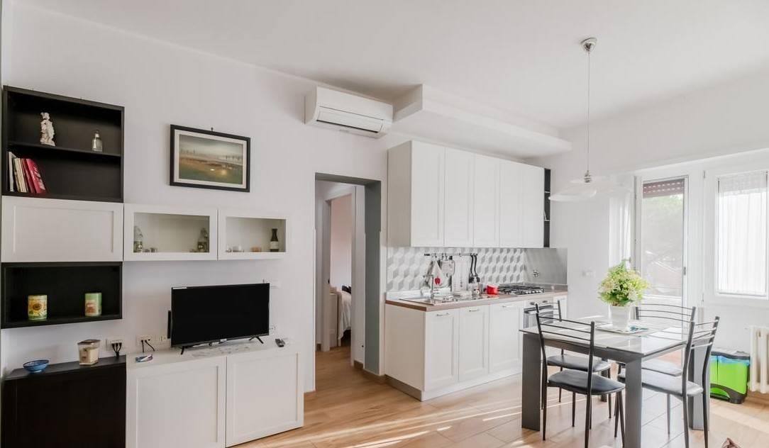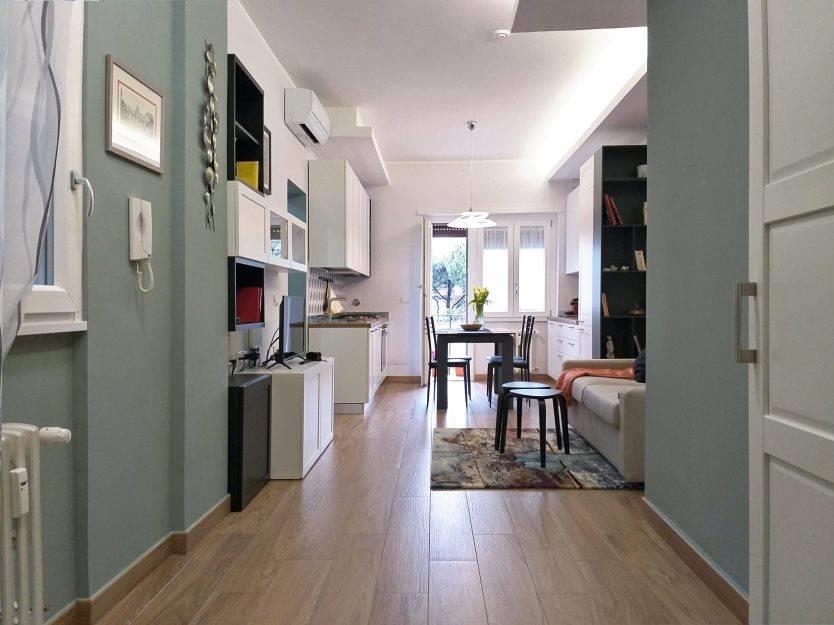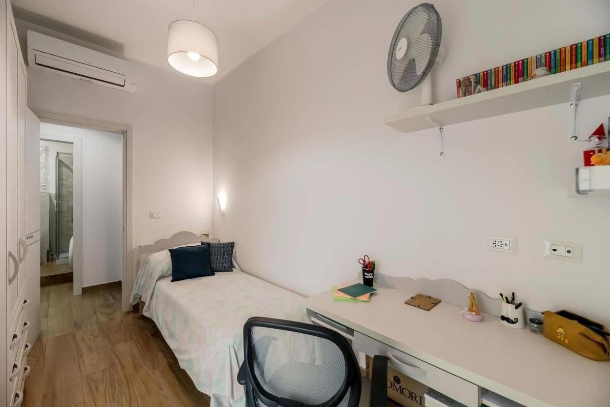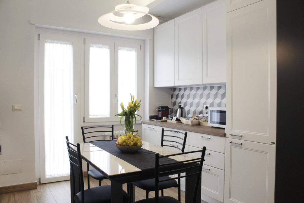 L'appartamento risulta finemente ristrutturato ed arredato. La cucina Scavolini su misura presenta tutti gli elettrodomestici, così come i servizi dispongono di arredi e box doccia in muratura; le camere inoltre sono dotate di armadiature e pareti attrezzate, il tutto per fornire il massimo del comfort e della praticità.