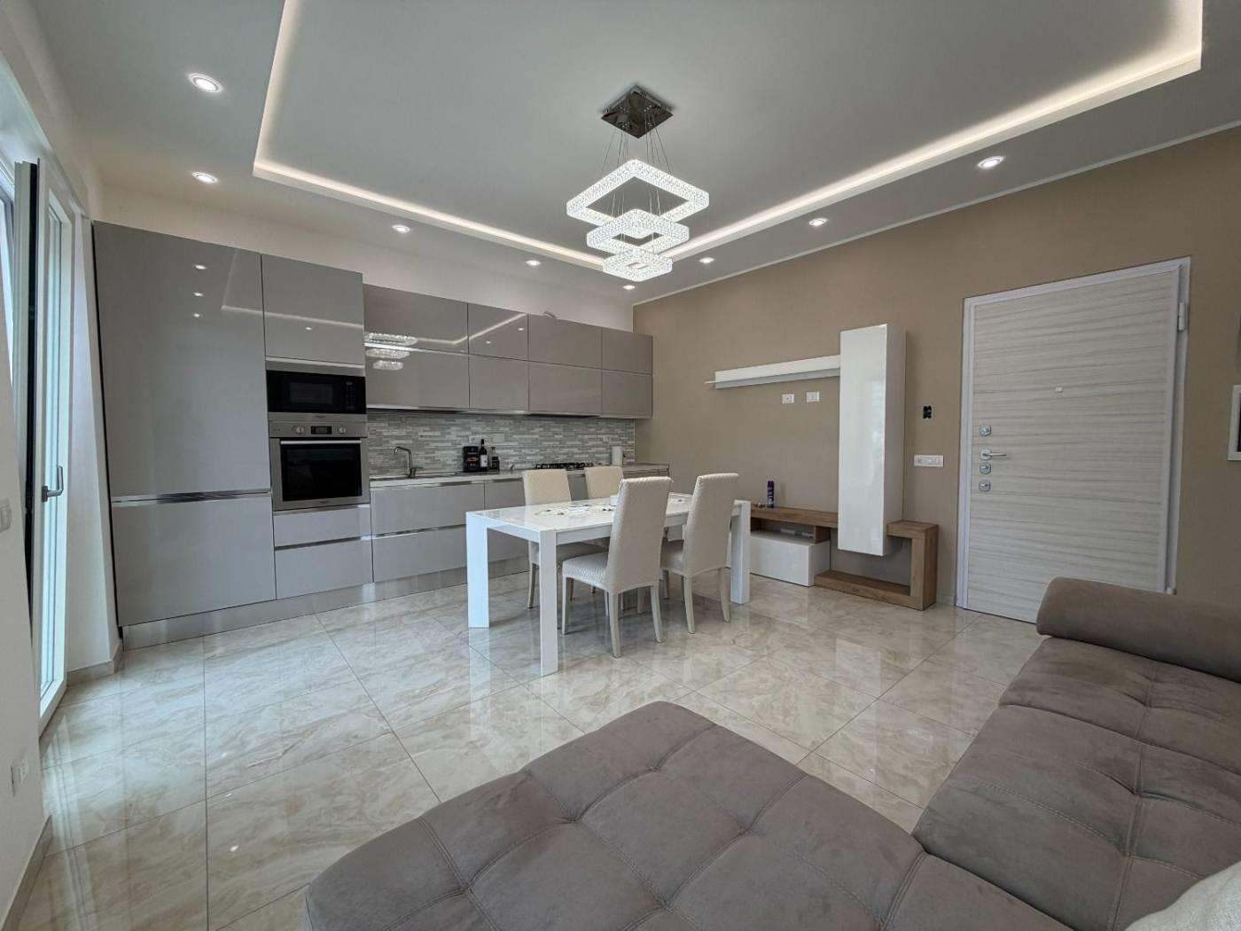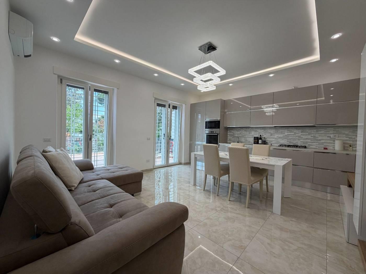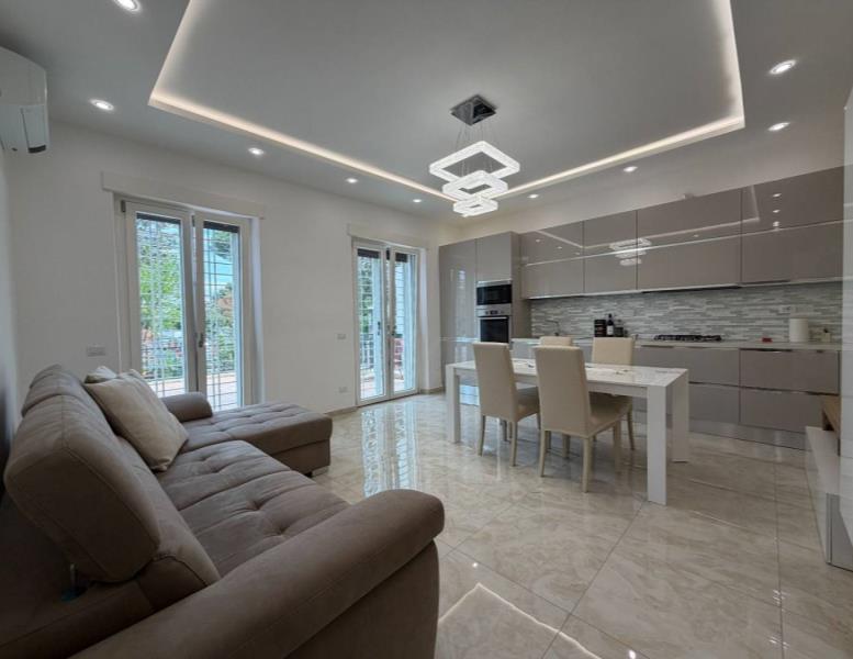 Varcando la soglia, si viene accolti da una zona giorno dal respiro contemporaneo: un luminoso soggiorno con angolo cottura progettato per unire convivialità e funzionalità. Da questo ambiente si gode di un accesso diretto e fluido verso gli spazi esterni, creando una naturale continuità tra dentro e fuori.