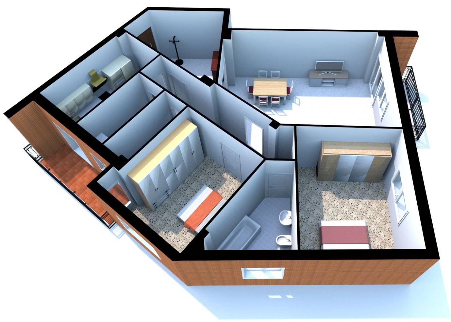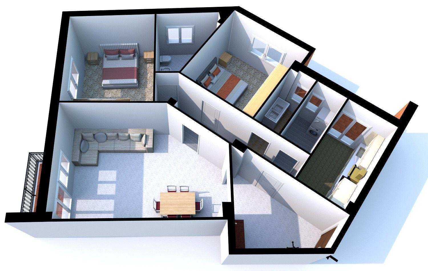 Internamente l'appartamento è composto da un grande Ingresso dal quale si accede al grande salone e al corridoio, nel corridoio troviamo l'accesso alla cucina, al ripostiglio, alle 2 Camere da letto Matrimoniali, ai 2 Bagni ed al Salone.