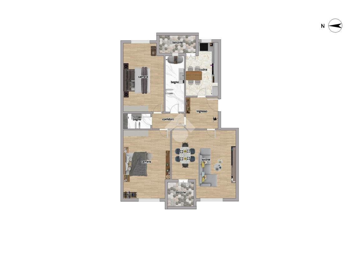Internamente composto da: ingresso, salone doppio, cucina abitabile, 2 camere da letto entrambe matrimoniali, 2 bagni (uno con vasca e uno con doccia), un ripostiglio e 2 balconi.