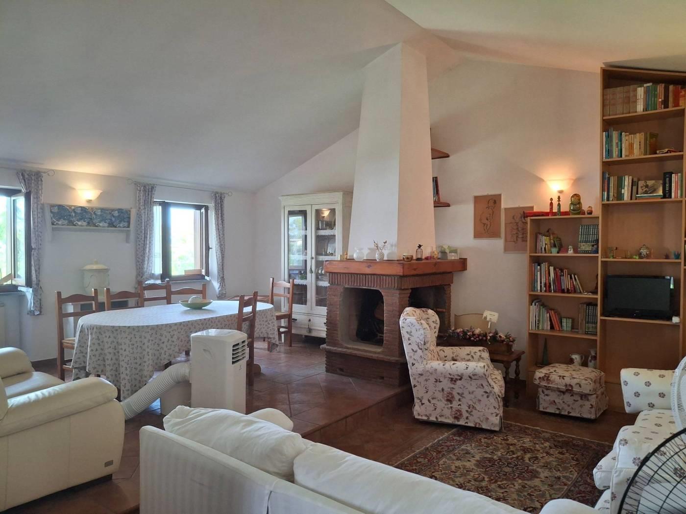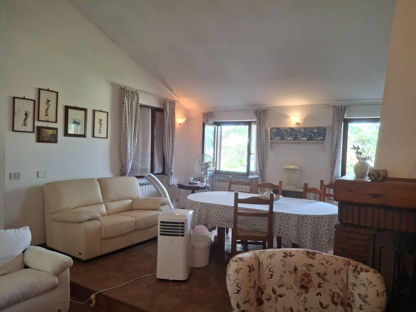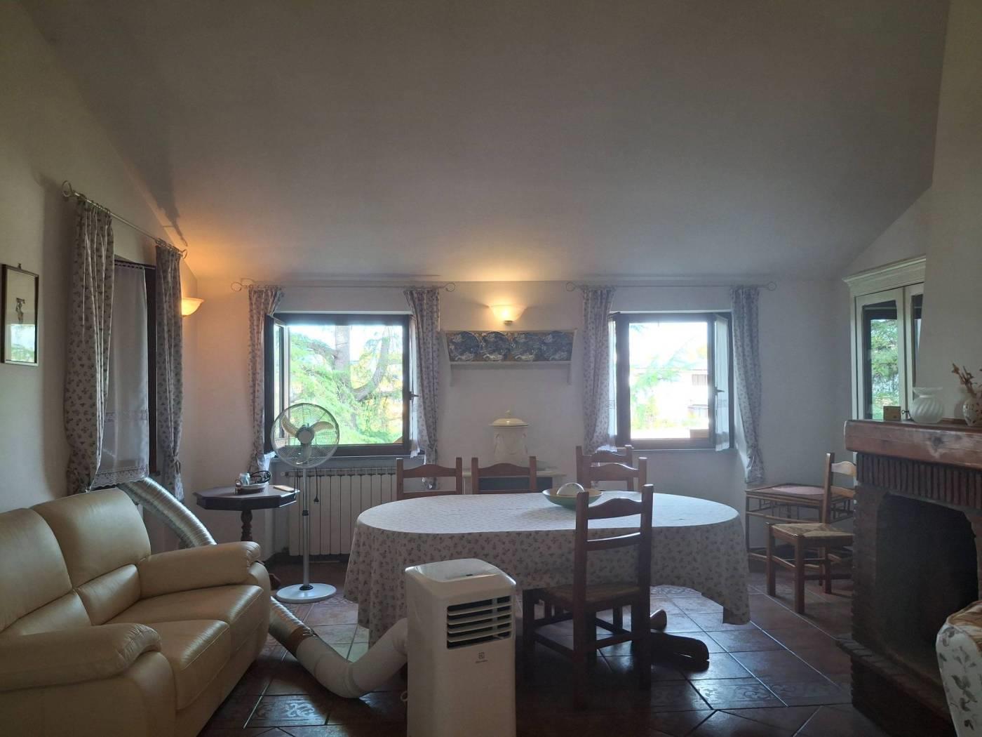 L'appartamento ha una metratura interna di mq 120 c.a. ed è composto da salone con camino, due ampie camere da letto, doppi servizi cucina abitabile (con barbecue in muratura) ed un portico di mq 15 c.a dove poter comodamente mangiare nella bella stagione. E' un immobile completamente arredato, con una doppia esposizione, Est/Ovest . No spese di condominio, riscaldamento autonomo.