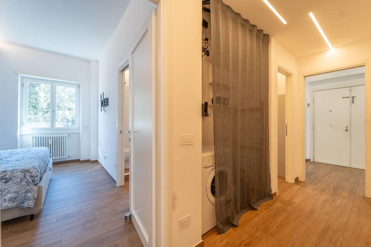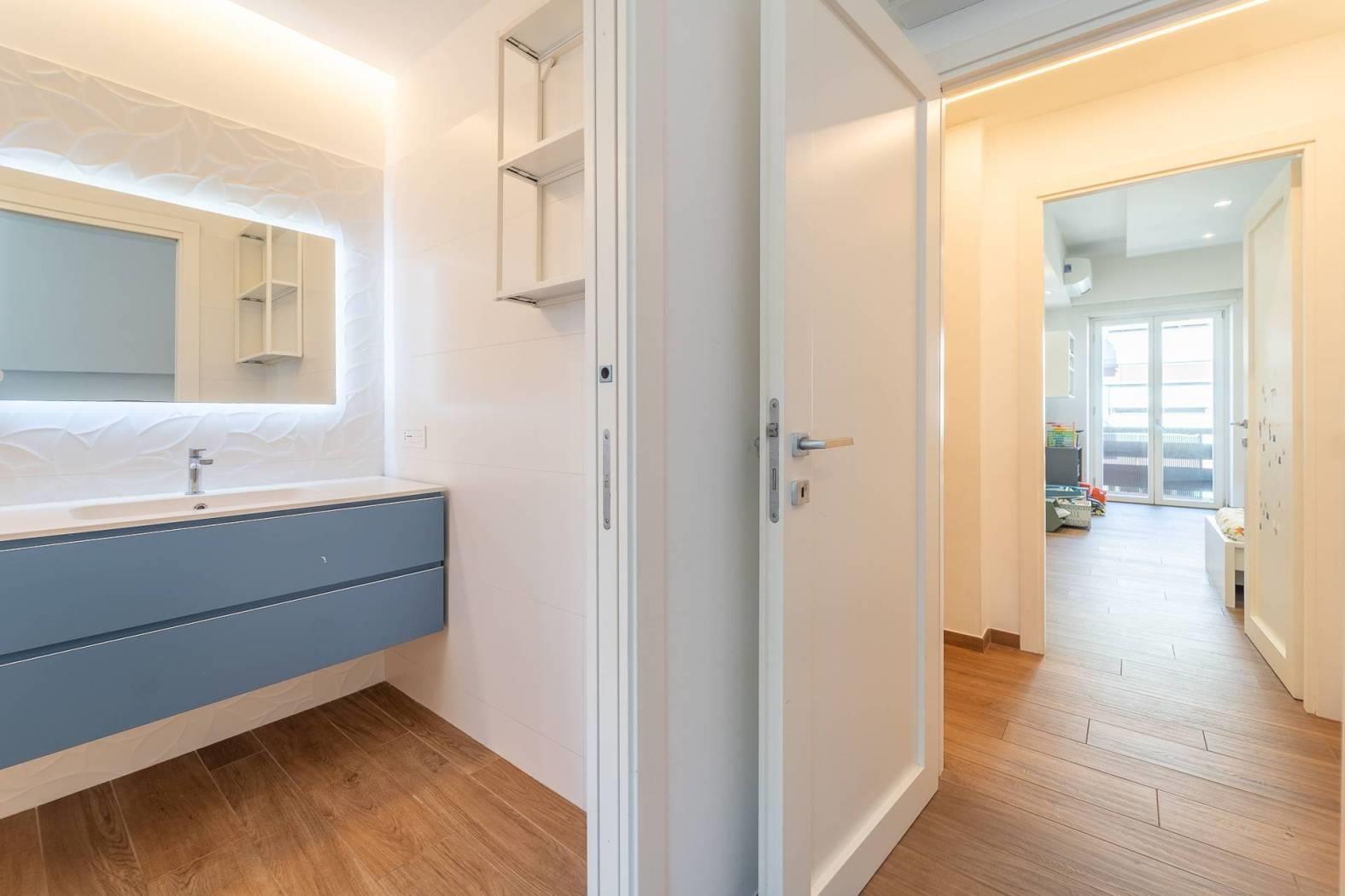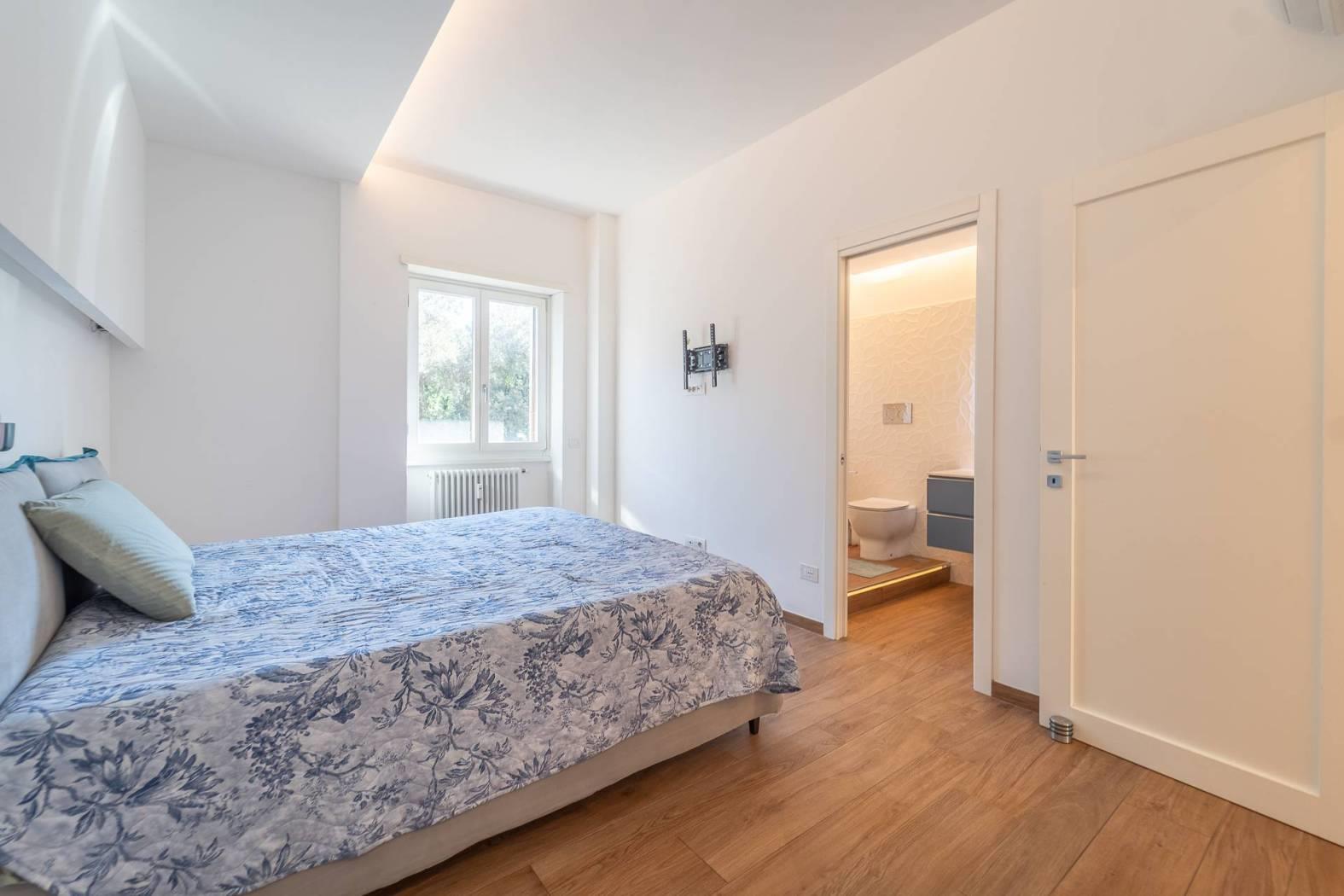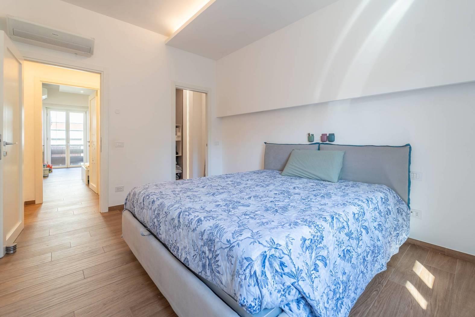 All’inizio del corridoio troviamo un primo bagno, finestrato con box doccia; proseguendo si accede alle due camere da letto, entrambe di generosa metratura. La camera patronale è dotata di cabina armadio e bagno privato, anch’esso finestrato e rifinito con materiali di pregio. La seconda camera ha accesso diretto allo stesso balcone del soggiorno, completando così la funzionalità della casa.