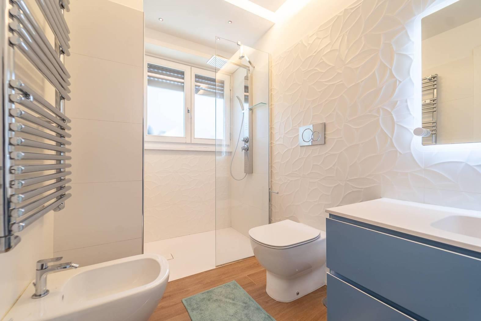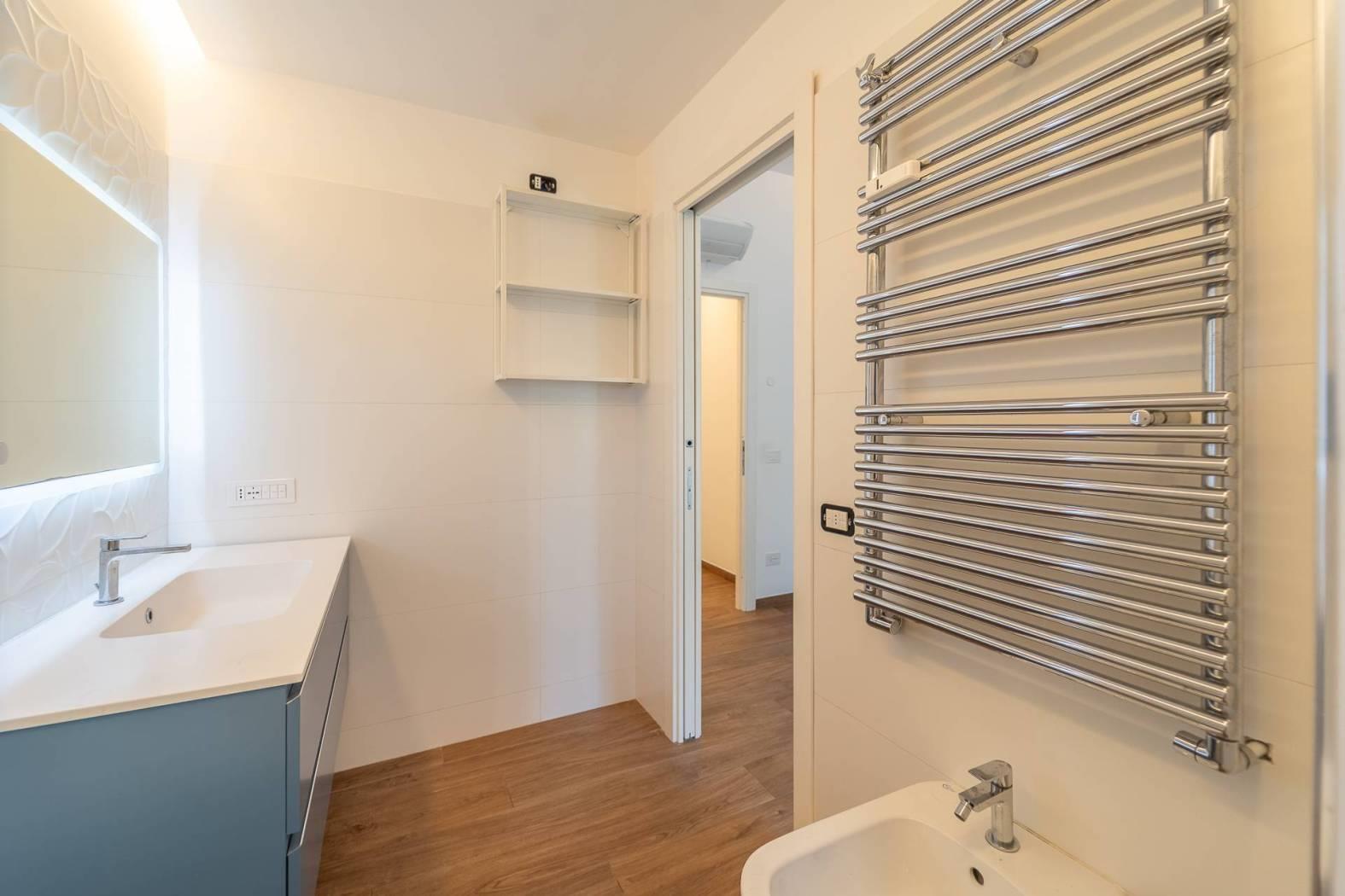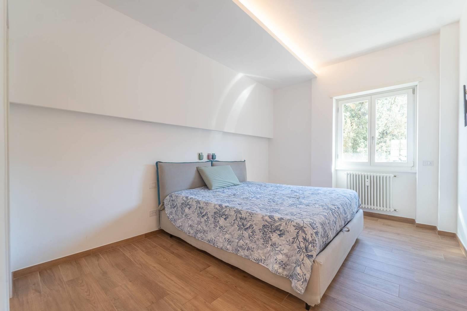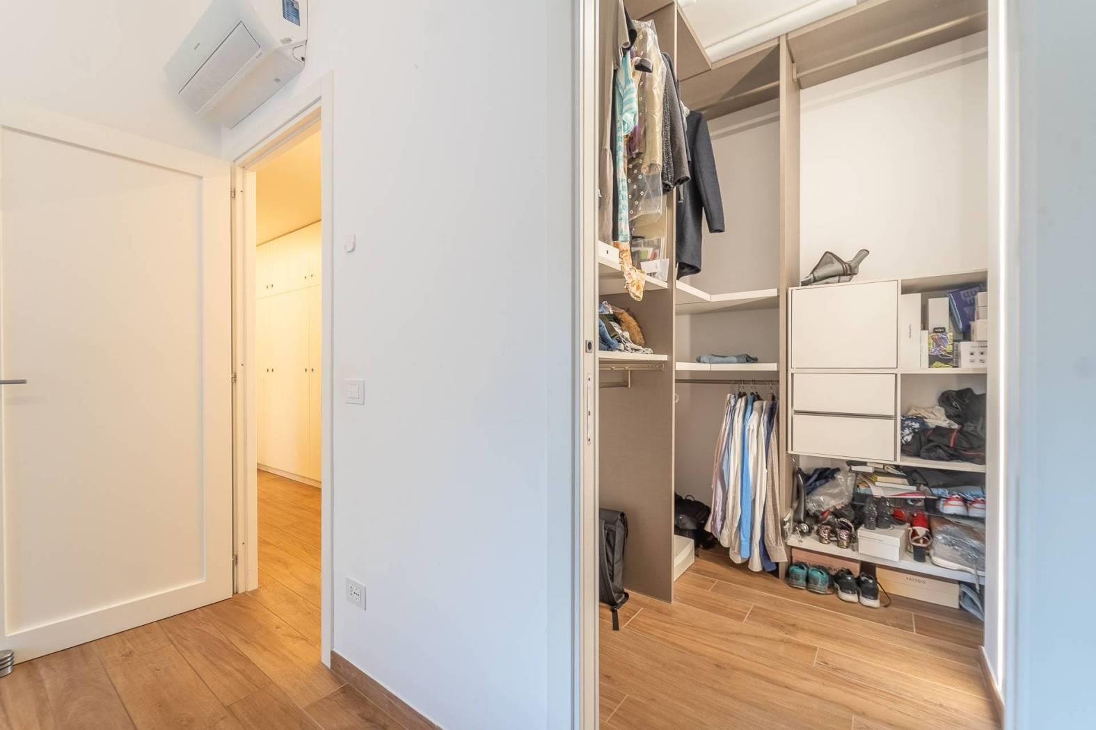 All’inizio del corridoio troviamo un primo bagno, finestrato con box doccia; proseguendo si accede alle due camere da letto, entrambe di generosa metratura. La camera patronale è dotata di cabina armadio e bagno privato, anch’esso finestrato e rifinito con materiali di pregio. La seconda camera ha accesso diretto allo stesso balcone del soggiorno, completando così la funzionalità della casa.
