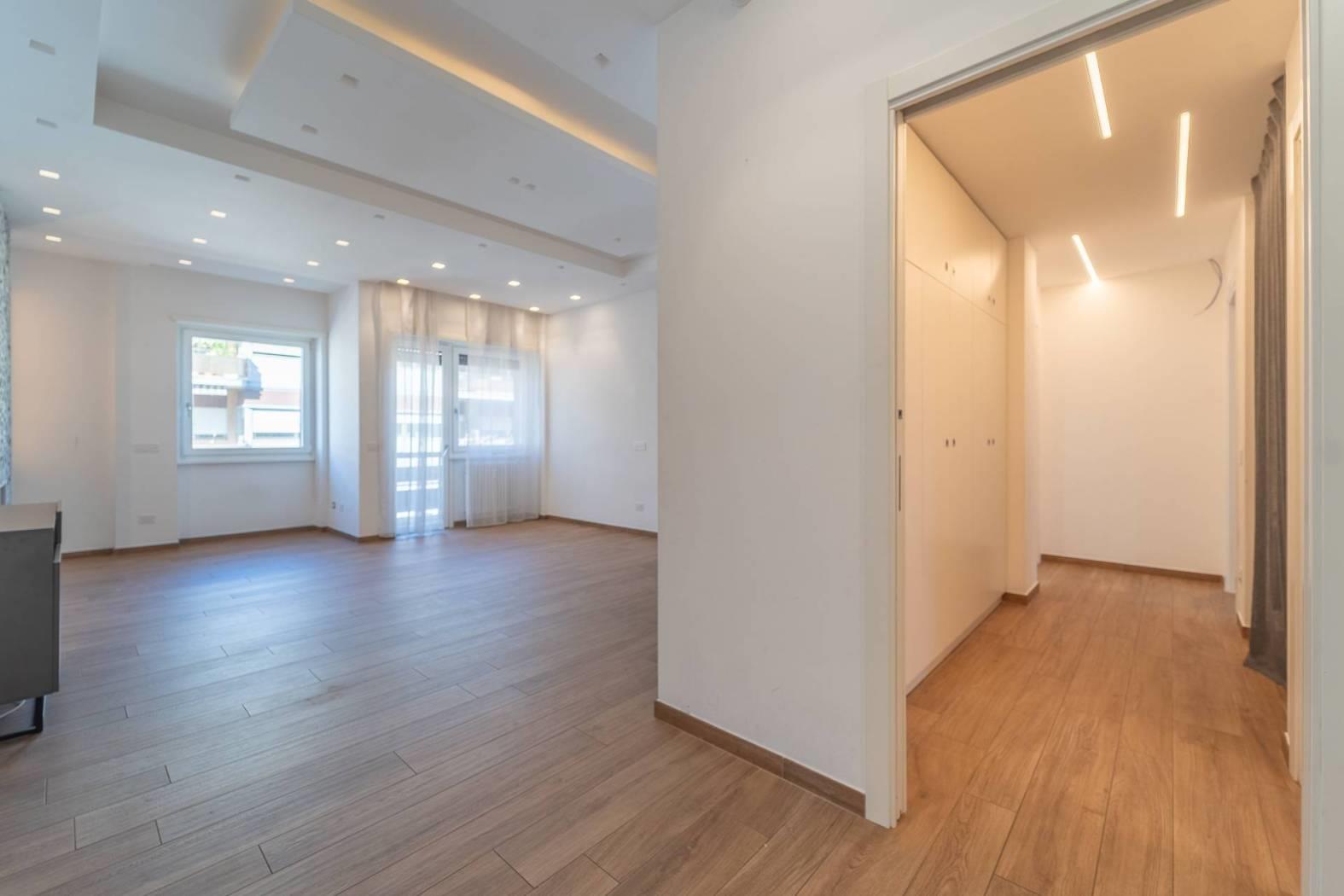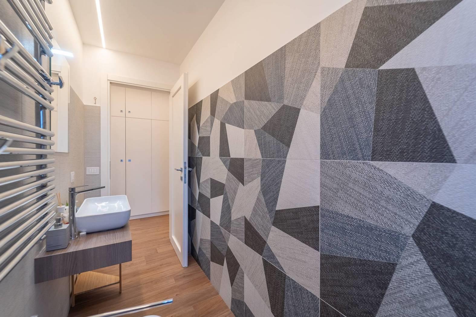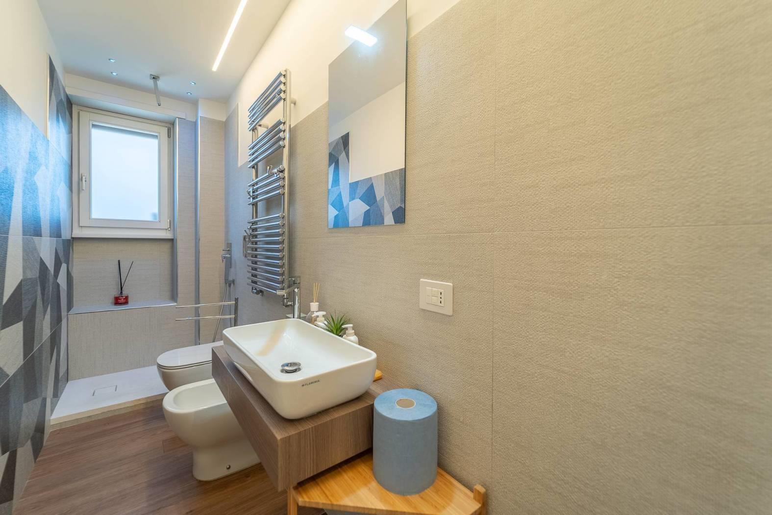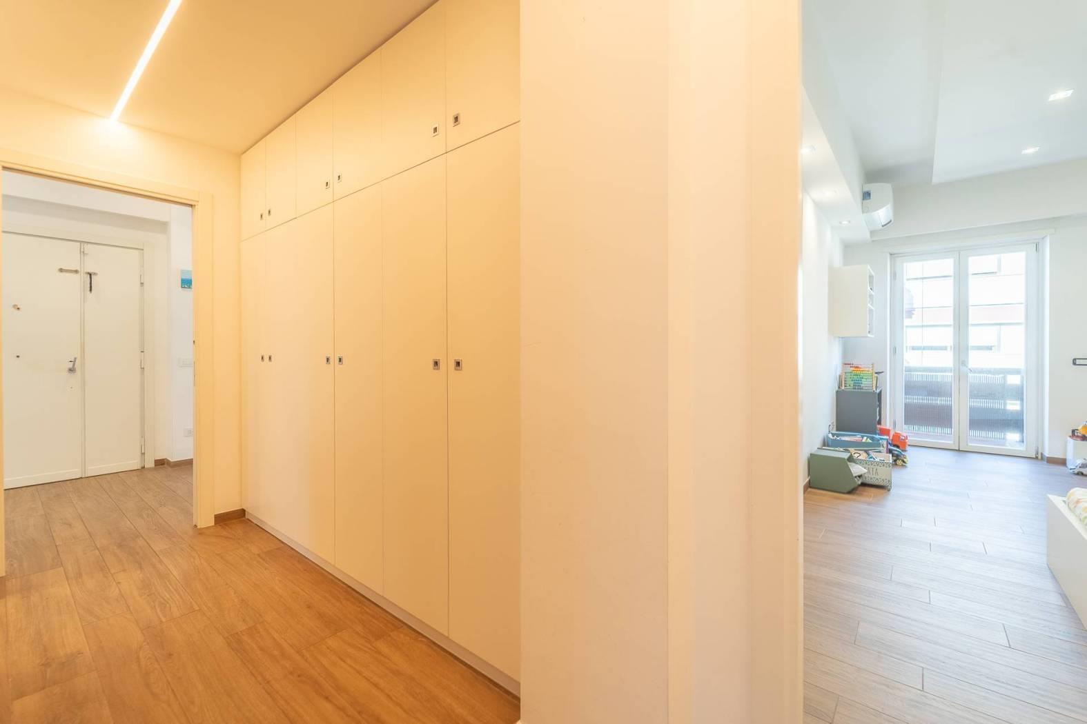 All’inizio del corridoio troviamo un primo bagno, finestrato con box doccia; proseguendo si accede alle due camere da letto, entrambe di generosa metratura. La camera patronale è dotata di cabina armadio e bagno privato, anch’esso finestrato e rifinito con materiali di pregio. La seconda camera ha accesso diretto allo stesso balcone del soggiorno, completando così la funzionalità della casa.