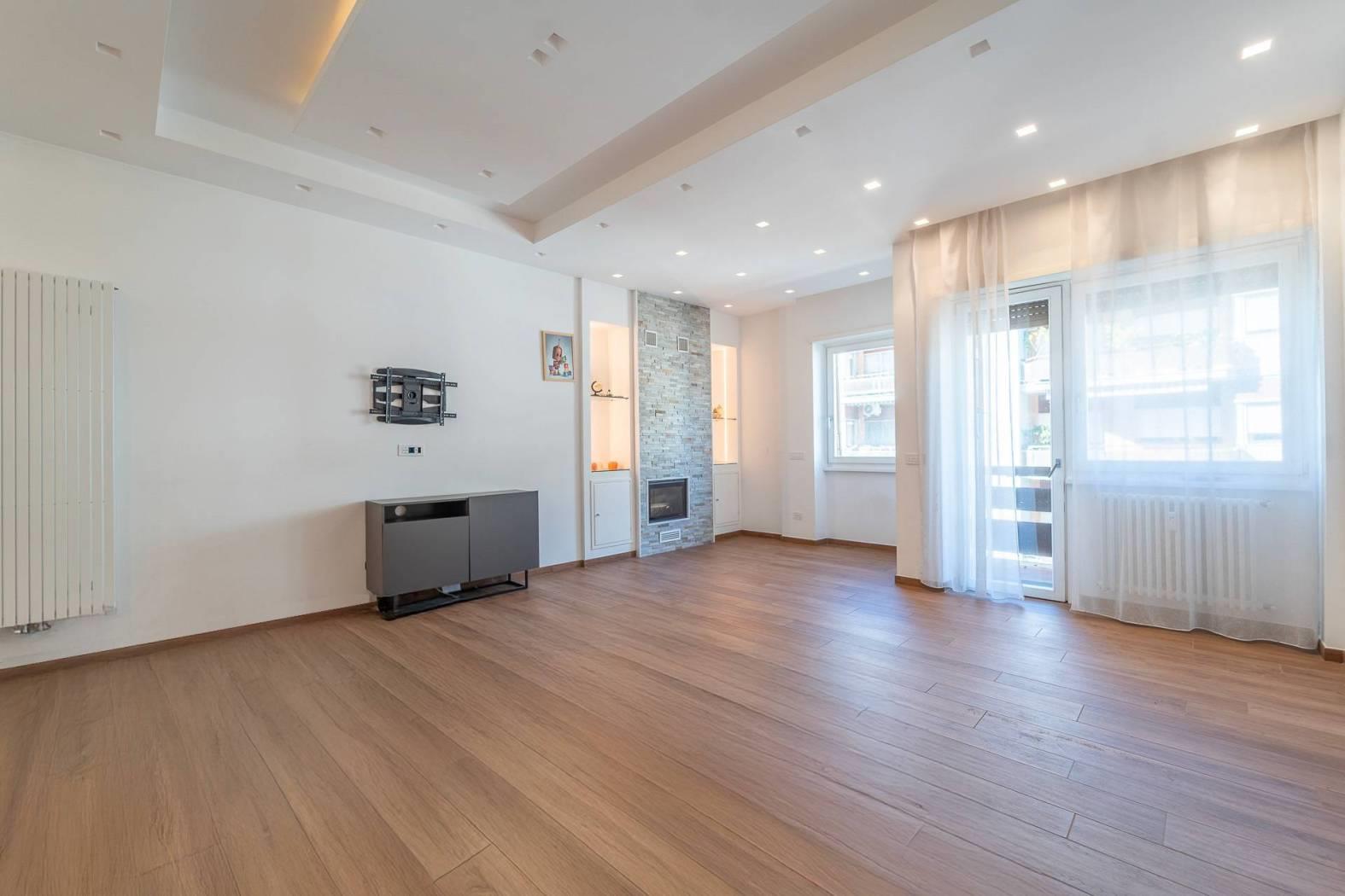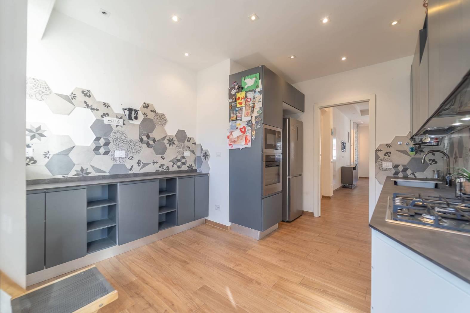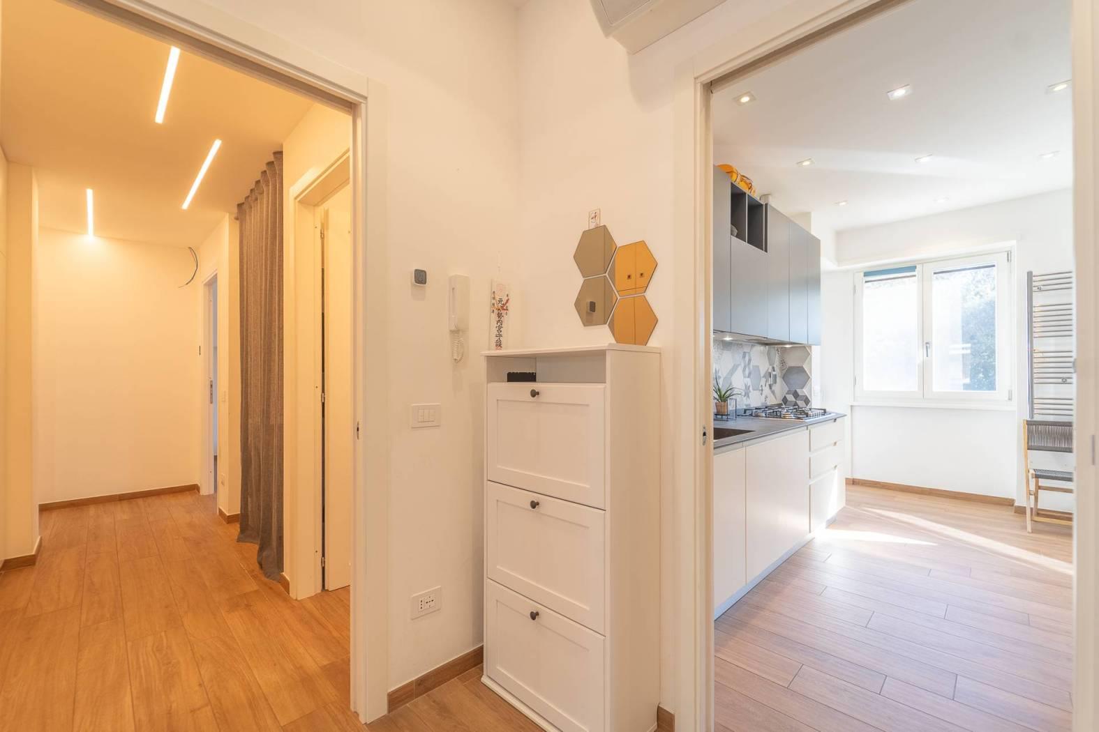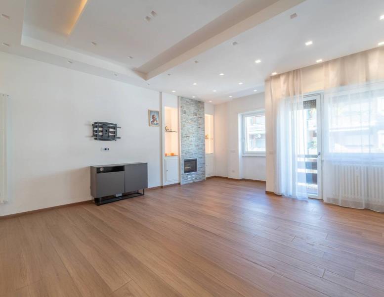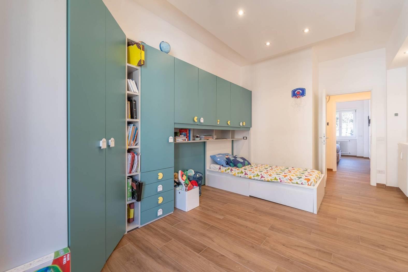 All’inizio del corridoio troviamo un primo bagno, finestrato con box doccia; proseguendo si accede alle due camere da letto, entrambe di generosa metratura. La camera patronale è dotata di cabina armadio e bagno privato, anch’esso finestrato e rifinito con materiali di pregio. La seconda camera ha accesso diretto allo stesso balcone del soggiorno, completando così la funzionalità della casa.