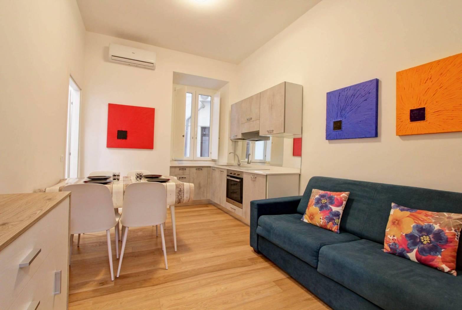 l'appartamento silenzioso luminoso composto da soggiorno pranzo con angolo cottura, camera matrimoniale e bagno.