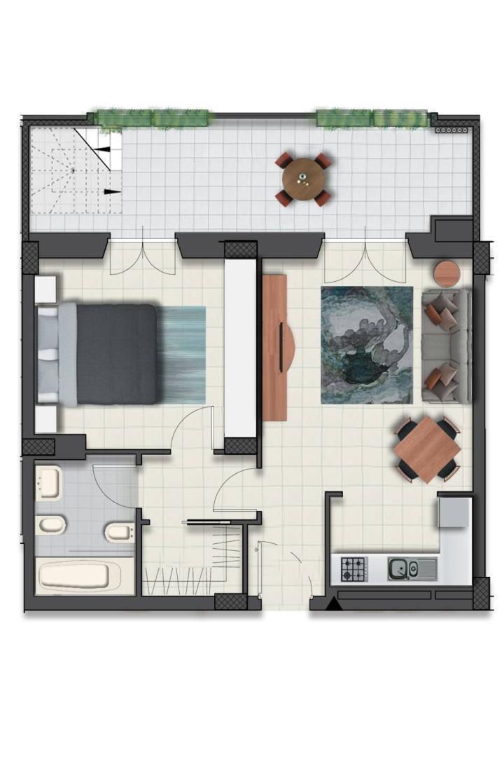Panoramico Attico di 58 mq interni composto da soggiorno con cucina a vista, camera da letto matrimoniale, servizi e balcone di 18 mq. Attraverso una scala interna si accede ad una panoramica terrazza di 71 mq.