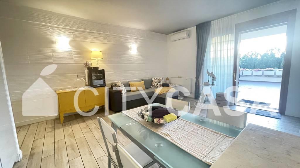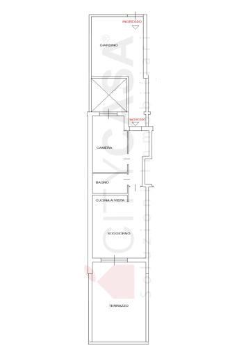 L'immobile, con Accesso Esterno indipendente che introduce alla proprietà tramite una piccola corte privata, dotata di giardinetto antistante l'Appartamento si trova al 2° piano, si compone di: Ingresso, Soggiorno con Cucina a Vista e accesso diretto al Terrazzo di Mq. 35 ca, Camera, Bagno con doccia. Completano la proprietà un Posto Auto Coperto di Mq.13 e una Cantina Asciutta di Mq. 3 nel Piano Seminterrato Condominiale, collegato direttamente dall'Ascensore.