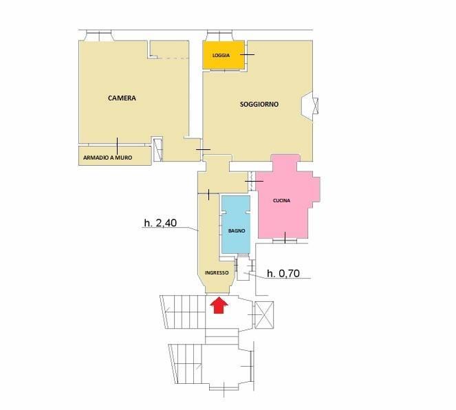 L’immobile, posto al terzo piano, ha una superficie di circa 68 mq catastali ed è composto da un soggiorno luminoso con camino, una spaziosa camera matrimoniale, cucina separata e bagno. Completa la proprietà una caratteristica piccola loggia coperta, ideale come spazio di sfogo o angolo relax.