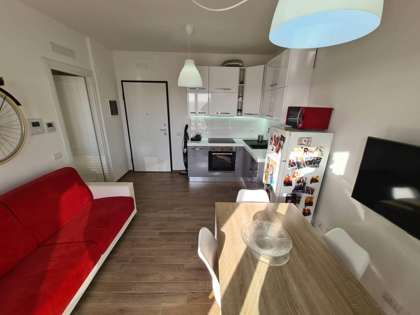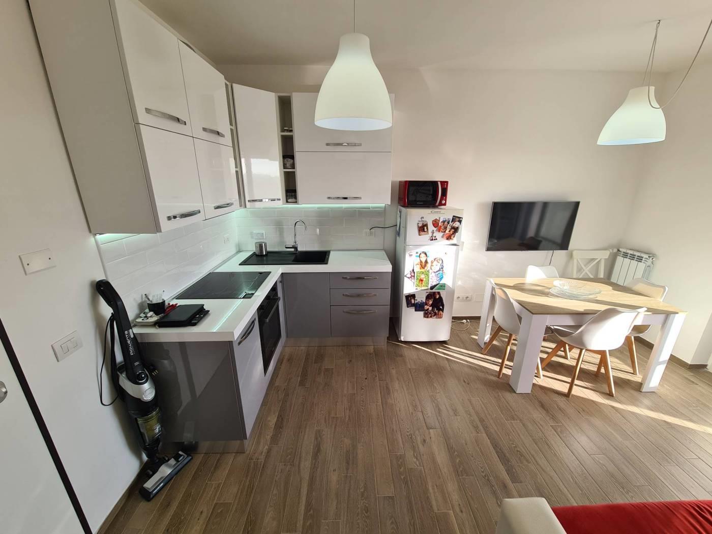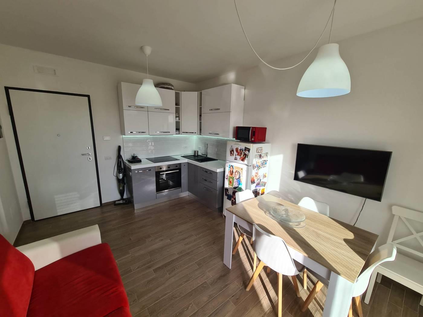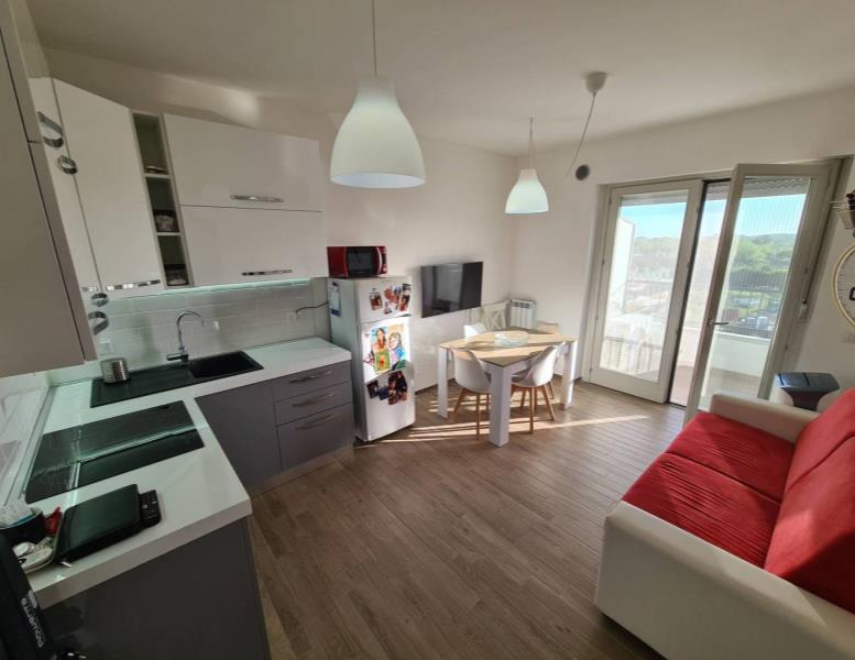 L'appartamento è composto da ingresso nel soggiorno con angolo cottura, una camera da letto e un bagno con cabina doccia, il terrazzo sono circa 10mq con vista panoramica.