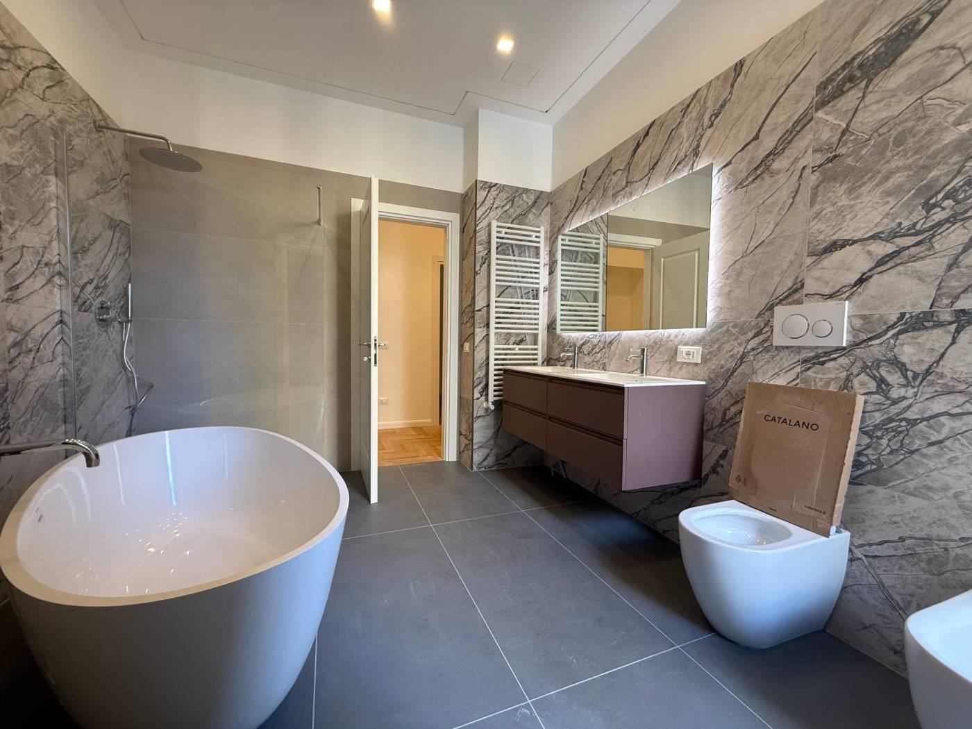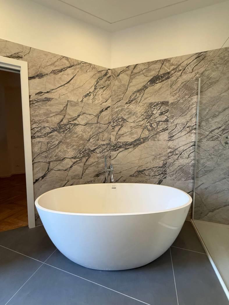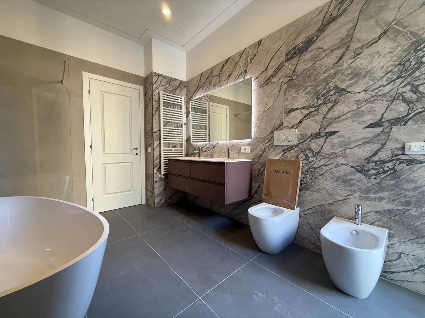 • Due bagni moderni, di cui uno padronale vera sala da bagno con vasca free standing e doccia walk-in, Rifiniti con materiali ricercati e di design