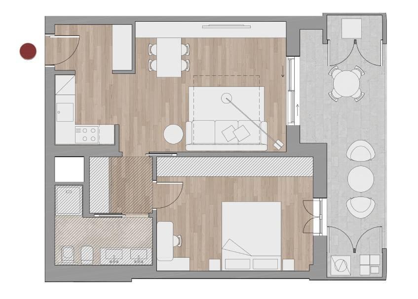 Il bilocale è progettato con una distribuzione razionale e accogliente. L’ingresso conduce a un living open‑space con cucina a vista, pensato per valorizzare la luce naturale e creare un ambiente conviviale. La zona giorno si apre su un ampio spazio esterno, ideale per vivere l’outdoor in ogni stagione. La camera matrimoniale è ben proporzionata e silenziosa, mentre il bagno, moderno e funzionale, completa una soluzione abitativa perfetta per single, giovani coppie o come pied‑à‑terre contemporaneo.