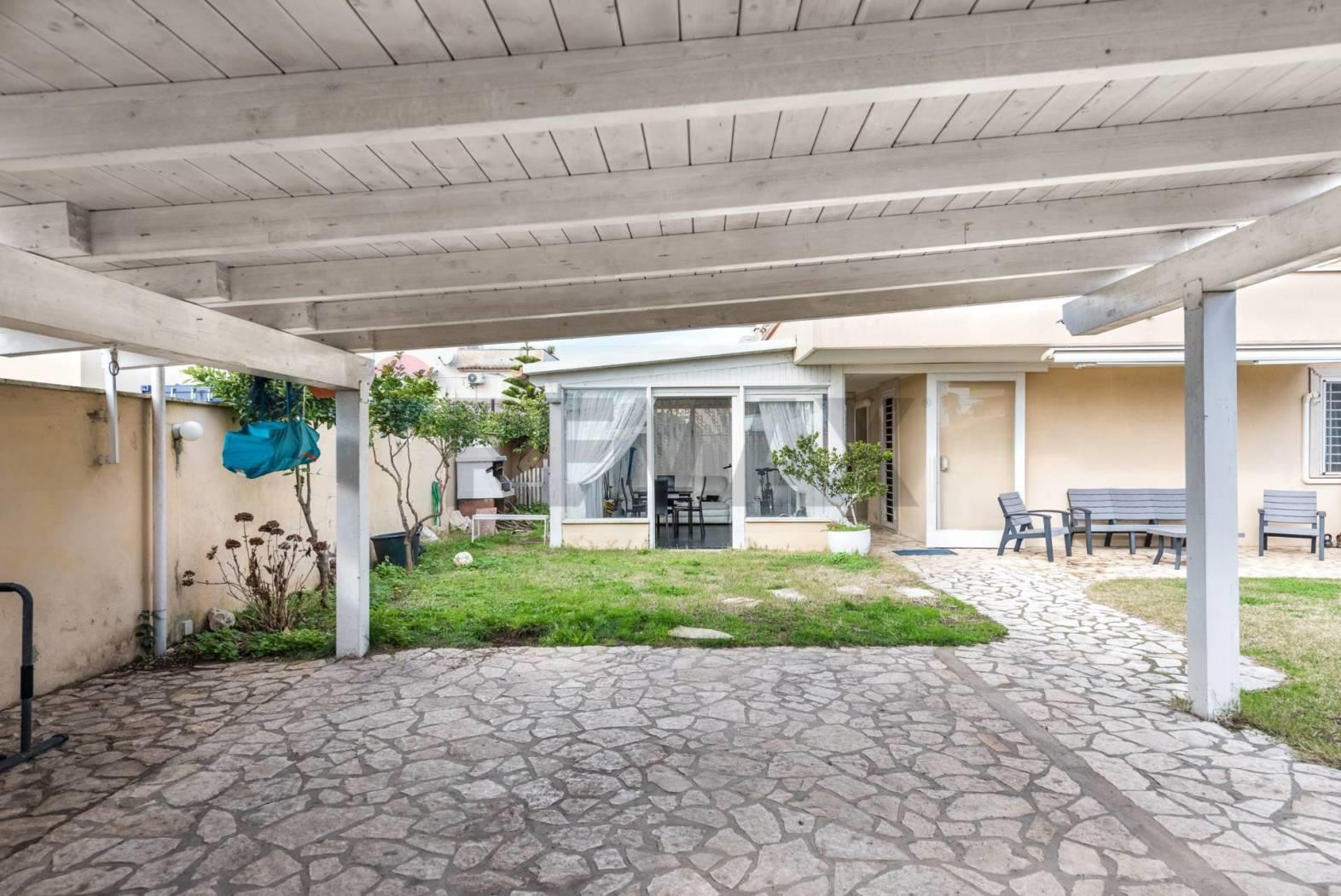 Gli spazi esterni rappresentano uno dei punti di forza della villa:comprendono posto auto coperto, area pavimentata, zona a prato con piante ornamentali e una veranda vetrata chiusa, ideale da vivere in ogni stagione dell'anno, perfetta per momenti di convivialità o per rilassarsi in famiglia.