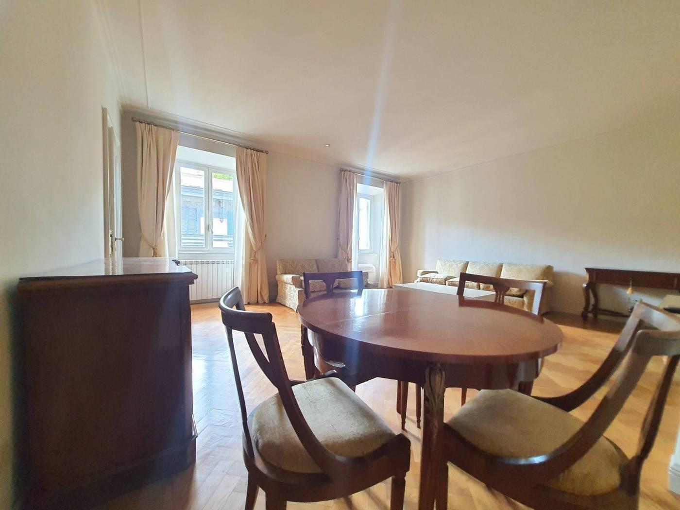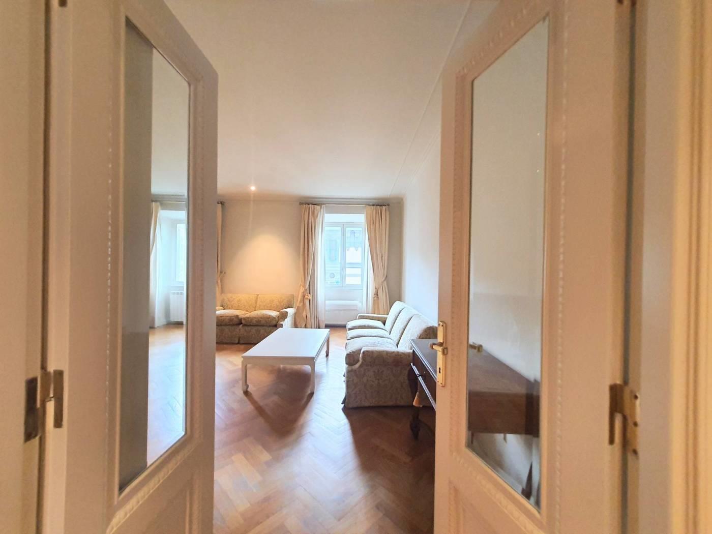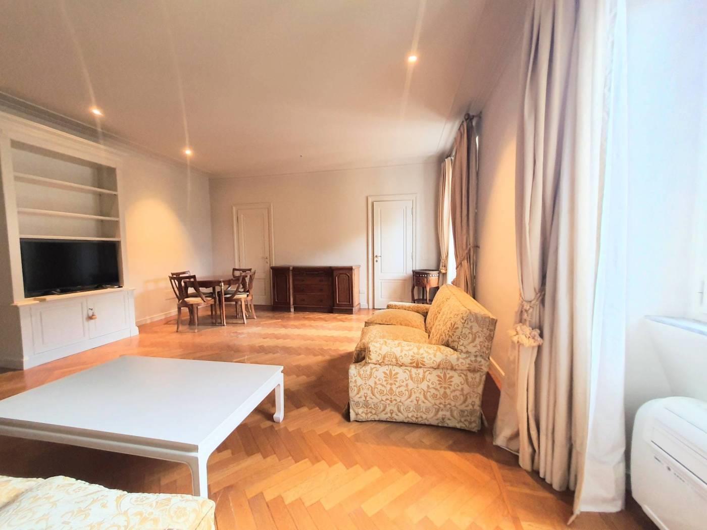 Prati, via Cola di Rienzo, a few steps from piazza del Popolo, elegant apartment, bright and quiet, on the fifth floor in period building with porter service, restored and furnished, consisting of entrance, double living room with two windows with walk-in wardrobe and laundry room, bedroom, live-in kitchen, bathroom with window and shower. The apartment is equipped with A/C and autonomous heating.