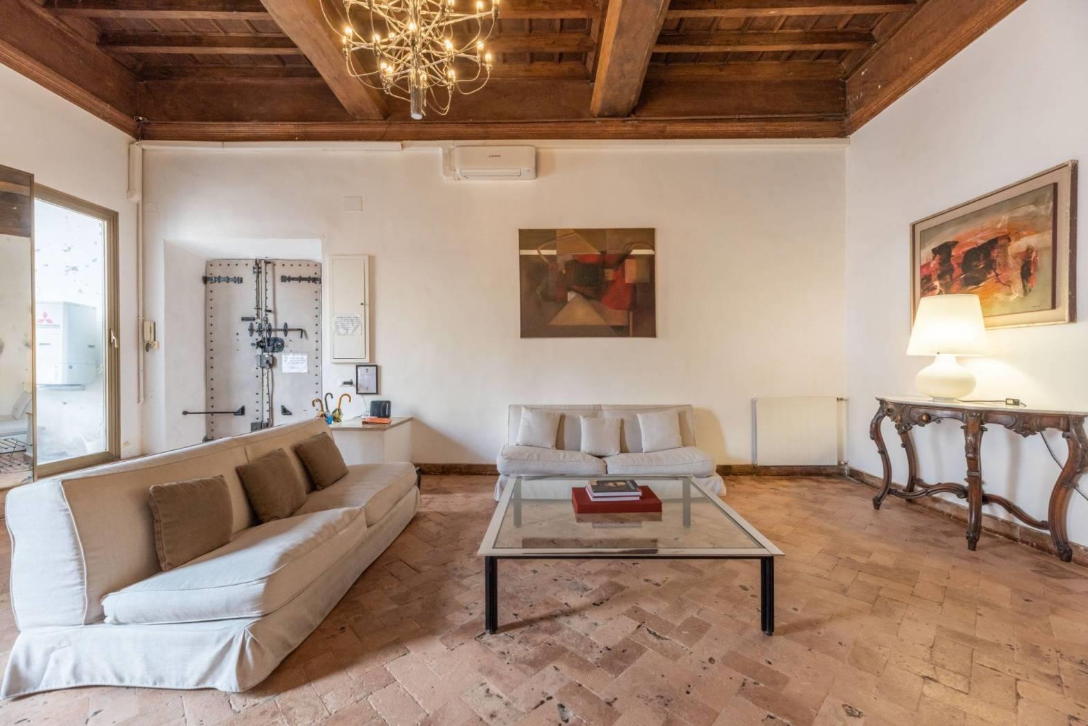 L’accesso alla residenza avviene comodamente tramite ascensore o dalle eleganti scale interne. La proprietà vanta ampie e luminose stanze, soffitti alti oltre quattro metri, alcuni a cassettoni e altri a volta, e due camini funzionanti in marmo e travertino che aggiungono un tocco di raffinatezza. I pavimenti storici del ’600 sono stati restaurati con cura, preservando il fascino originario dell’epoca.