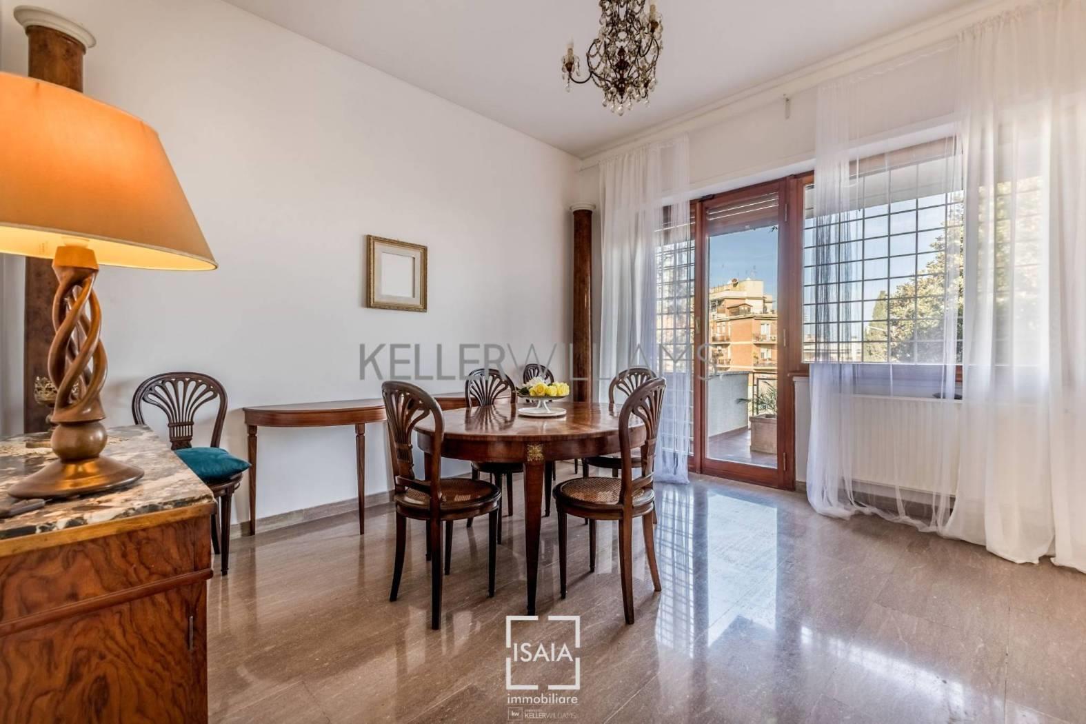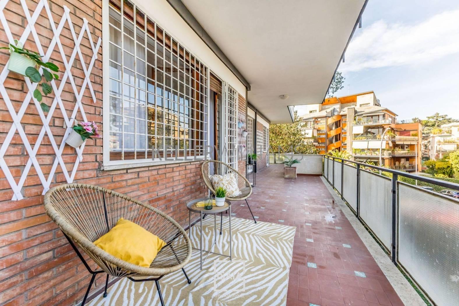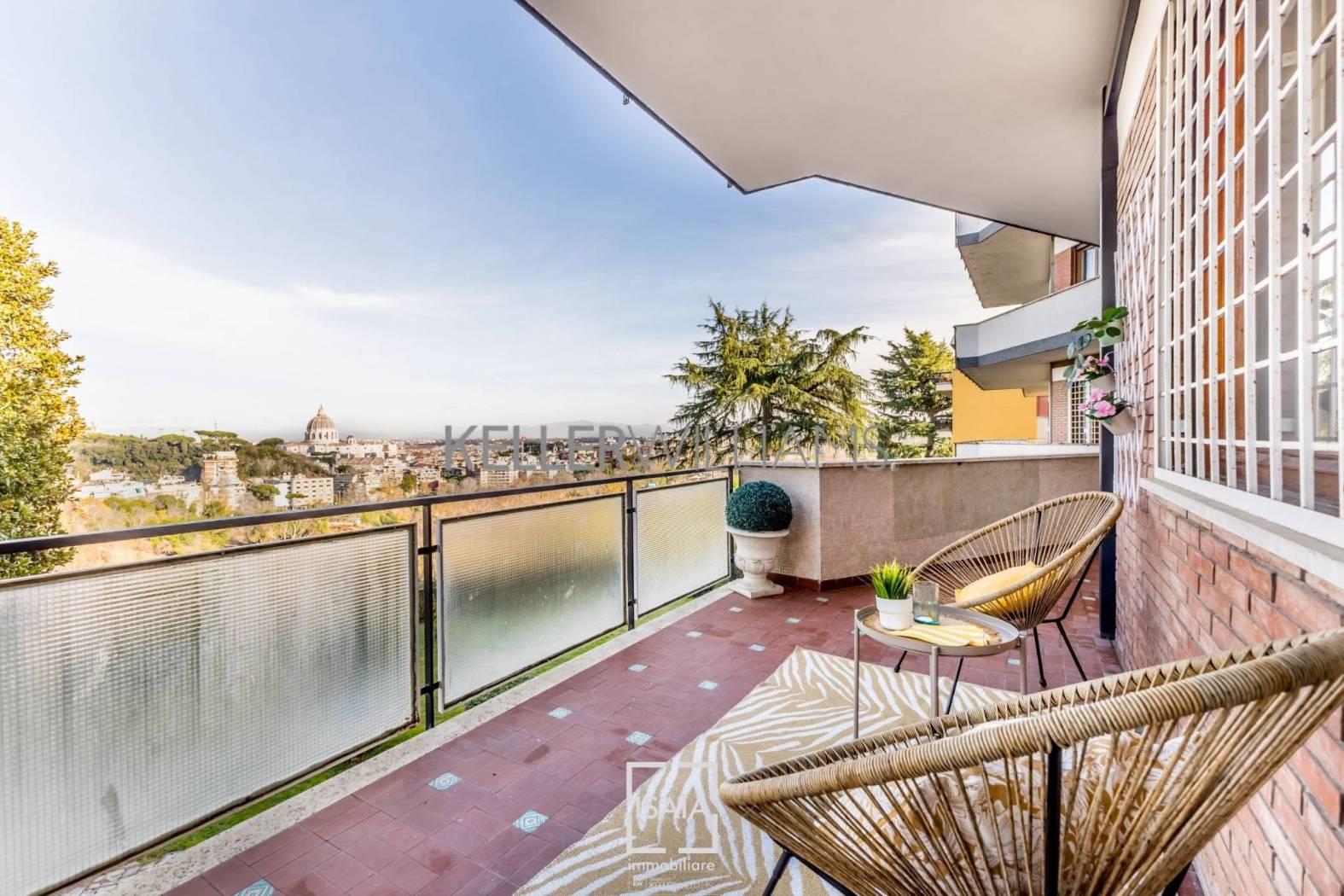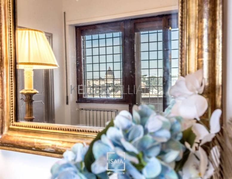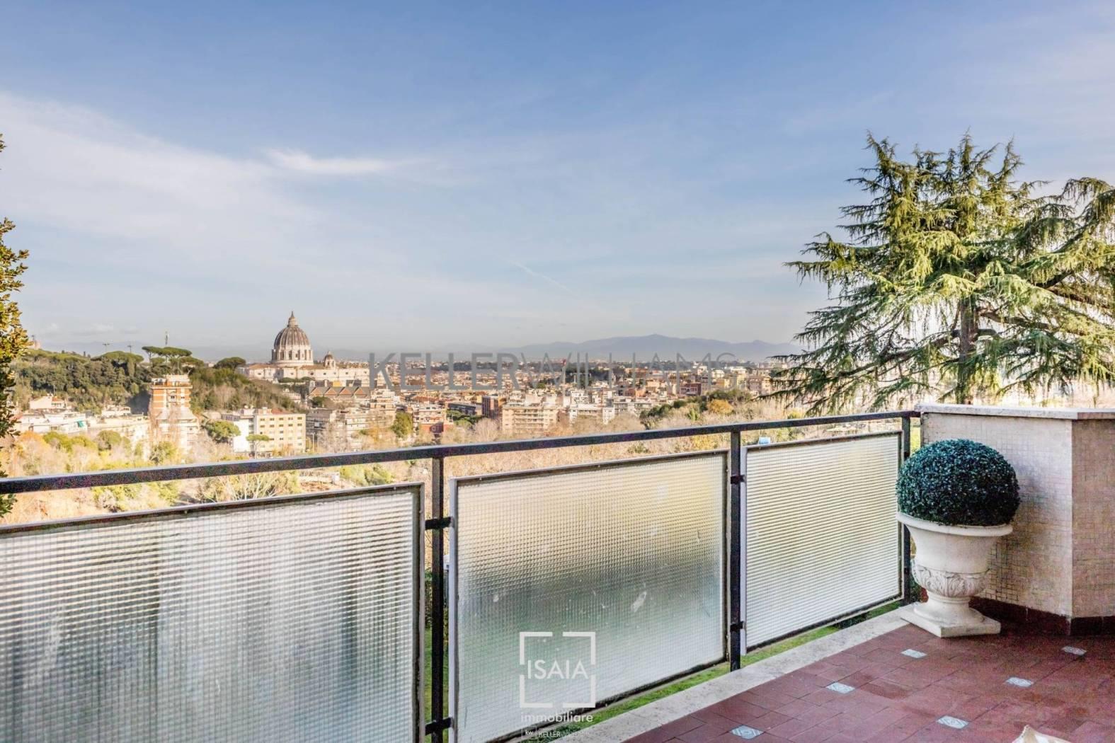 L'immobile di grandi dimensioni, oltre 230 metri interni più circa 60 di terrazzi, è composto da ingresso con camera guardaroba, salone triplo comprensivo di zona pranzo e grande terrazzo con affaccio panoramico in direzione della Città del Vaticano ed il “Cupolone”, tre camere da letto padronali, due bagni uno con vasca ed uno con doccia, camera studio, oltre a zona di servizio con spazio di lavoro, cucina abitabile, bagnetto, cameretta, ripostiglio, disimpegno con zona armadi ed ingresso di secondario.