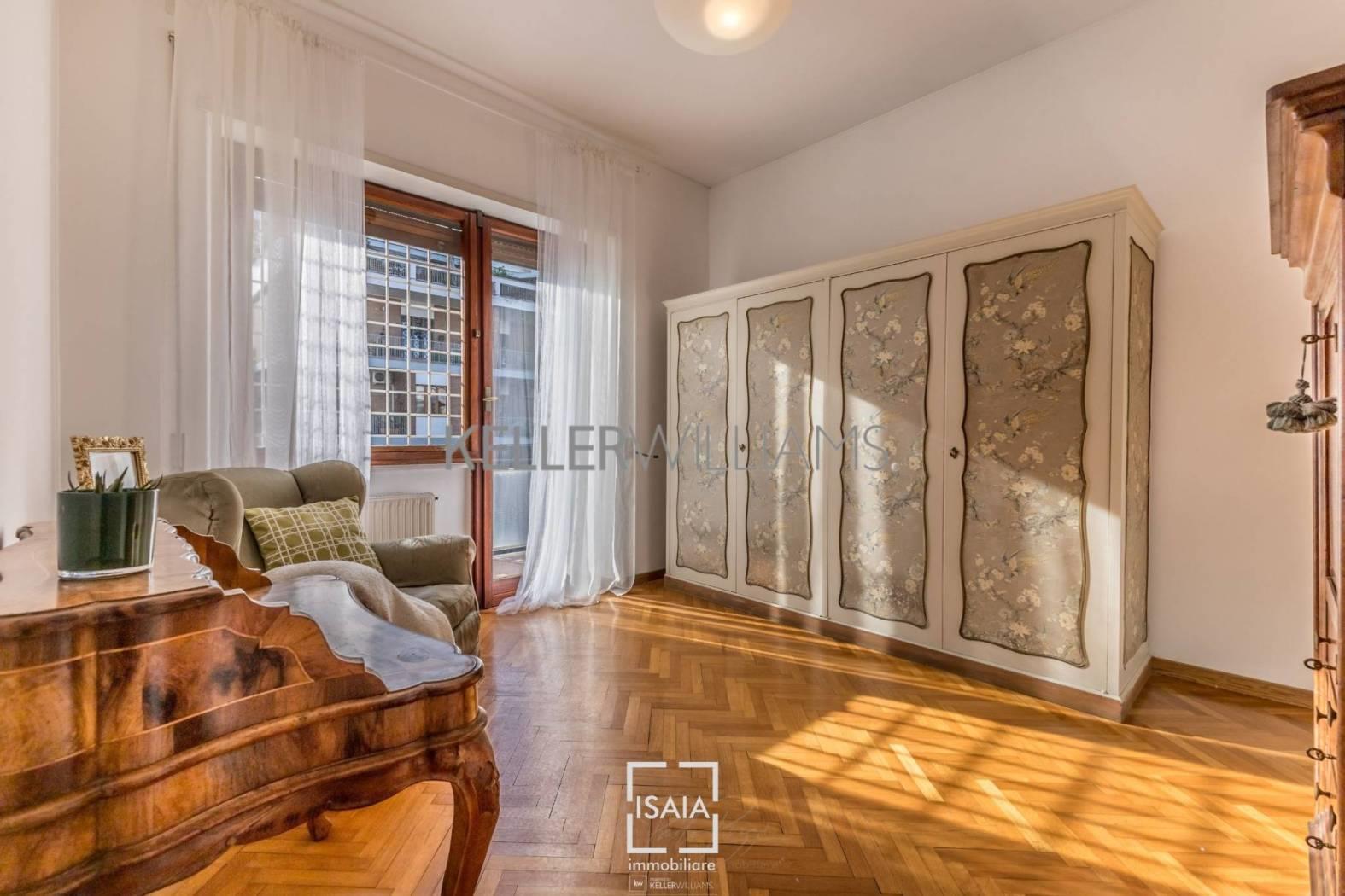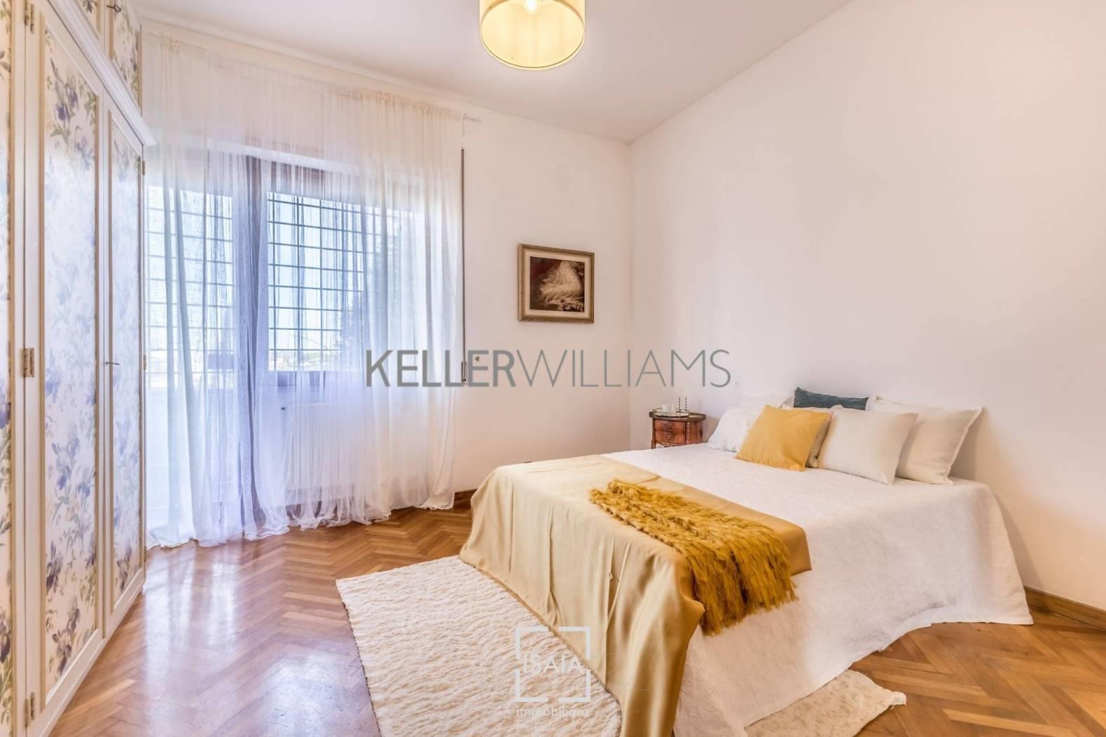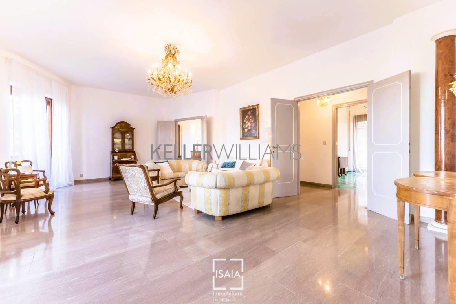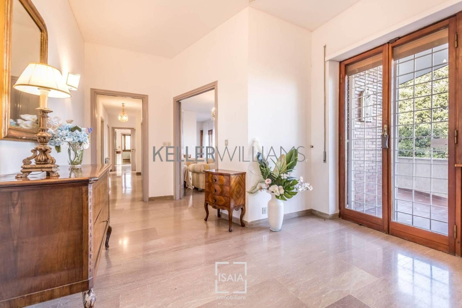 L'immobile di grandi dimensioni, oltre 230 metri interni più circa 60 di terrazzi, è composto da ingresso con camera guardaroba, salone triplo comprensivo di zona pranzo e grande terrazzo con affaccio panoramico in direzione della Città del Vaticano ed il “Cupolone”, tre camere da letto padronali, due bagni uno con vasca ed uno con doccia, camera studio, oltre a zona di servizio con spazio di lavoro, cucina abitabile, bagnetto, cameretta, ripostiglio, disimpegno con zona armadi ed ingresso di secondario.