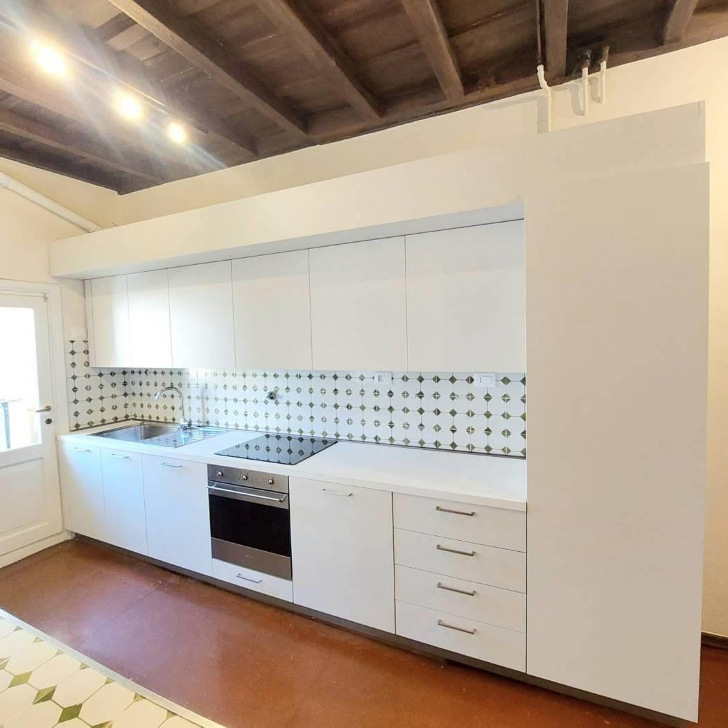 La cucina abitabile, funzionale e ben organizzata, che affaccia su un comodo terrazzino, si integra perfettamente con il resto dell’abitazione, risultando ideale sia per l’uso quotidiano sia per momenti conviviali.