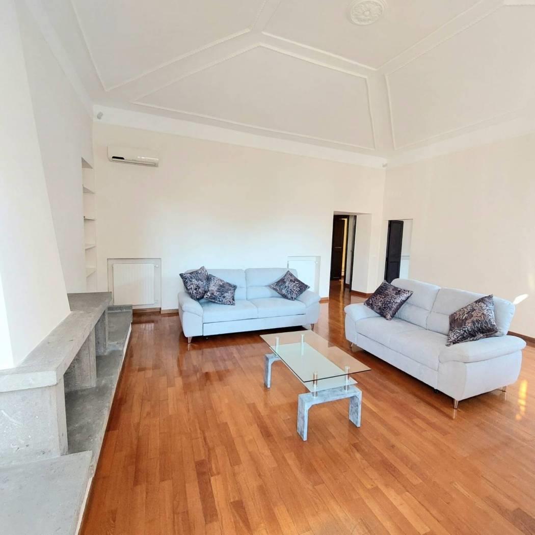 L’ingresso, ampio e scenografico, introduce armoniosamente agli ambienti della casa. Il salone, luminoso e di rappresentanza, è impreziosito da un camino, elemento raro e di grande fascino nel contesto urbano del centro storico.
