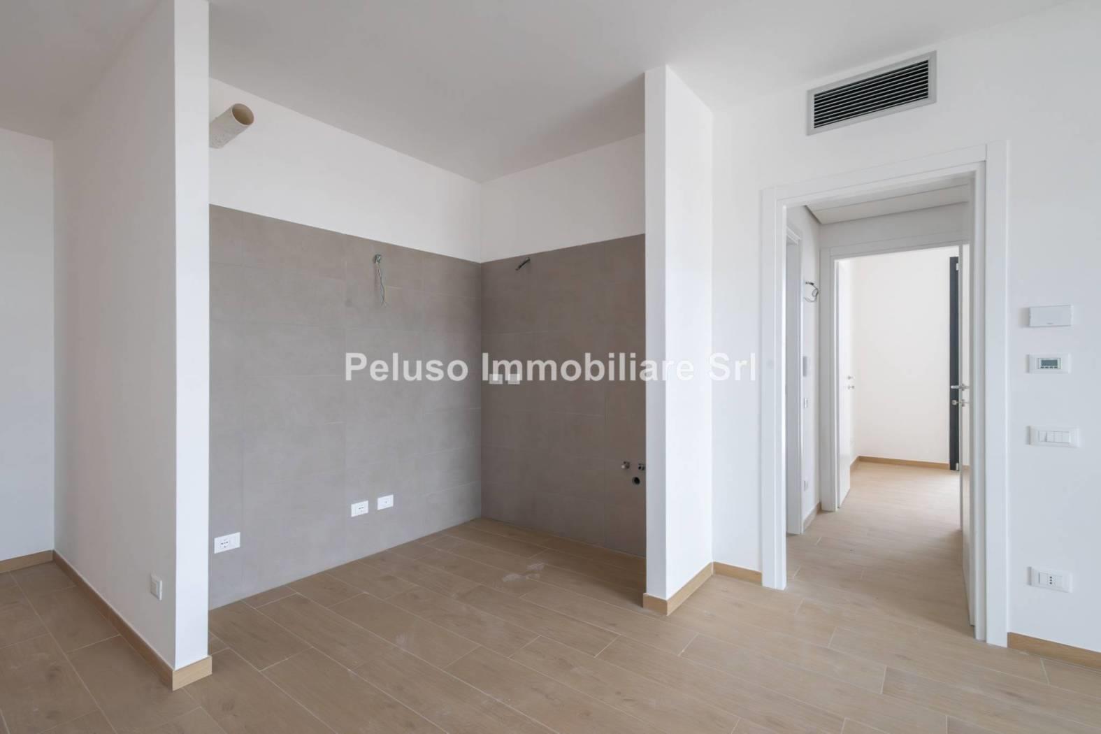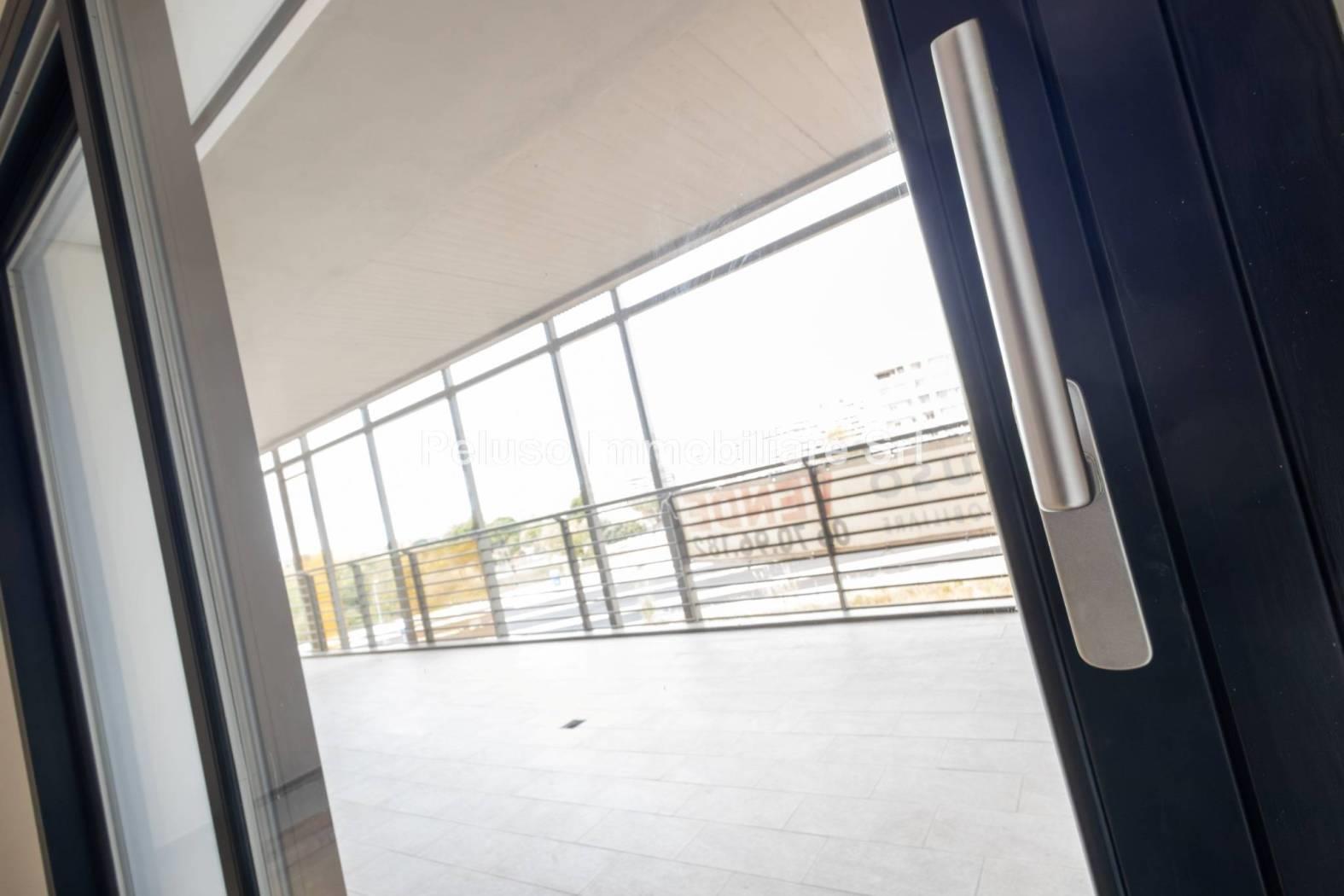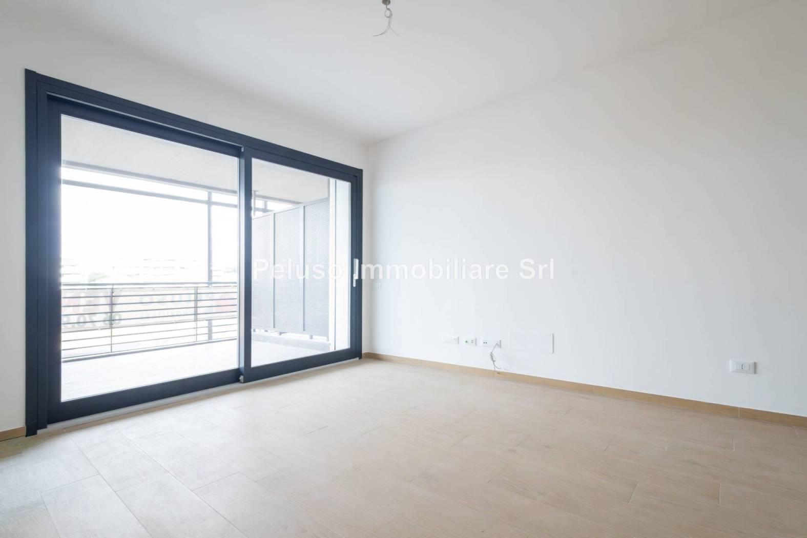 L'ingresso si apre sulla zona living con angolo cottura. Dall'ampia porta finestra si accede al terrazzo angolare esposto a ovest di circa 47 mq