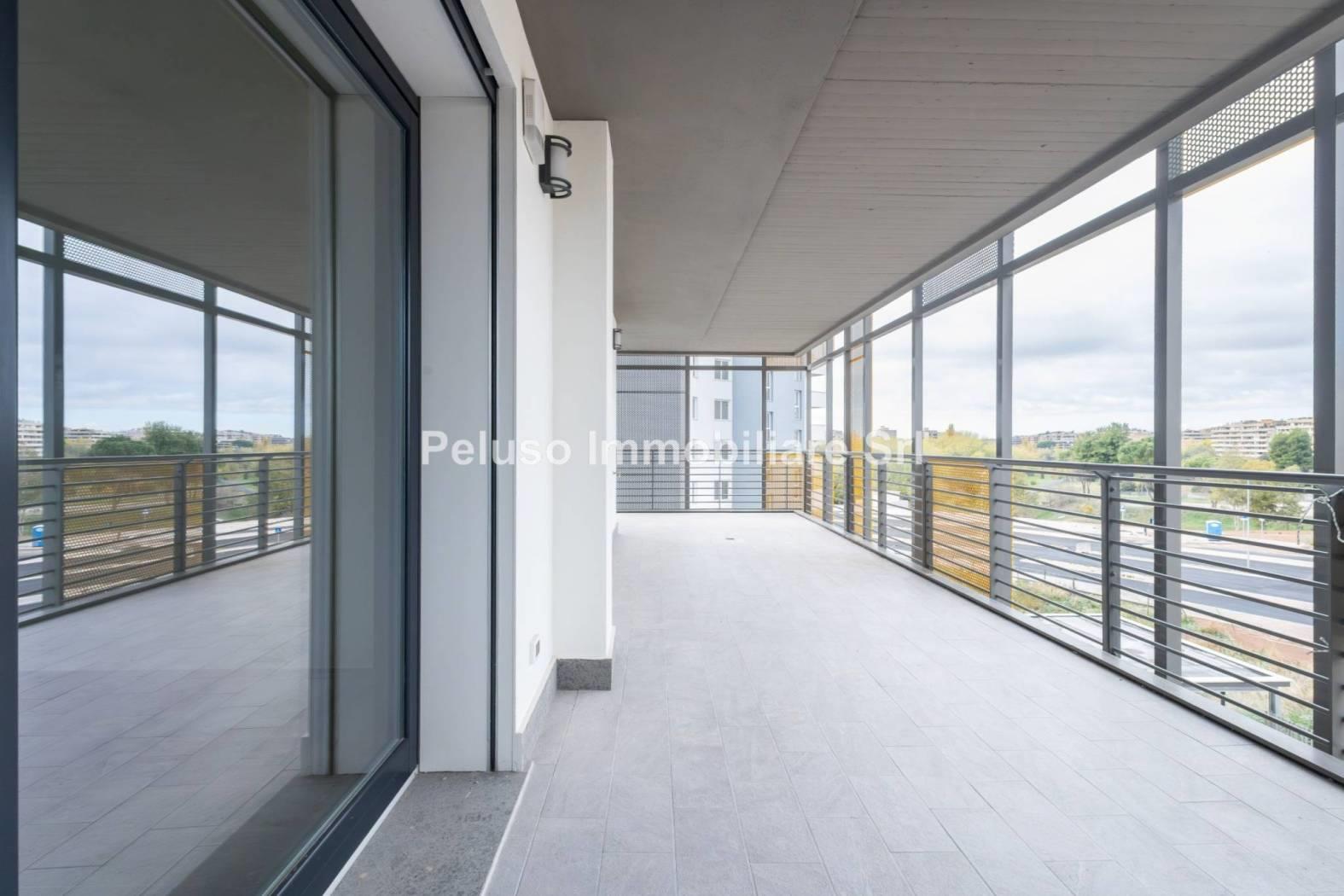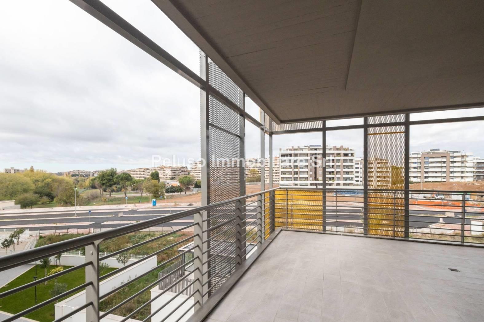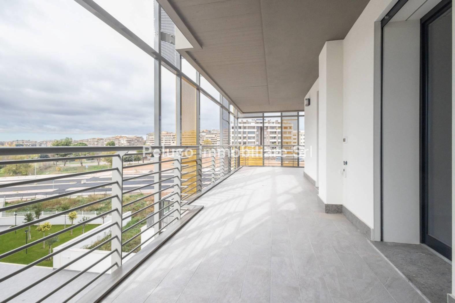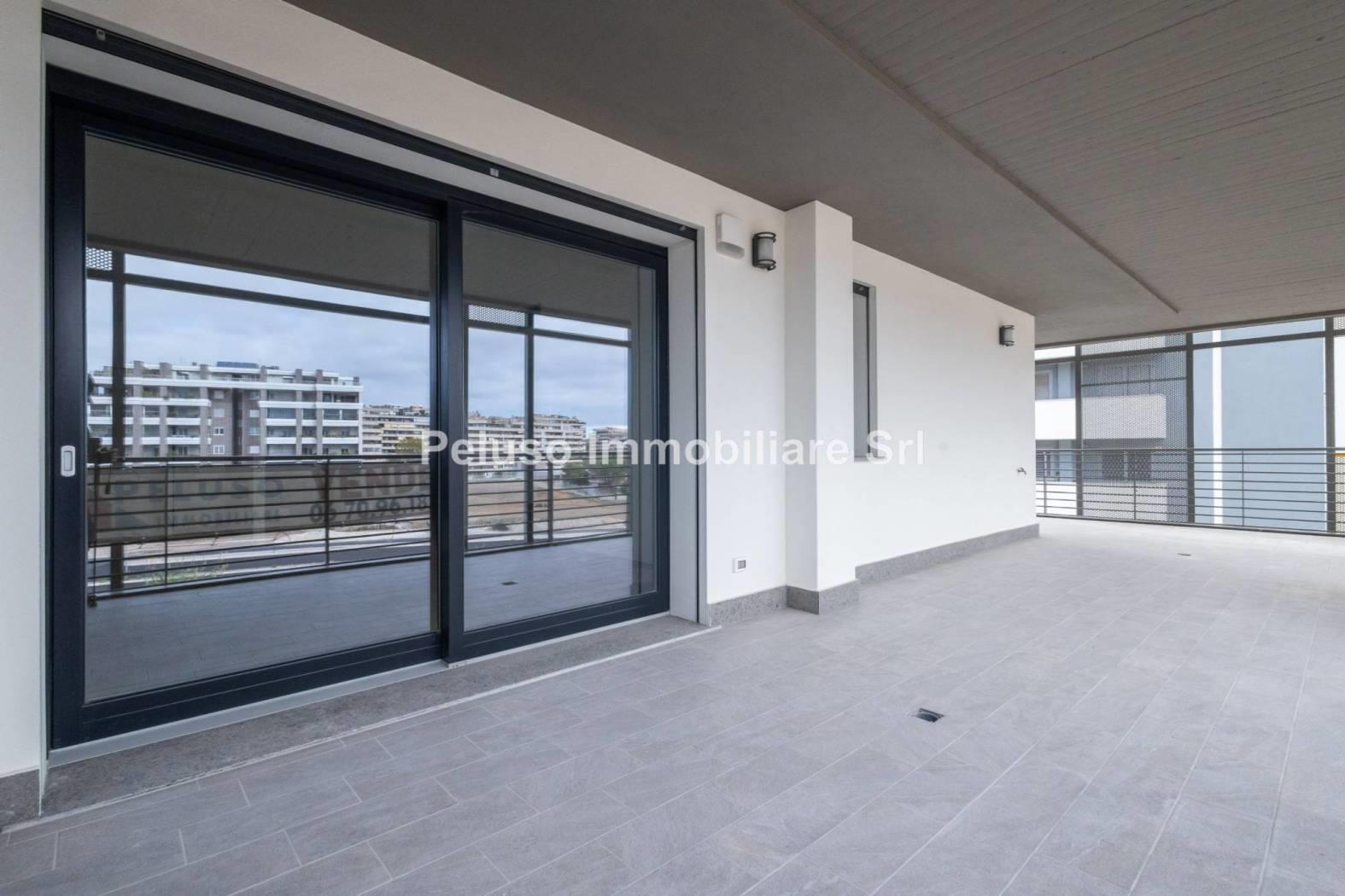 L'ingresso si apre sulla zona living con angolo cottura. Dall'ampia porta finestra si accede al terrazzo angolare esposto a ovest di circa 47 mq