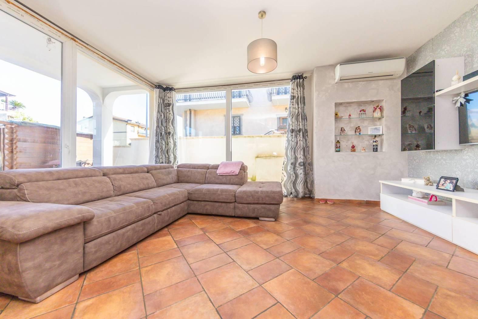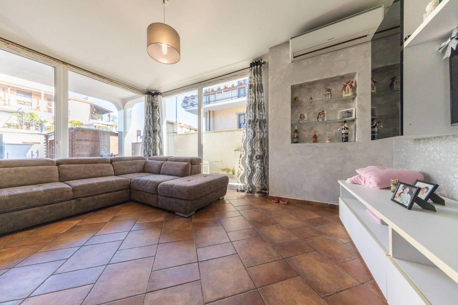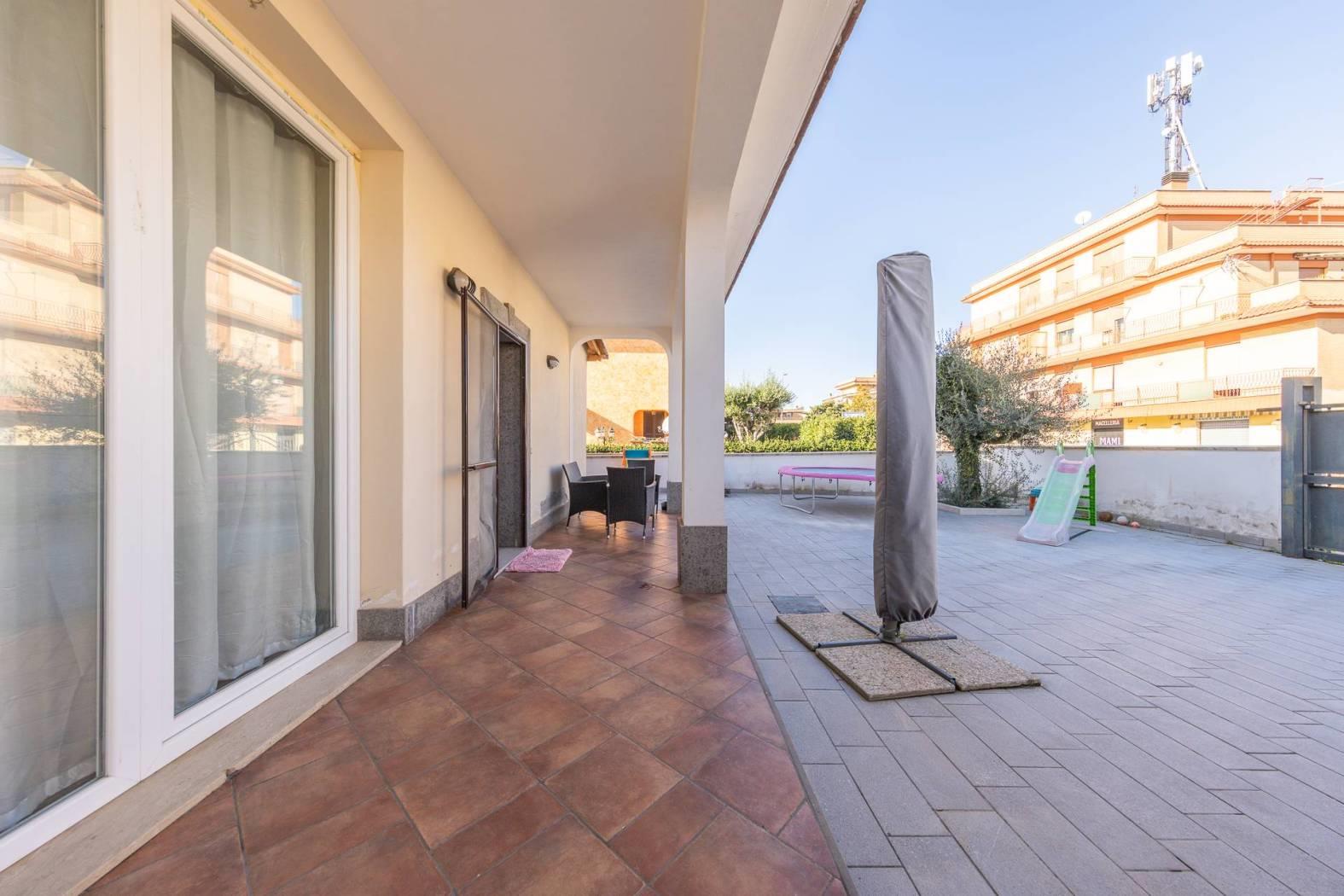 Impreziosito dalla presenza di un ampio spazio esterno mattonato l'appartamento gode di un entrata indipendente e la possibilità di parcheggiare varie auto all'interno del proprio spazio privato. Internamente troviamo una spaziosa zona living con cucina a vista e serra solare che dona un'immensa luminosità e un ottimo spazio di zona giorno. Il disimpegno ci conduce alla zona notte dove sono presenti ben tre camere da letto, tutte matrimoniali, e di cui una con cabina armadio, ed un grandissimo bagno di quasi 10 mq, facilmente divisibile in due distinti bagni oppure per il secondo bagno può essere ottenuto ripristinandolo all'interno della zona attualmente adibita a cabina armadio. L'appartamento in perfette condizioni non necessita di interventi è bensì pronto per essere abitato.