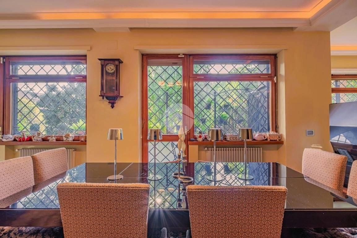 La zona di rappresentanza si apre con un ampio ingresso, un raffinato salone e una confortevole area relax, impreziosita da una parete interamente vetrata che regala una splendida vista sul parco.