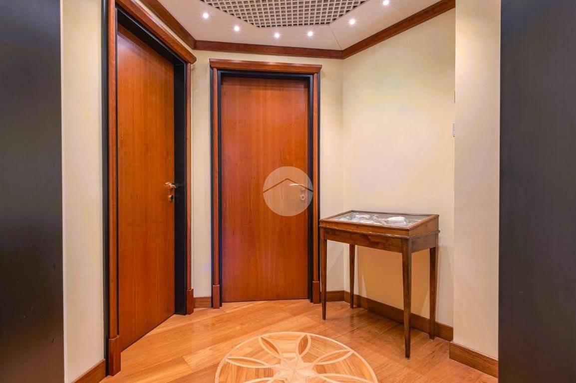 La zona giorno comprende inoltre una cucina abitabile e un’area di servizio con lavanderia, studio e bagno. Un disimpegno circolare conduce alla zona notte, composta da due camere matrimoniali e doppi servizi. La suite padronale è arricchita da una cabina armadio e da bagno privato.