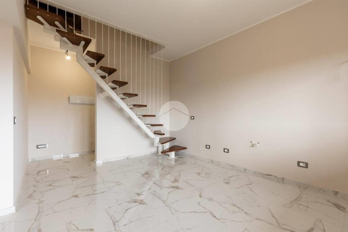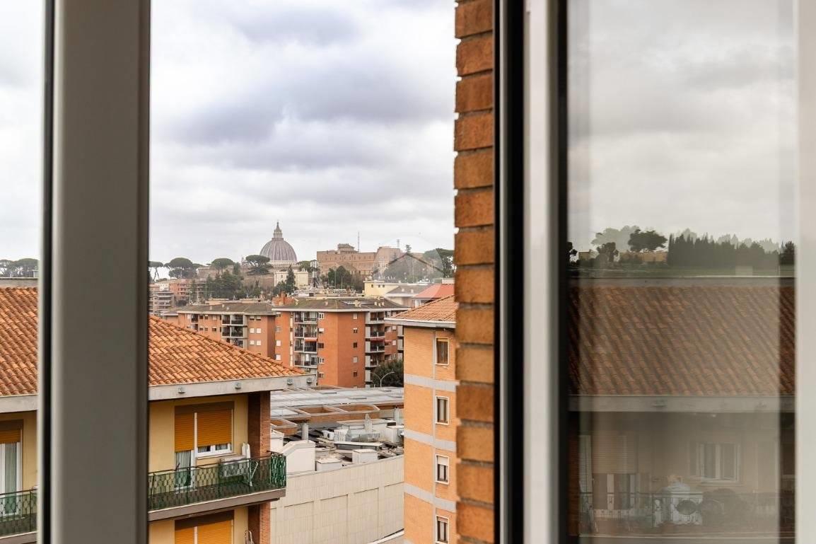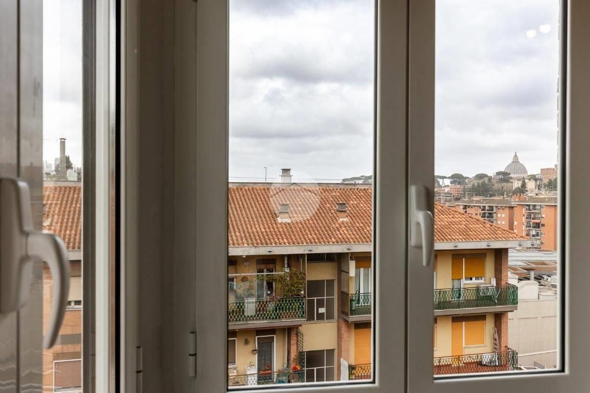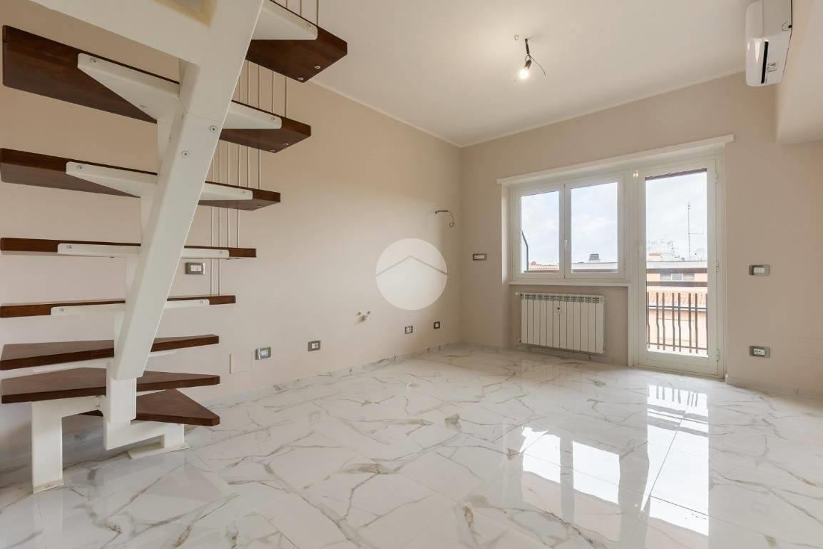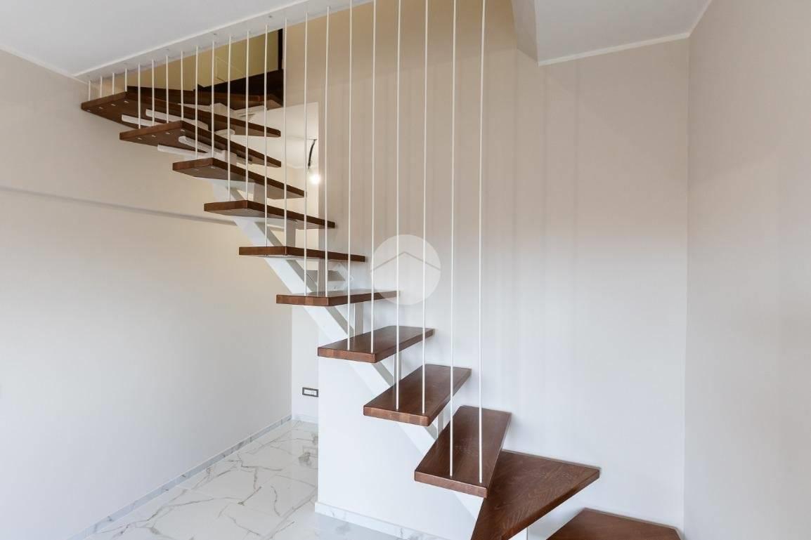 L'appartamento si sviluppa su due livelli con una funzionale separazione della zona notte e zona giorno. All'ingresso ci accoglie un salone doppio rivestito in gres effetto marmo, con una prima porzione climatizzata destinata all'angolo cottura e con accesso ad un balcone completamente ripavimentato; seconda parte anch'essa climatizzata, con affacio aperto, scorcio su San Pietro e accesso ad un ampio bagno: rivestimento in gres effetto marmo scuro, vasca, mobile lavabo e specchio digitale retroilluminato a led. Tramite una scala in ferro bianco e legno massello accediamo alla zona notte completamente rivestita in parquet iroko composta di due camere anch'esse climatizzate e accesso ad un altro balcone.