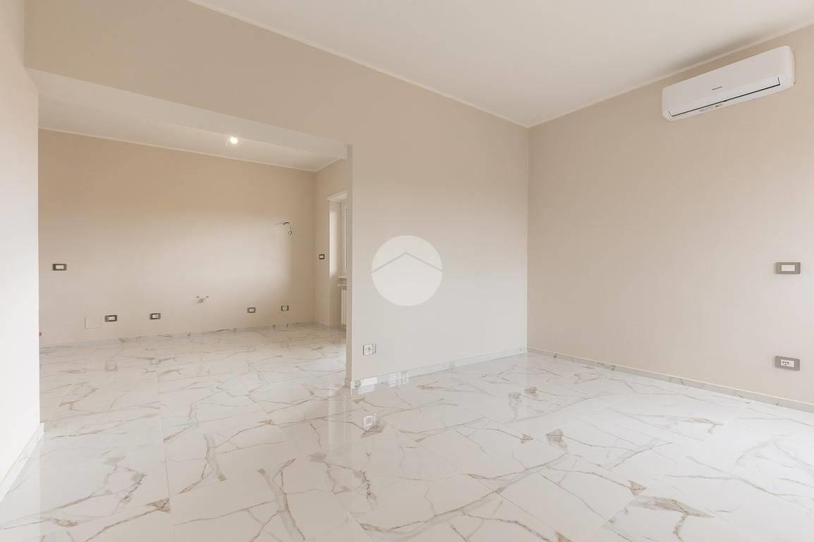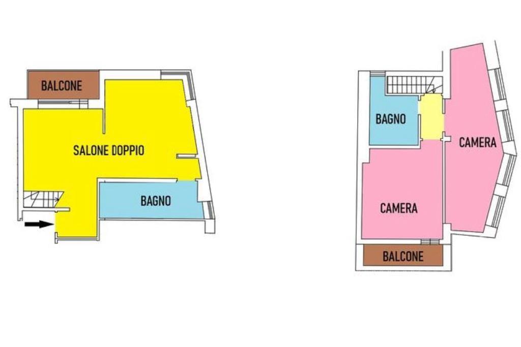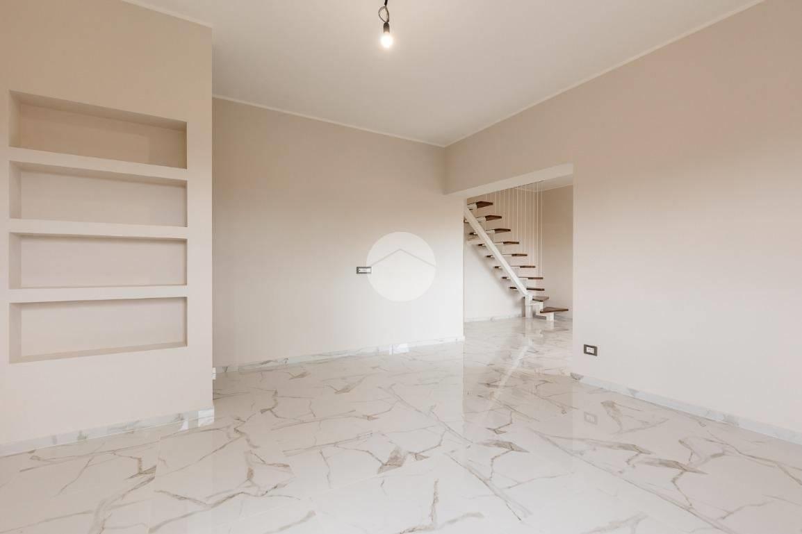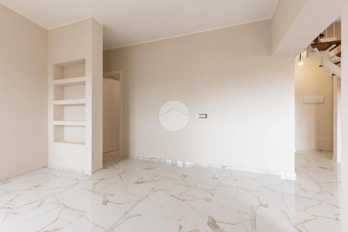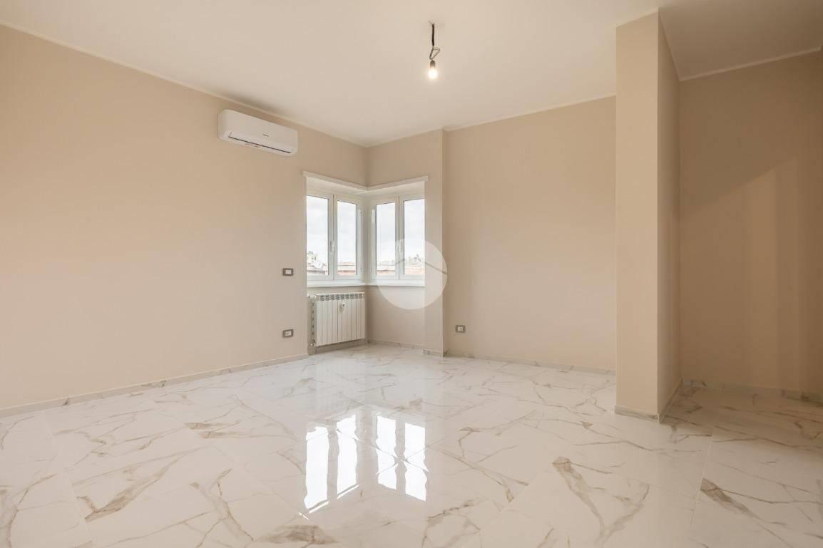 L'appartamento si sviluppa su due livelli con una funzionale separazione della zona notte e zona giorno. All'ingresso ci accoglie un salone doppio rivestito in gres effetto marmo, con una prima porzione climatizzata destinata all'angolo cottura e con accesso ad un balcone completamente ripavimentato; seconda parte anch'essa climatizzata, con affacio aperto, scorcio su San Pietro e accesso ad un ampio bagno: rivestimento in gres effetto marmo scuro, vasca, mobile lavabo e specchio digitale retroilluminato a led. Tramite una scala in ferro bianco e legno massello accediamo alla zona notte completamente rivestita in parquet iroko composta di due camere anch'esse climatizzate e accesso ad un altro balcone.