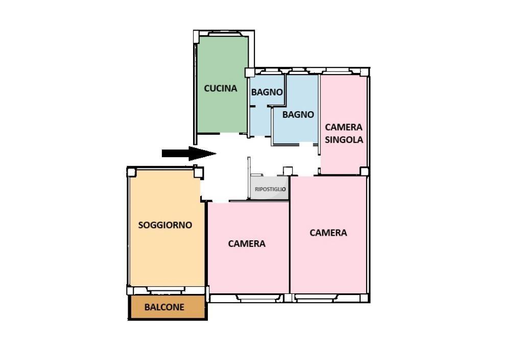 Internamente l’appartamento si compone di soggiorno con balcone, ampia cucina abitabile, due camere matrimoniali, una camera singola, due bagni completi con finestra e un ripostiglio.