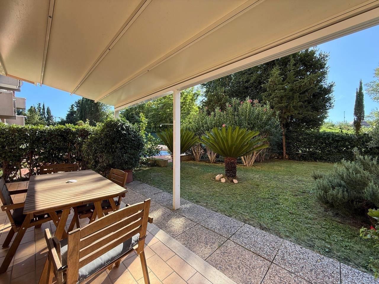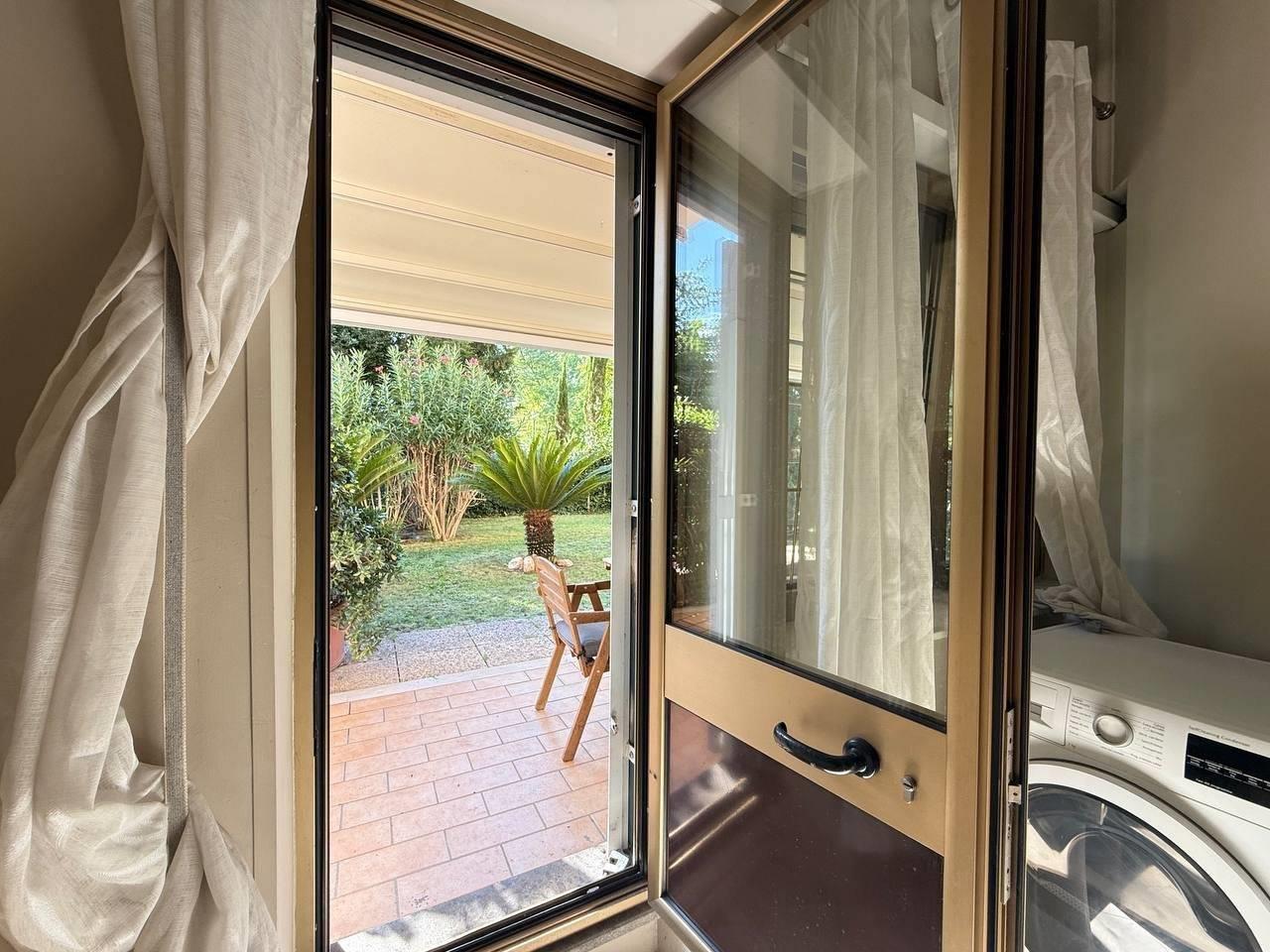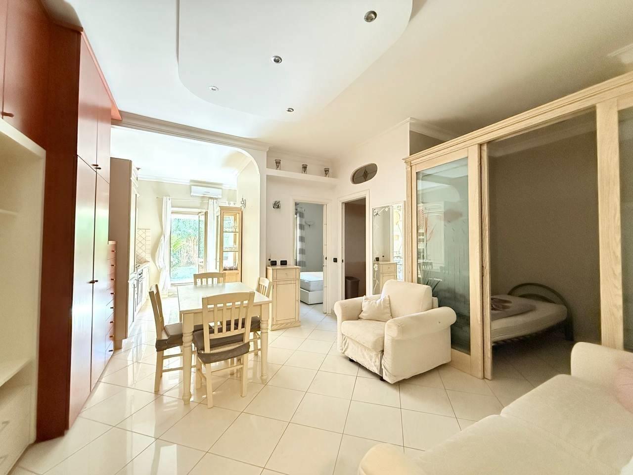 L'appartamento si presenta catastalmente al piano terra ed è composto da salone con cucina a vista, una camera matrimoniale, zona studio, un servizio e terrazzo con affaccio sul giardino condominiale.
