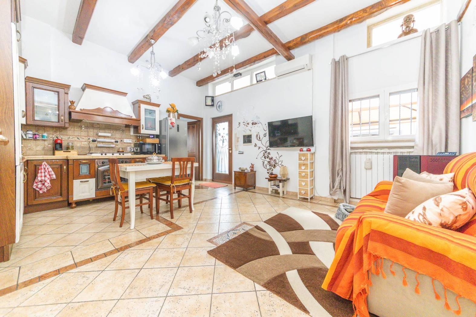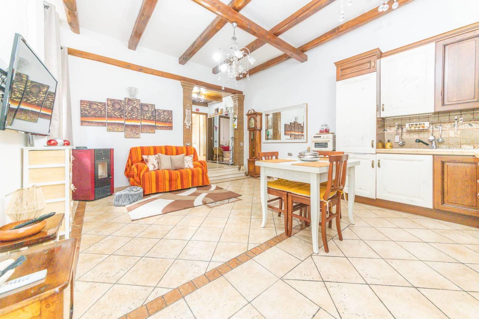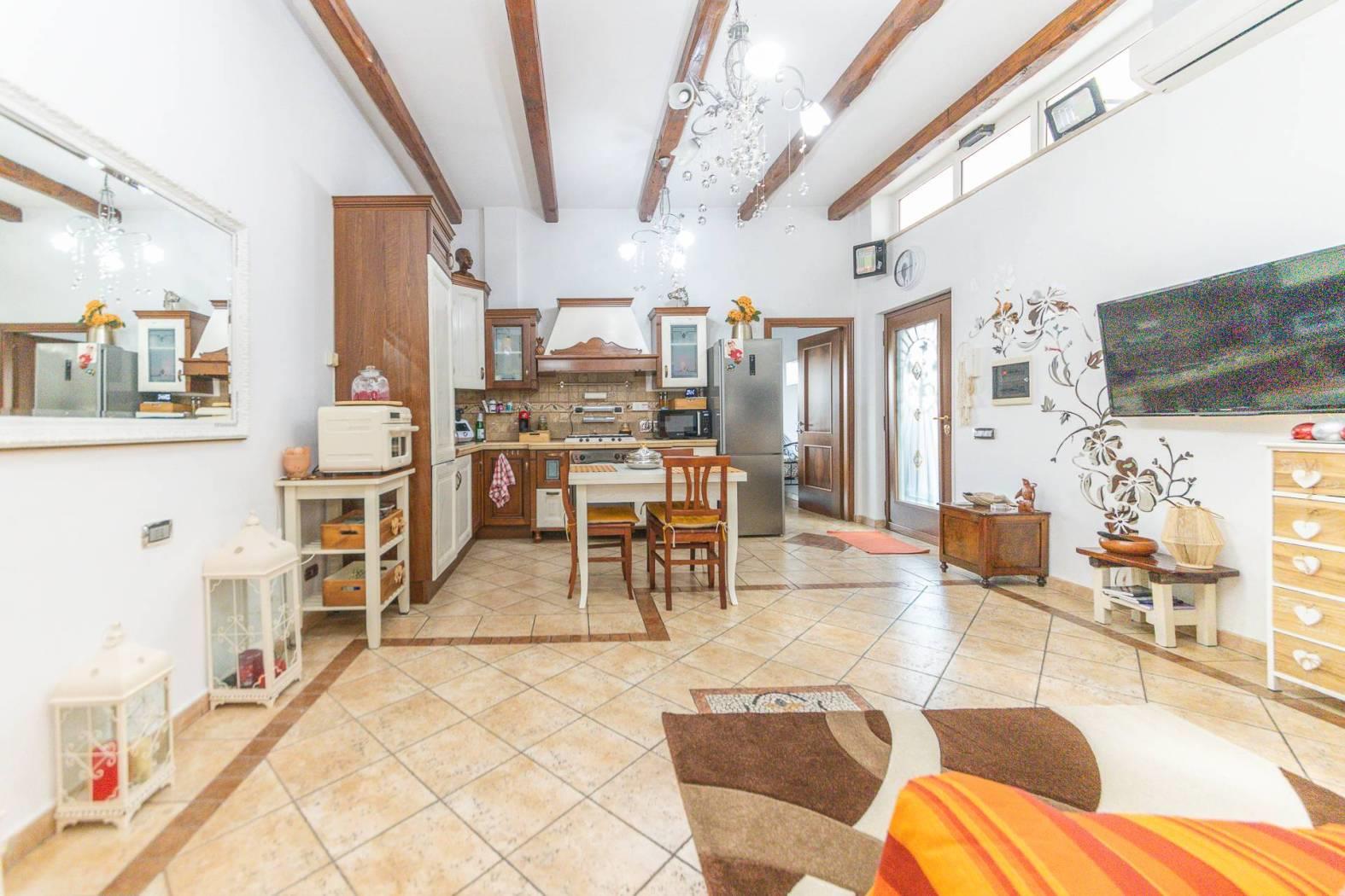L'immobile è composto da: Salone con cucina a vista, 2 camere da letto, ampia camera con zona soppalcata calpestabile e e bagno privato, giardino mattonato perimetrale, con accesso carrabile, di circa 200mq.