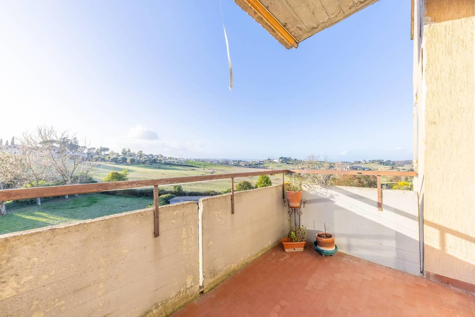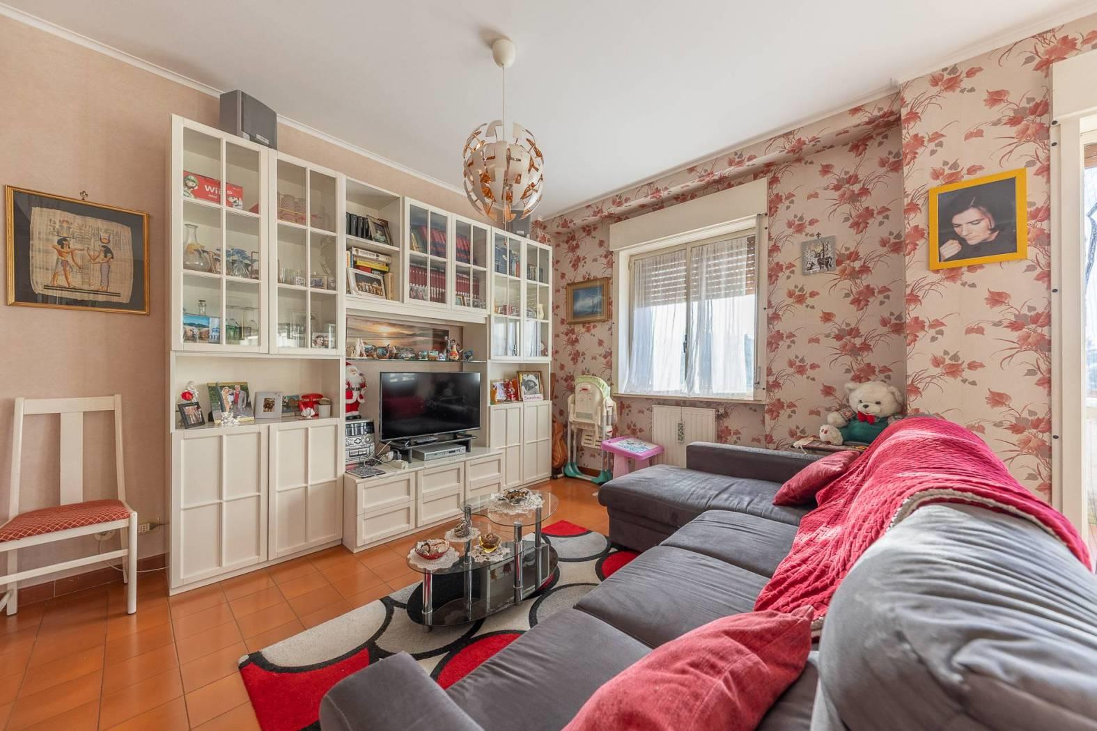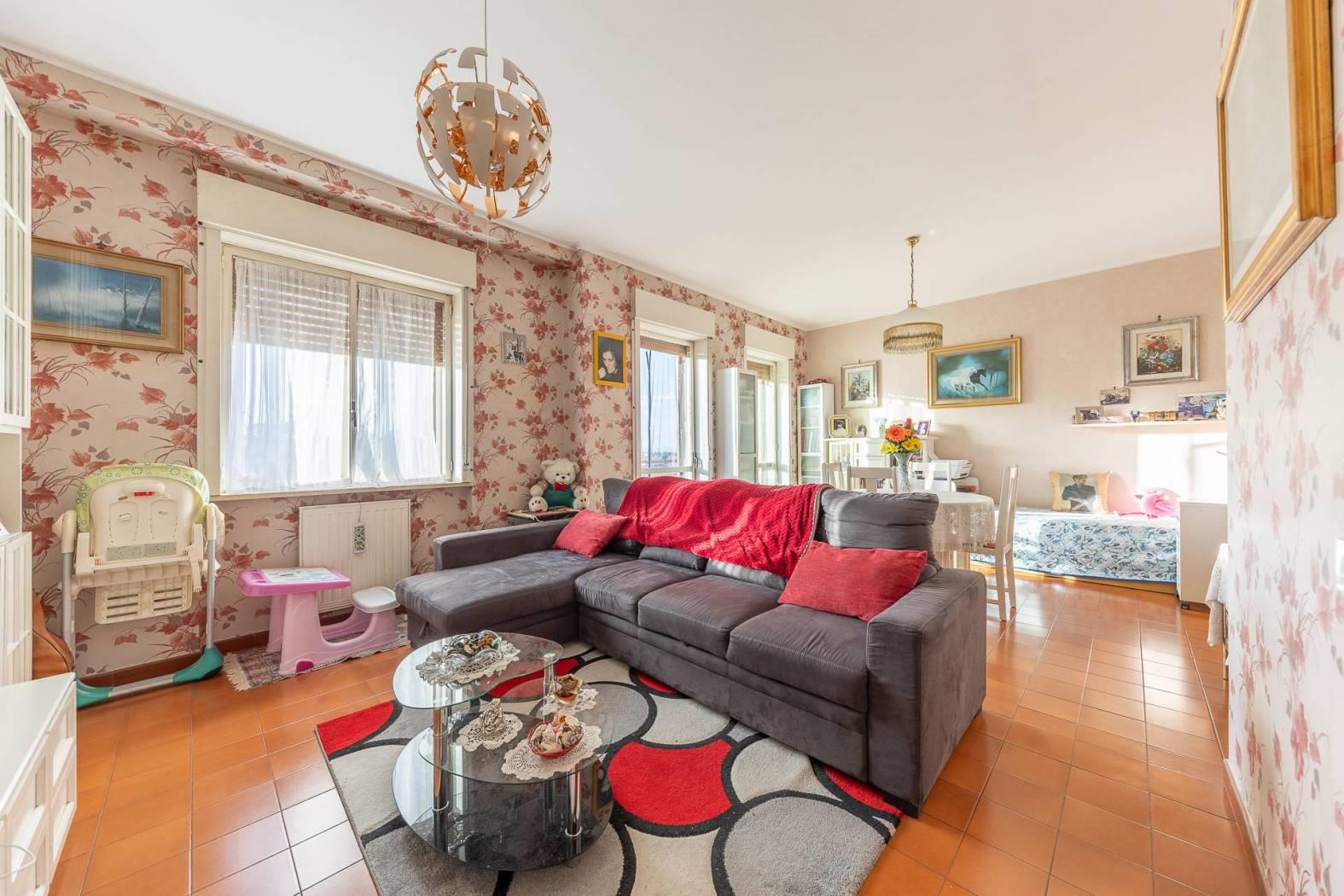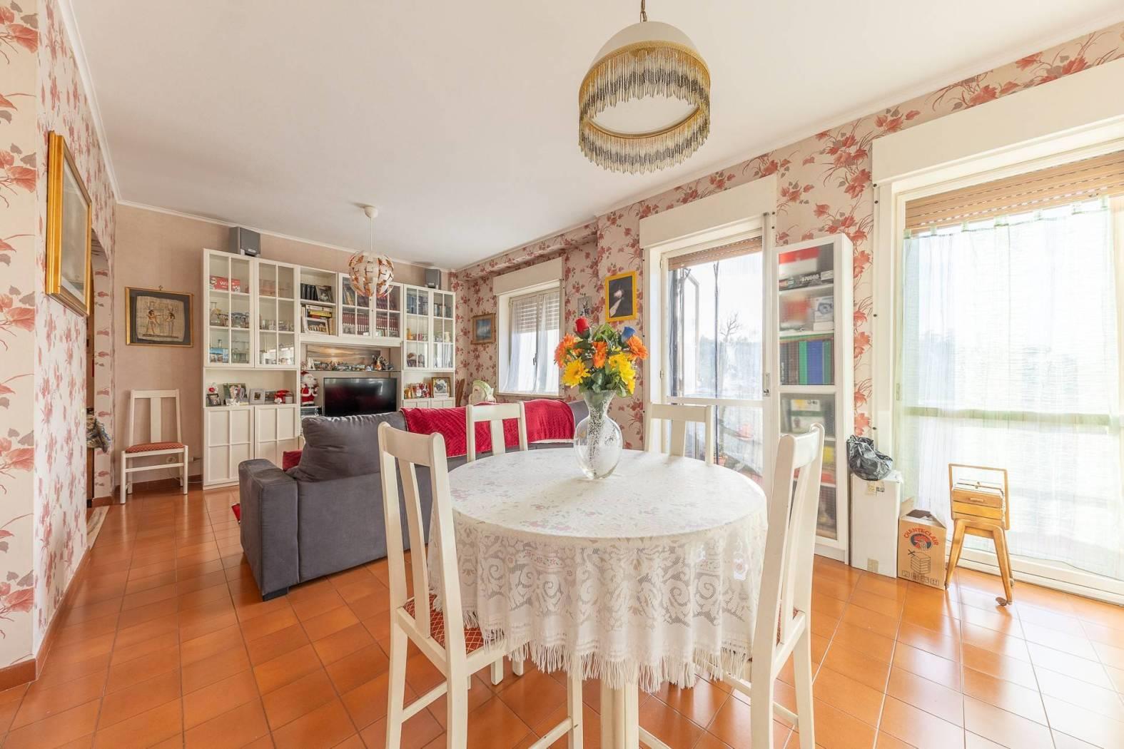 MENTANA. Ampio appartamento posto in zona tranquilla e con vista panoramica ed aperta sulla vallata. L'immobile è posto al terzo piano di una palazzina sprovvista di ascensore, ed è così composto: ampio ingresso, sala da pranzo con camino, cucina a vista e terrazzino, salone doppio con affaccio su un ulteriore balcone panoramico, corridoio con piccolo soppalco per accedere alla zona notte ove troviamo due camere matrimoniali, doppi servizi e ripostiglio. Nell'appartamento è possibile ricavare una terza camera da letto e quindi trasformare l'immobile in quadrilocale (come era in precedenza). A completare il tutto, un posto auto scoperto, cantina e box di 16 mq.