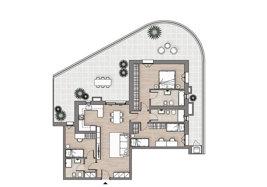 Questo quadrilocale a piano terra nel nuovo complesso Terrazze Talenti si distingue per la sua distribuzione intelligente degli spazi e la connessione diretta con l’ampia terrazza esterna che circonda l'intero appartamento, ideale per momenti di relax o cene all’aperto.