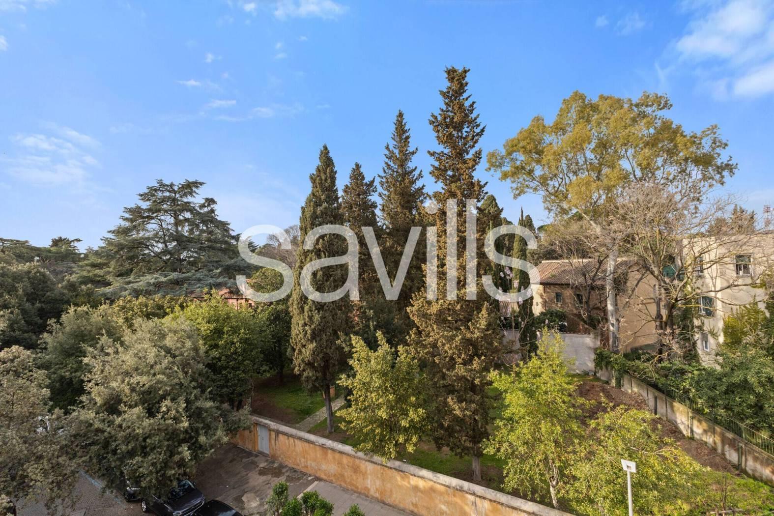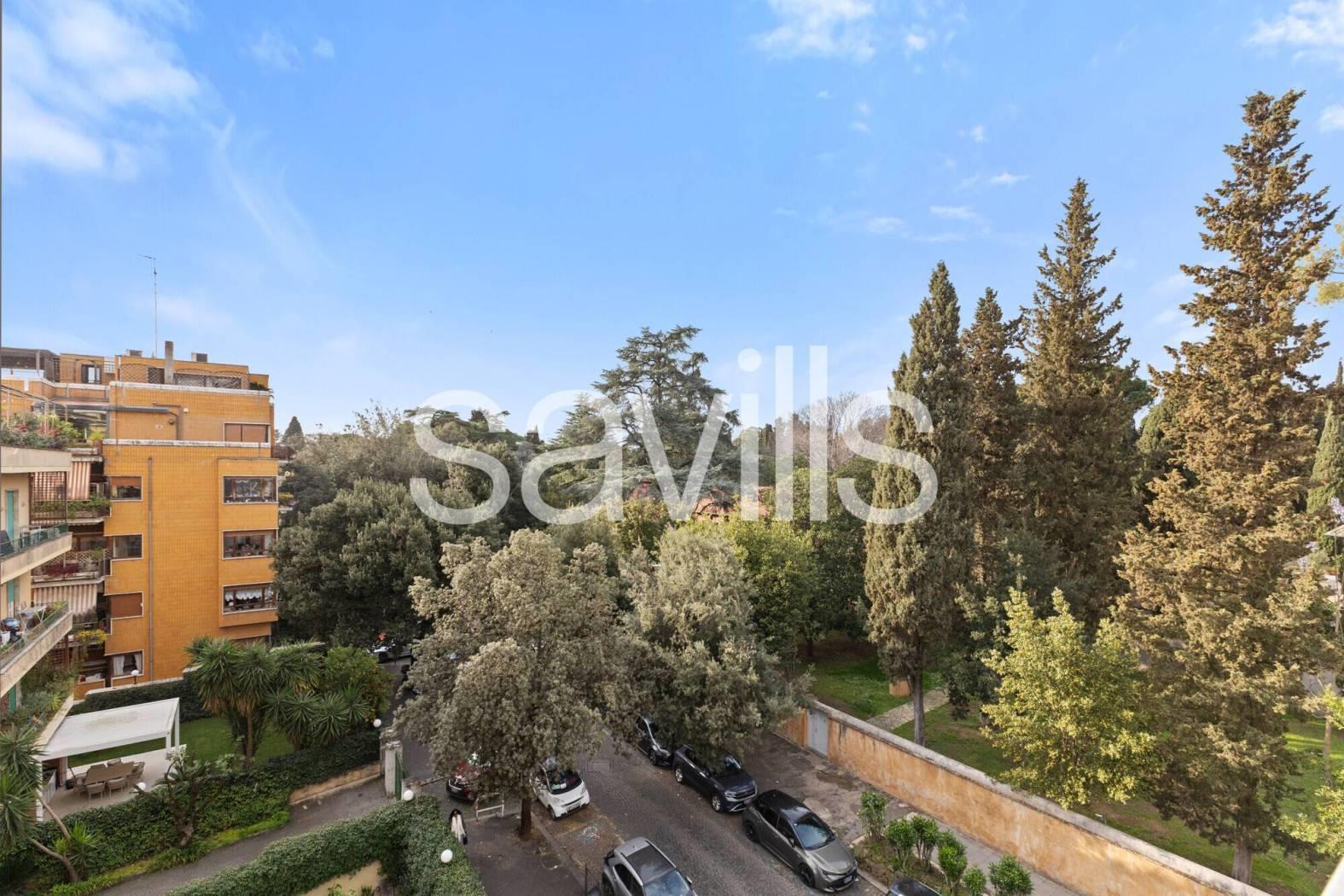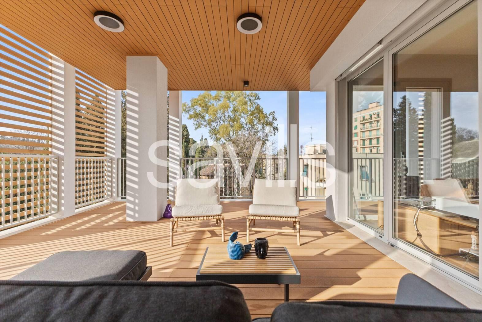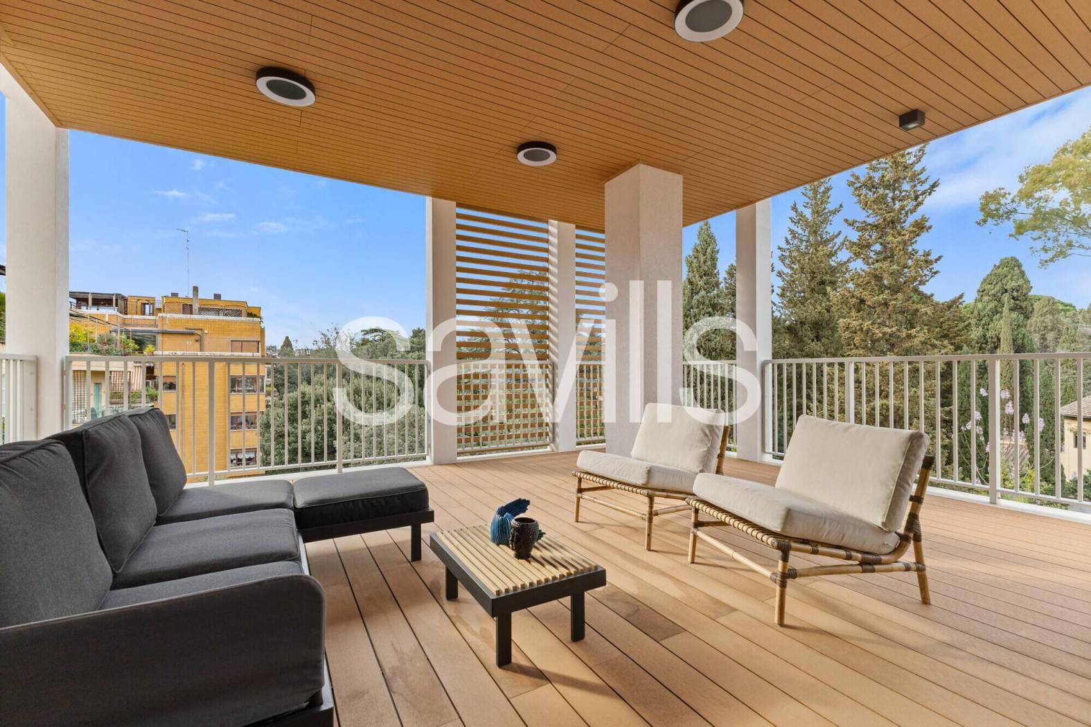Fulcro della casa è un ampio salone di rappresentanza che si apre su una magnifica terrazza con affaccio diretto sul parco dell’Accademia Tedesca, regalando una vista verde e un’atmosfera di grande quiete.