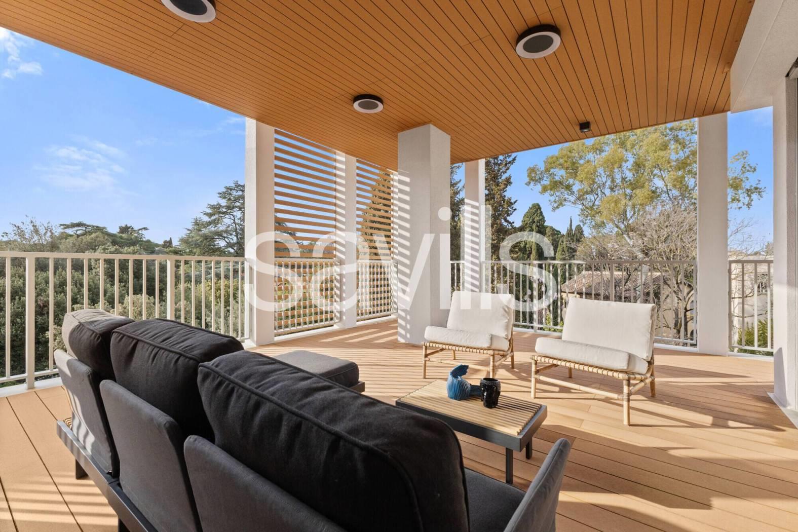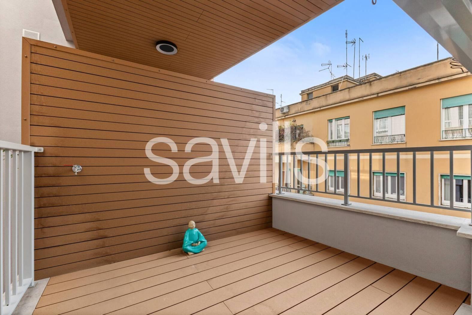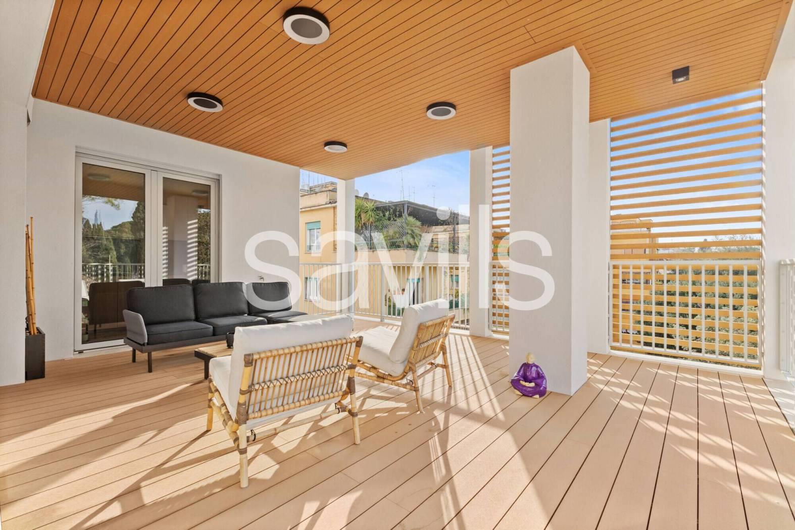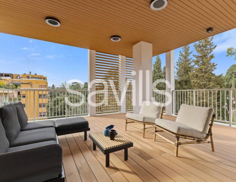 Fulcro della casa è un ampio salone di rappresentanza che si apre su una magnifica terrazza con affaccio diretto sul parco dell’Accademia Tedesca, regalando una vista verde e un’atmosfera di grande quiete.
