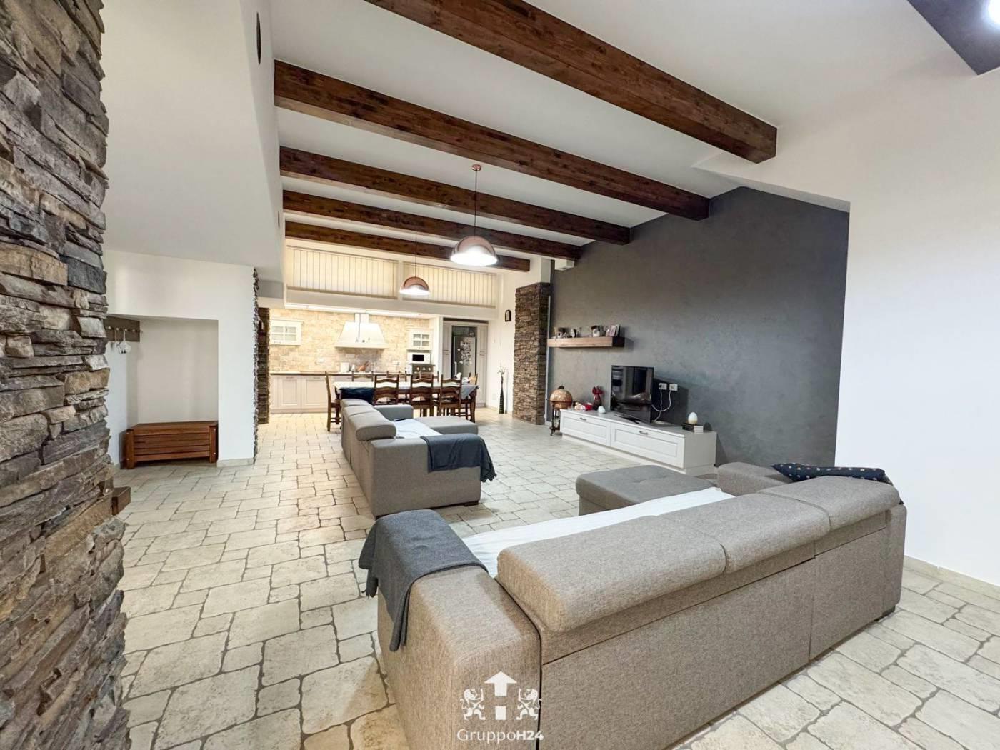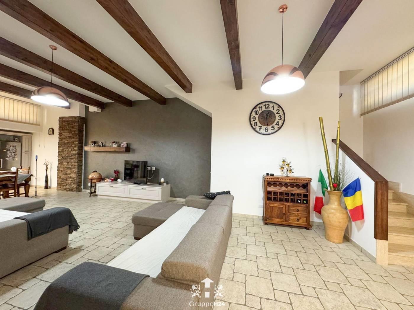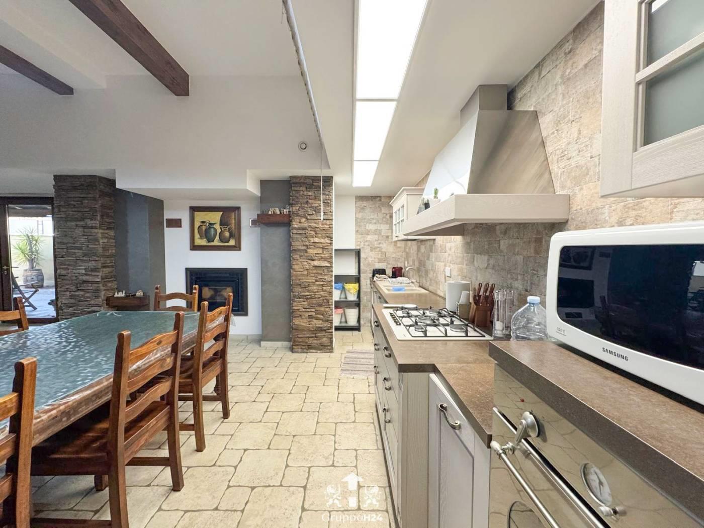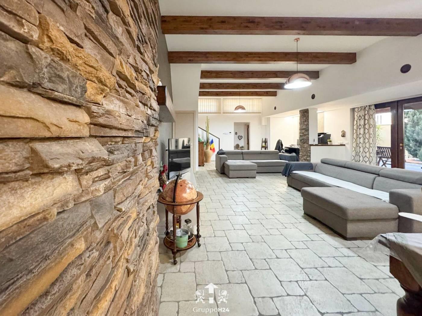 Al piano terra (seminterrato ma completamente sbancato) troviamo un ampio e curato salone openspace, ambiente caldo e accogliente impreziosito da una stufa a pellet con canna fumaria collegata al tetto, travi in legno a vista, pavimentazione in cotto e rivestimenti in pietra su alcune pareti che donano carattere e personalità agli spazi. La cucina è ampia e ben integrata nella zona giorno. Completa il livello un elegante bagno con doccia in marmo. Dalla zona living si accede direttamente al giardino privato di circa 100 mq, uno spazio esterno vivibile e ben organizzato, dotato di patio in legno e barbecue in muratura, anche quest'ultimo con canna fumaria collegata al tetto. Dal giardino si accede inoltre alla lavanderia con bagno. Il piano è arricchito anche da un comodo sottoscala adibito a ripostiglio.