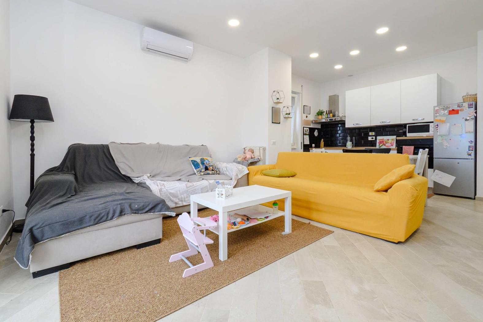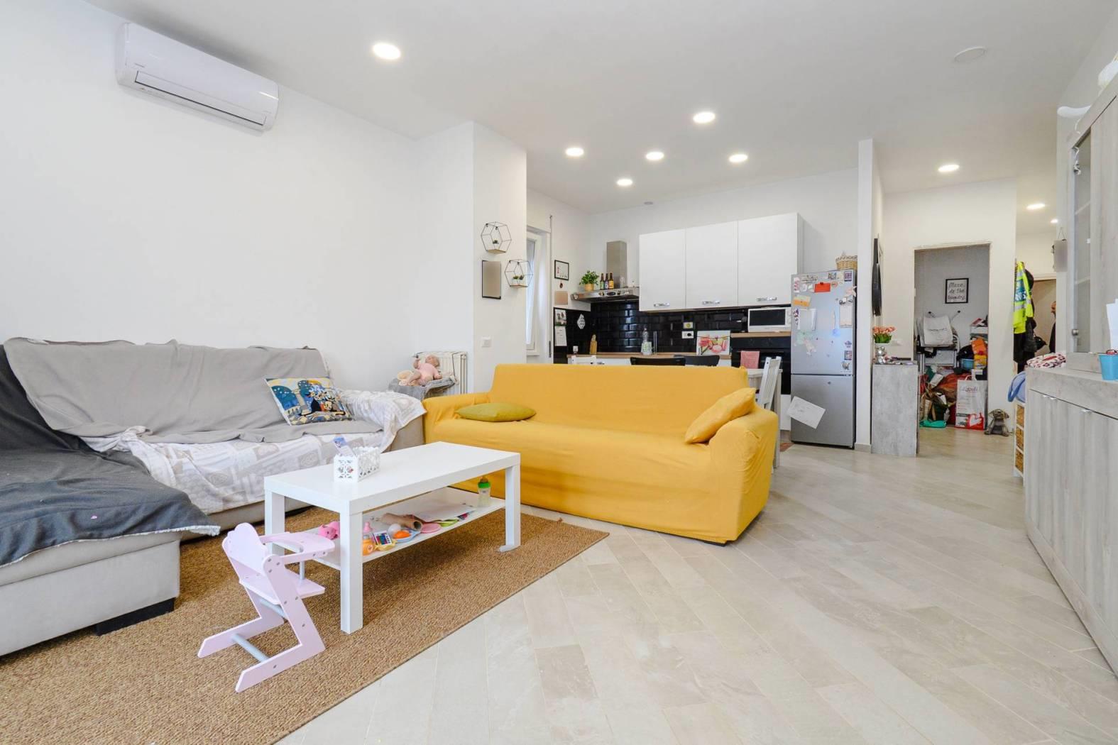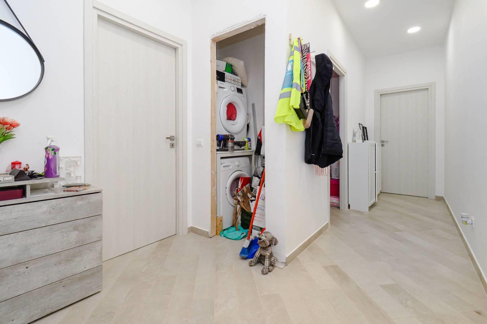 Internamente si compone da ingresso, spazioso living con cucina a vista, disimpegno con ripostiglio attrezzato come lavanderia, camera matrimoniale, seconda camera da letto, bagno con finestra ed impianto doccia, due balconi.
