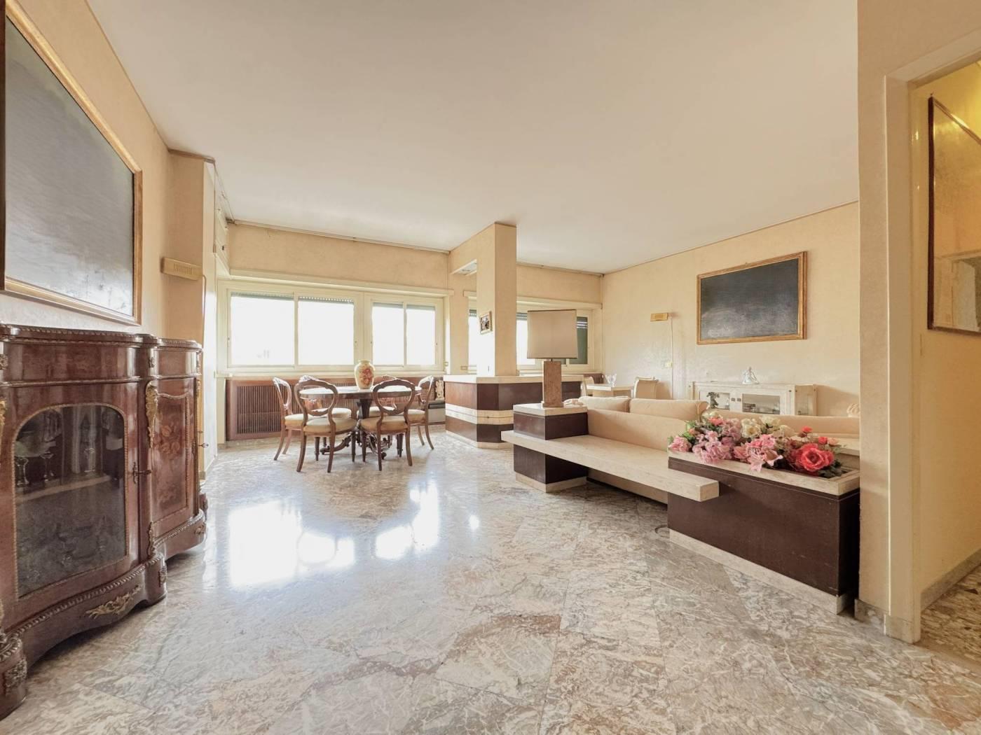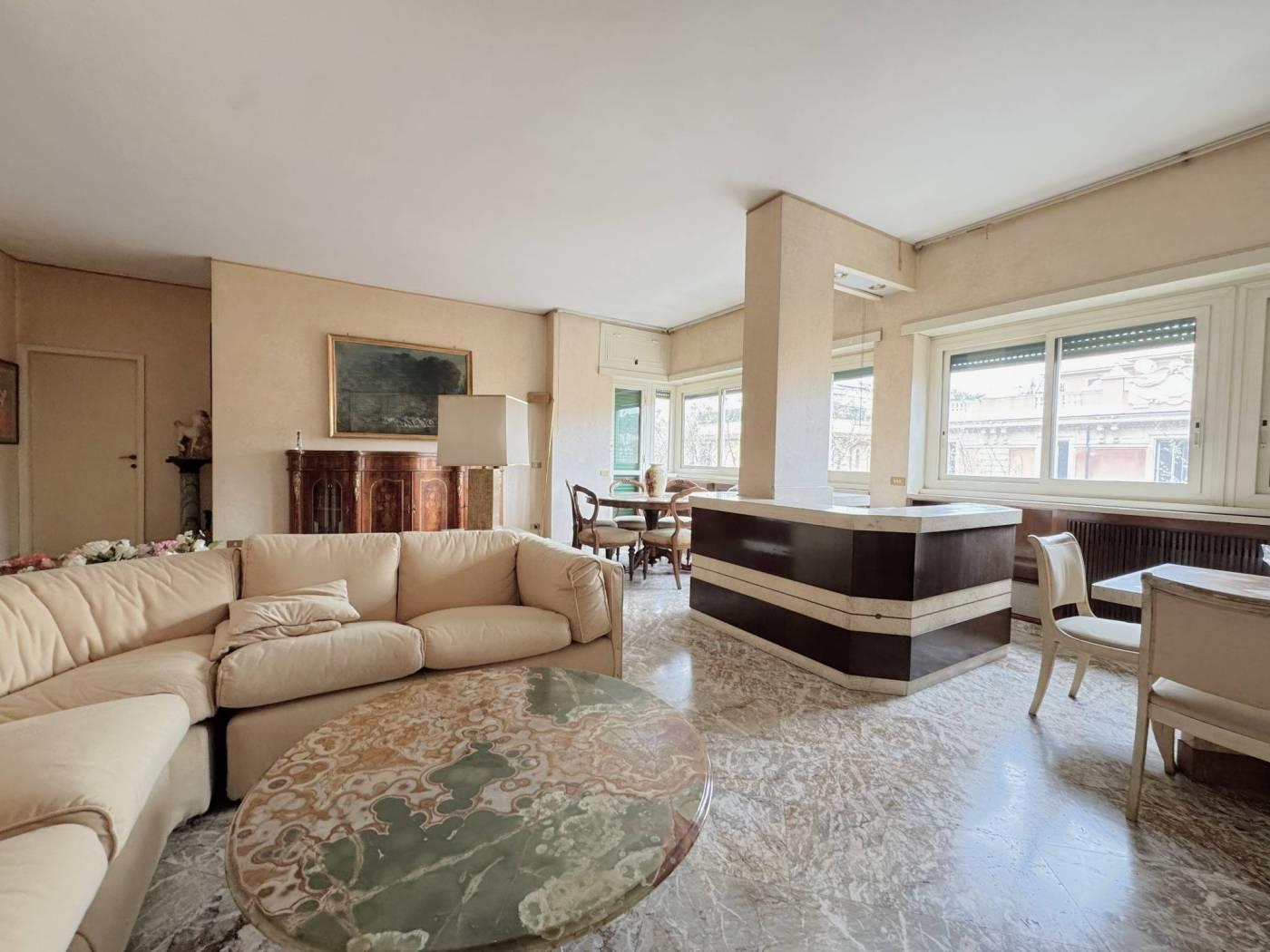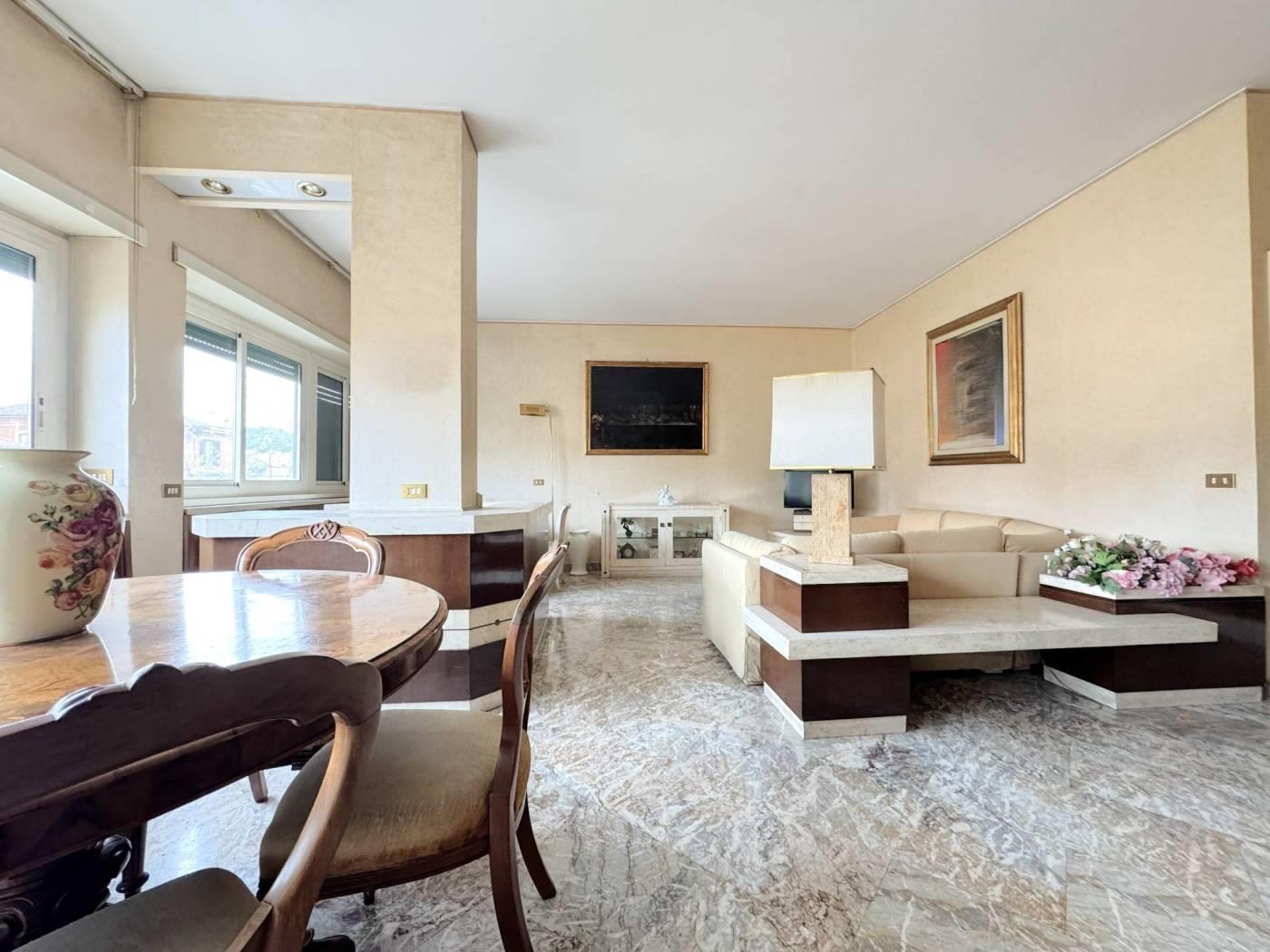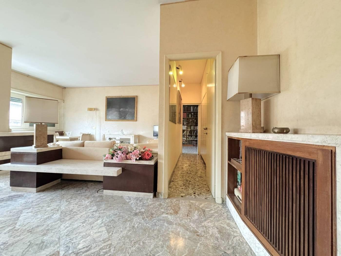 Elegante Appartamento in vendita - zona Esquilino. Nel cuore del rione Esquilino, a 300 metri dalla fermata metro Manzoni, e più precisamente in Via Santa Croce in Gerusalemme proponiamo in vendita un appartamento termoautonomo, posto al 3° piano di un palazzo di tipo medio signorile, edificato alla fine degli anni 50,rifinito in intonaco e provvisto di ascensore. L'immobile vanta una superficie di 153 mq catastali e si compone di un ampio ingresso, che introduce direttamente nella zona giorno in cui troviamo, un salone doppio di 40 mq caratterizzato da una parete totalmente finestrata e una grande camera adibita a studio. Dall' ingresso si accede anche ad un corridoio di disimpegno che permette di raggiungere due camere matrimoniali, una grande cucina abitabile, un bagno padronale di dimensioni generose dotato di una vasca e una camera di servizio con wc ad uso esclusivo. Completano la proprietà 3 balconi di cui due con piacevole affaccio esterno sulla via, aventi accesso dallo studio e dal salone/camera, il terzo a servizio della cucina con affaccio nella corte interna. L'appartamento risulta molto luminoso, si presenta in discreto stato complessivo, ed è dotato di porta d'ingresso blindata, infissi a taglio termico con doppio vetro, serrande elettriche nel salone, inferriate di sicurezza a protezione delle finestre che affacciano sulla corte interna, impianto di riscaldamento e produzione dell' acqua calda autonomo con caldaia recentemente sostituita, pavimentazione rivestita in pregevole marmo nella zona di rappresentanza e svariate opere di falegnameria realizzate su misura. La proprietà gode di una doppia esposizione: il salone e tutte le camere più grandi affacciano verso est con una piacevole veduta aperta sui villini di Via Santa Croce in Gerusalemme, la cucina e i servizi espongono verso ovest in una corte interna. Sono stati deliberati lavori di ristrutturazione riguardanti tutte le facciate del fabbricato, il cui costo verrà totalmente saldato dal venditore.